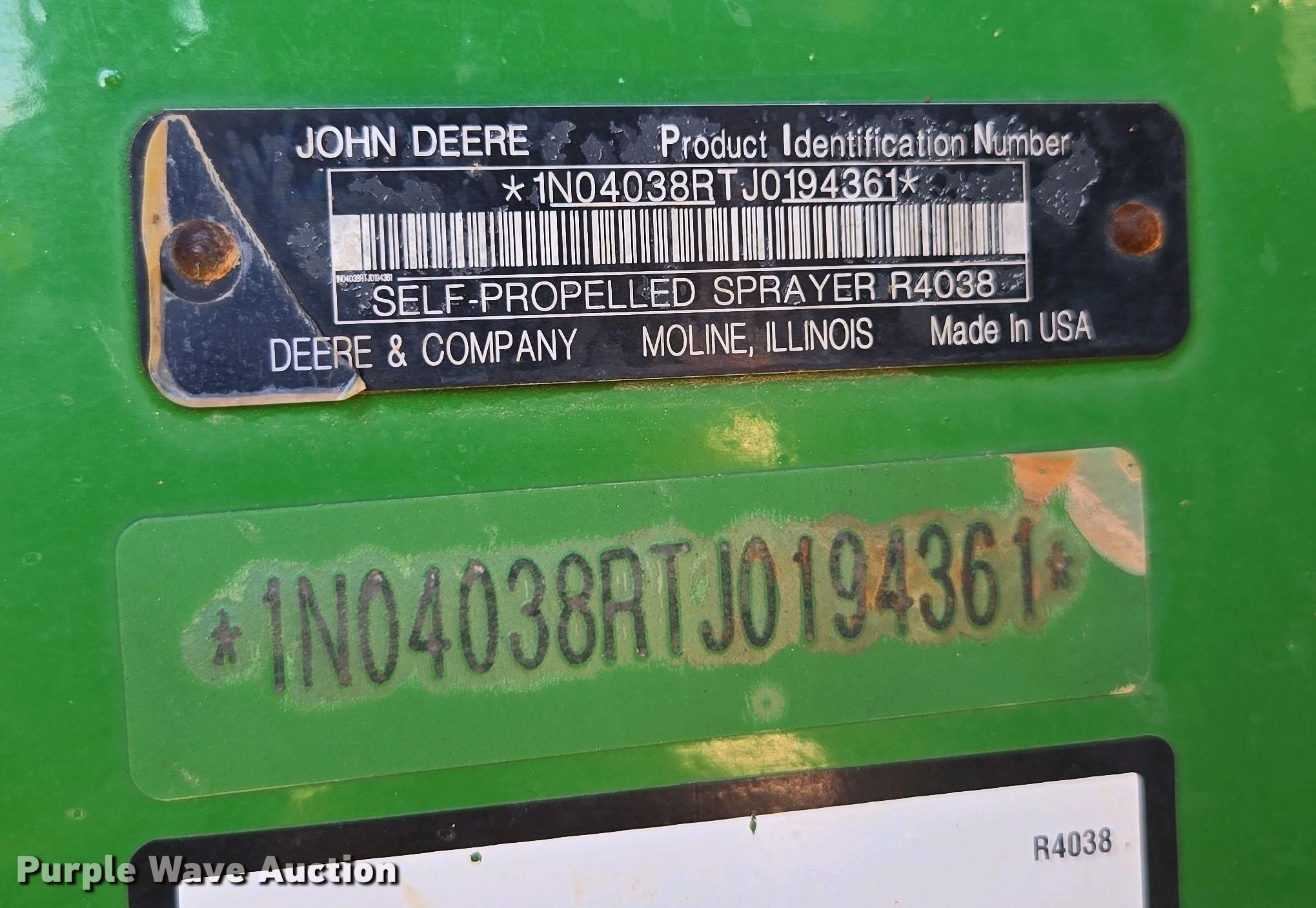 Purple Wave is selling a used Applicator Self Propelled in Alabama. This item is a 2018 John Deere R4038 sprayer with the following: Engine hours: 2,359 on meter, Serial: 1N04038RTJ0194361
