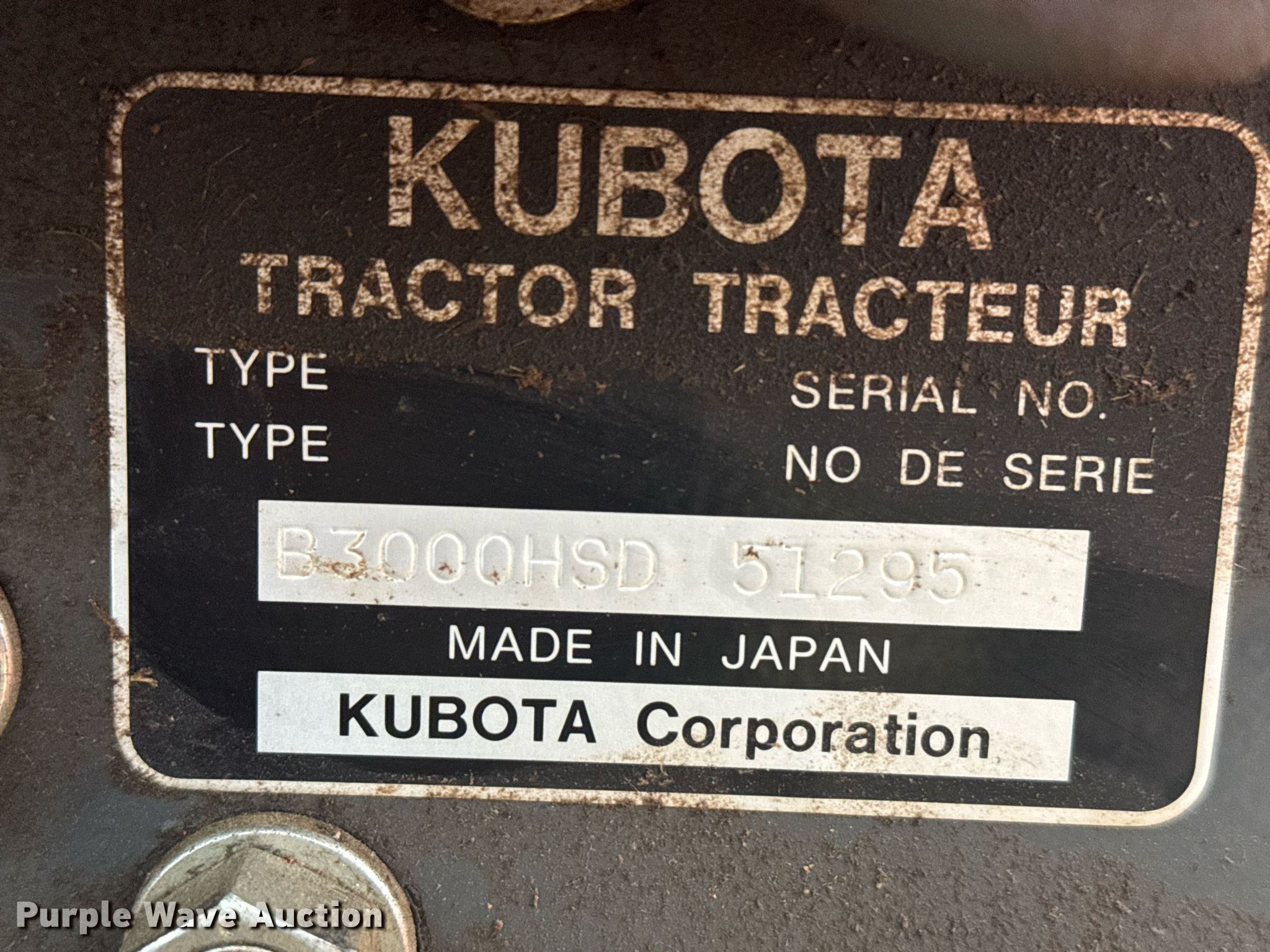 Purple Wave is selling a used Tractor in Kansas. This item is a 2012 Kubota B3000HSD MFWD tractor with the following: Hours: 318 on meter, Serial: 51295