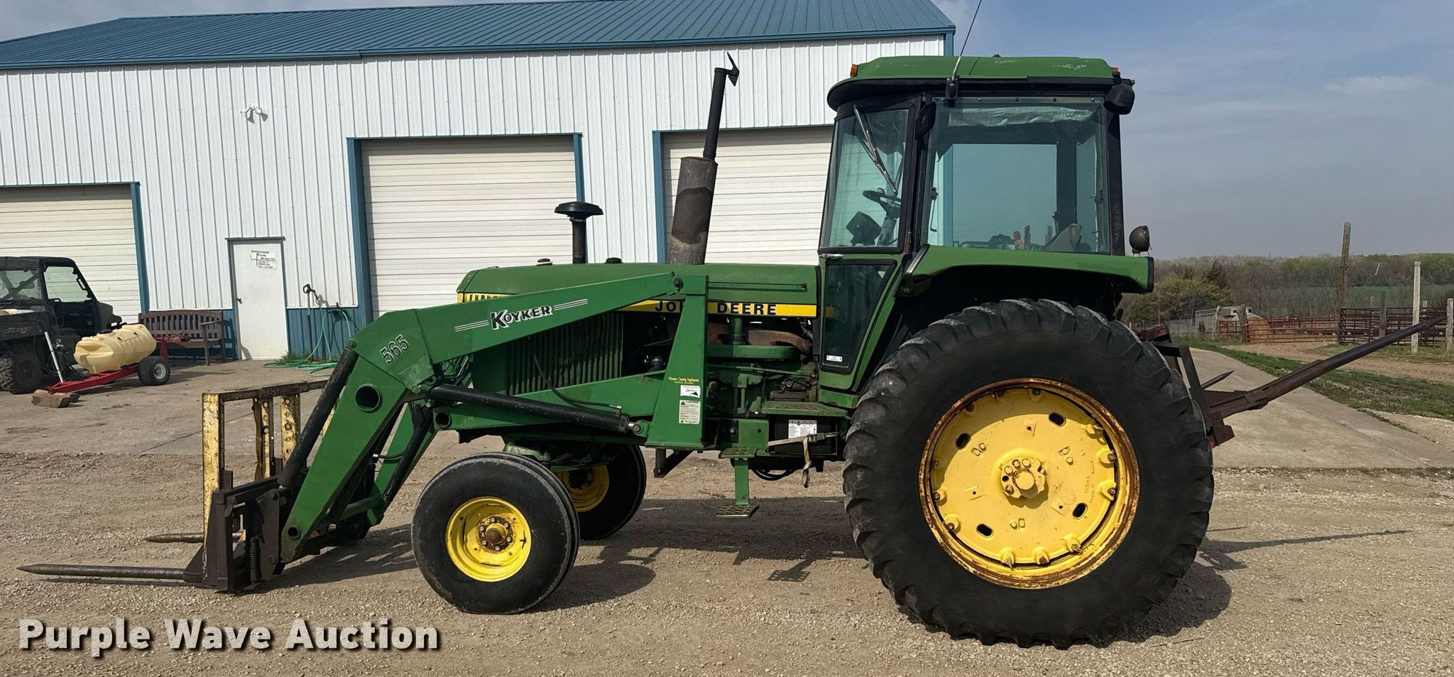1981 John Deere 4240 tractor. Hours: 6,279 on meter, Miles or hours may vary, unit still in use, Serial: 22701. Engine John Deere, Displacement: 7.6L, Cylinders: 6, Fuel type: Diesel. Transmission Powershift, 8F - 4R, Differential lock. Operators station AC, Heat. Features PTO: 540, 1000, Three point Top link, Hydraulic remote sets Rear: 2, Loader ready, Loader Koyker 565, Bale spear, Controls: Joystick. Tires Front: 10.00-16, Rear: 480/80R38. Notes Three point bale spear not included, Monitor not included. Shelby Farms. Bavaria, KS 67401