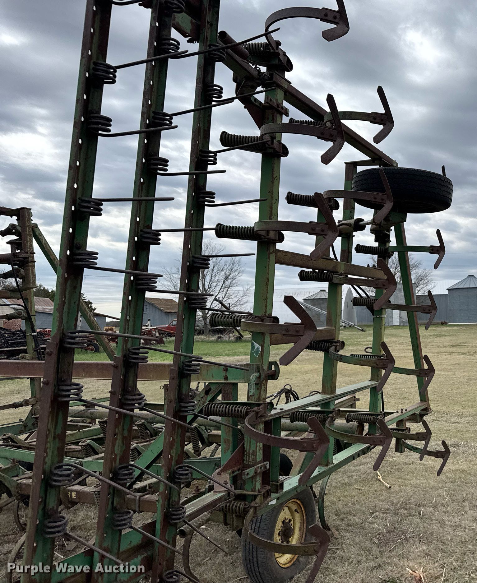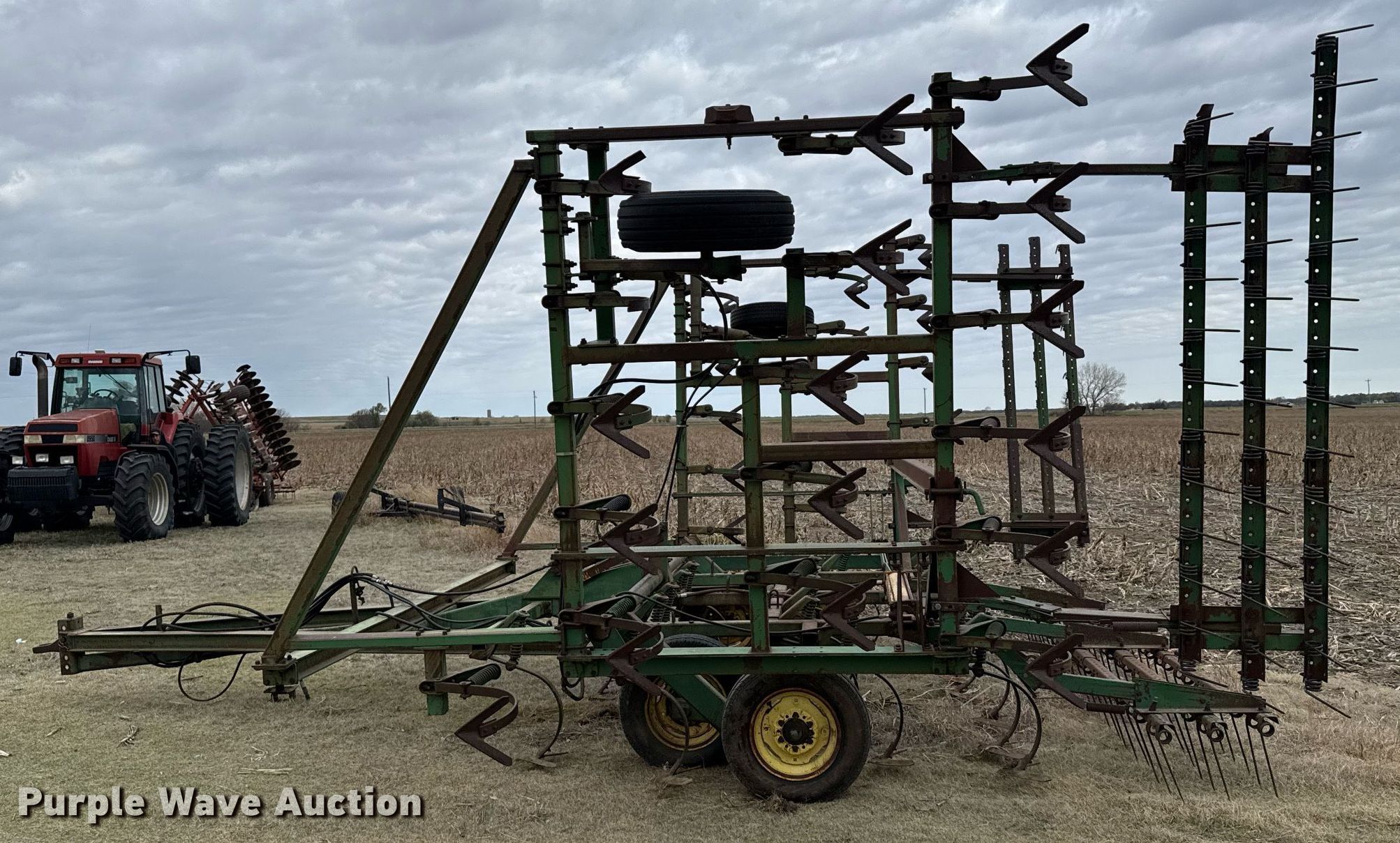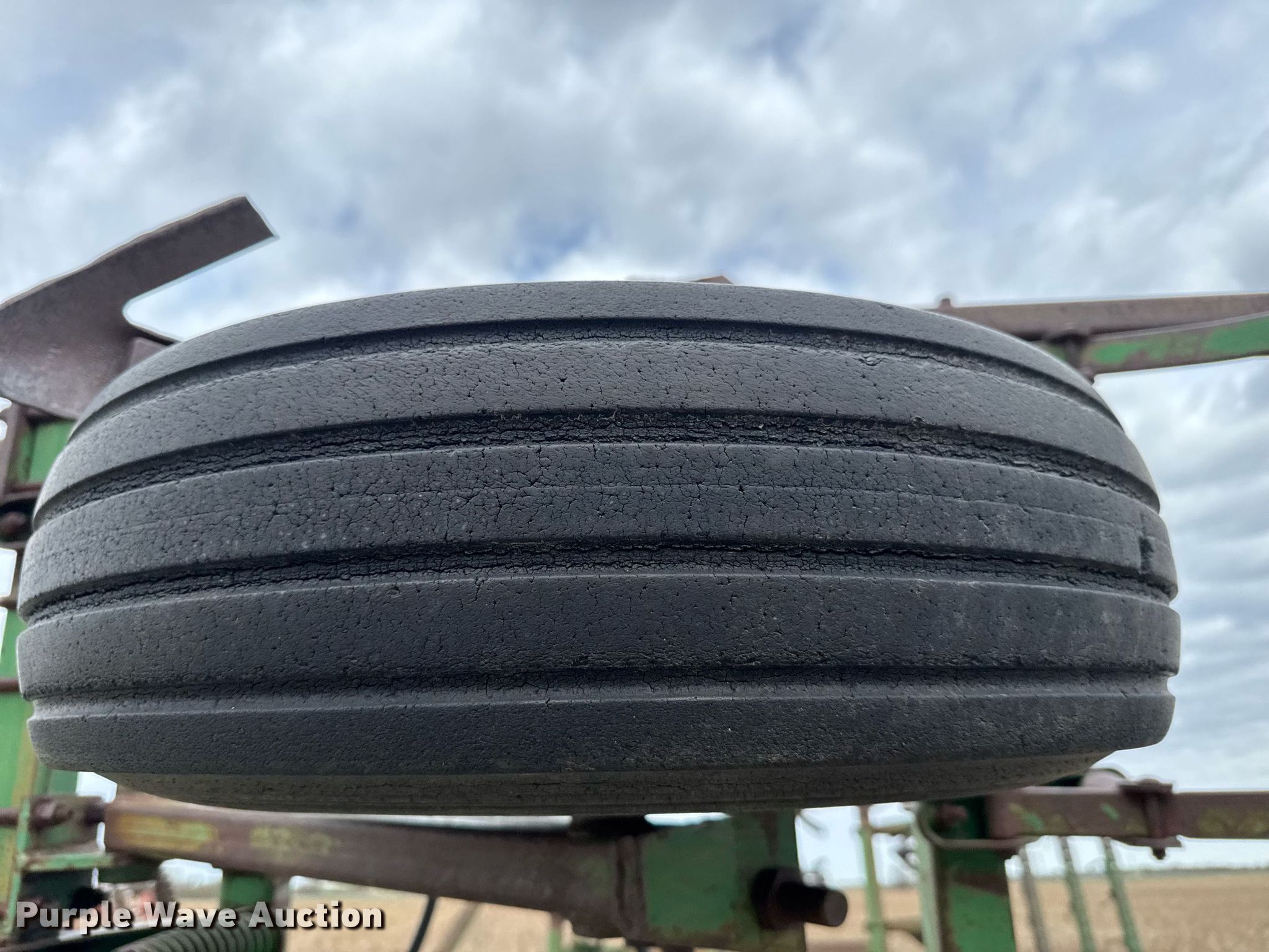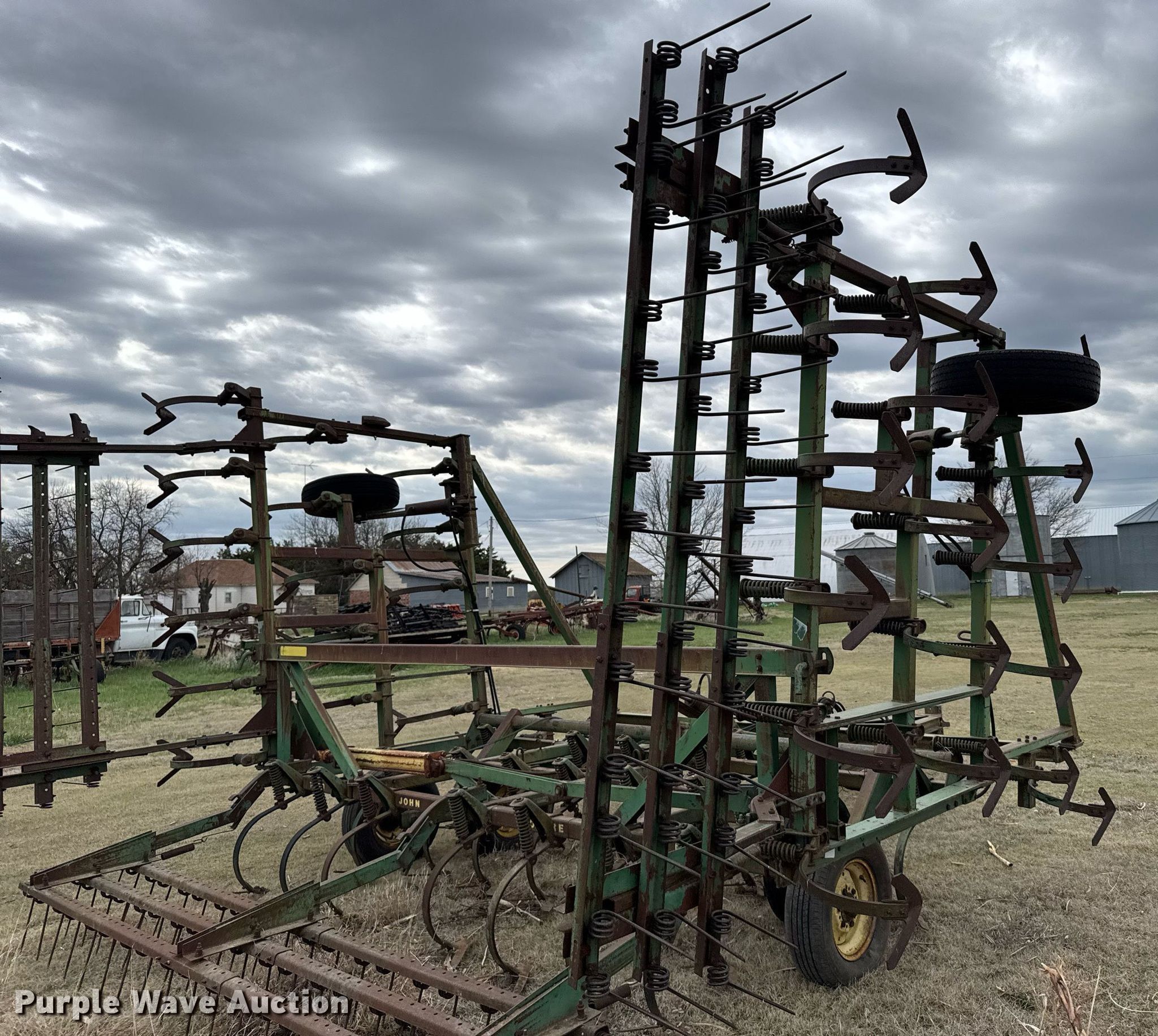 John Deere 1000 field cultivator. Overall width: 26'. Features Shanks: 56, Sweep width: 12", Operation Hydraulic lift, Hydraulic fold, Leveler: Hydraulic, Walking tandem axle, Attachments Tine harrow Harrow bars: 3.. Tires Tire size: 205/75R15, Gauge wheels Size: 205/75R15. Albert, KS 67511
