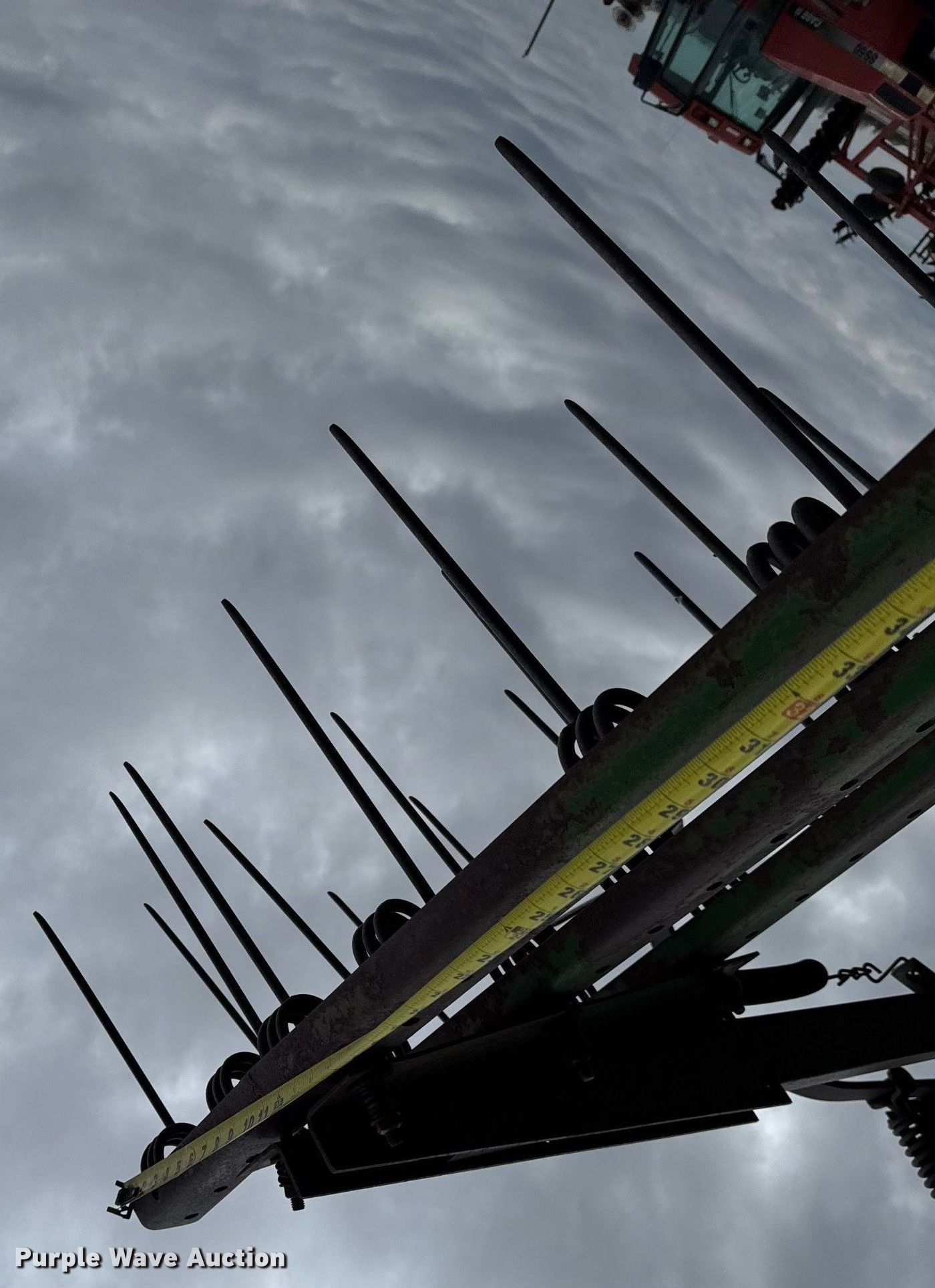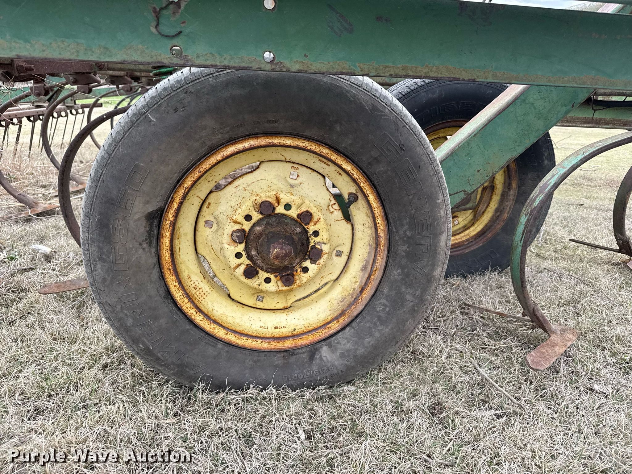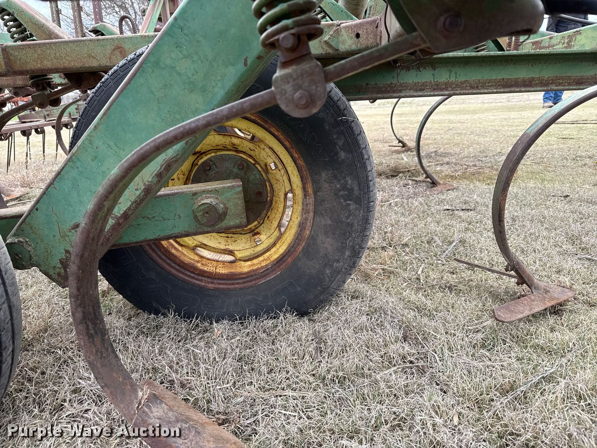 John Deere 1000 field cultivator. Overall width: 26'. Features Shanks: 56, Sweep width: 12", Operation Hydraulic lift, Hydraulic fold, Leveler: Hydraulic, Walking tandem axle, Attachments Tine harrow Harrow bars: 3.. Tires Tire size: 205/75R15, Gauge wheels Size: 205/75R15. Albert, KS 67511