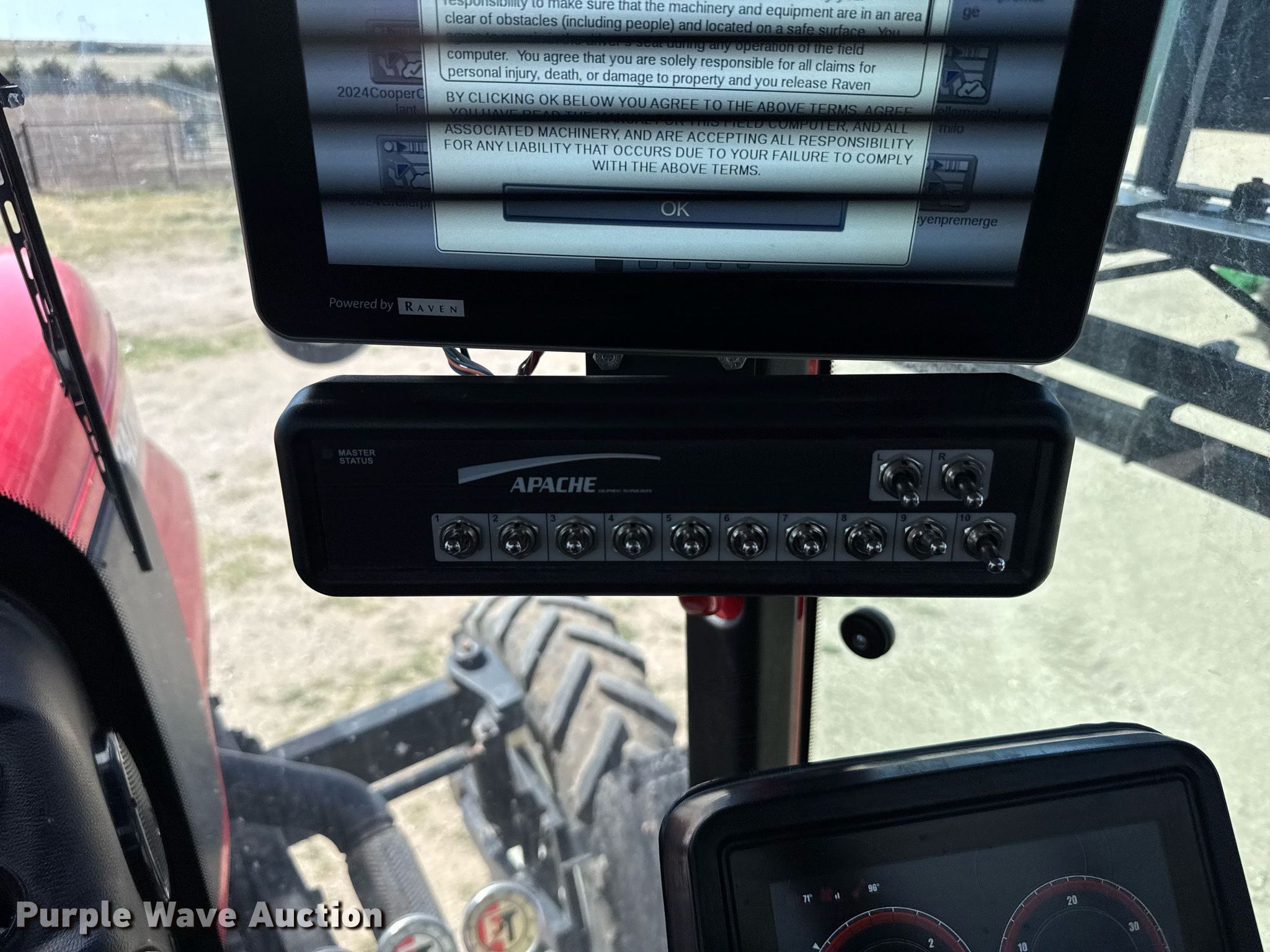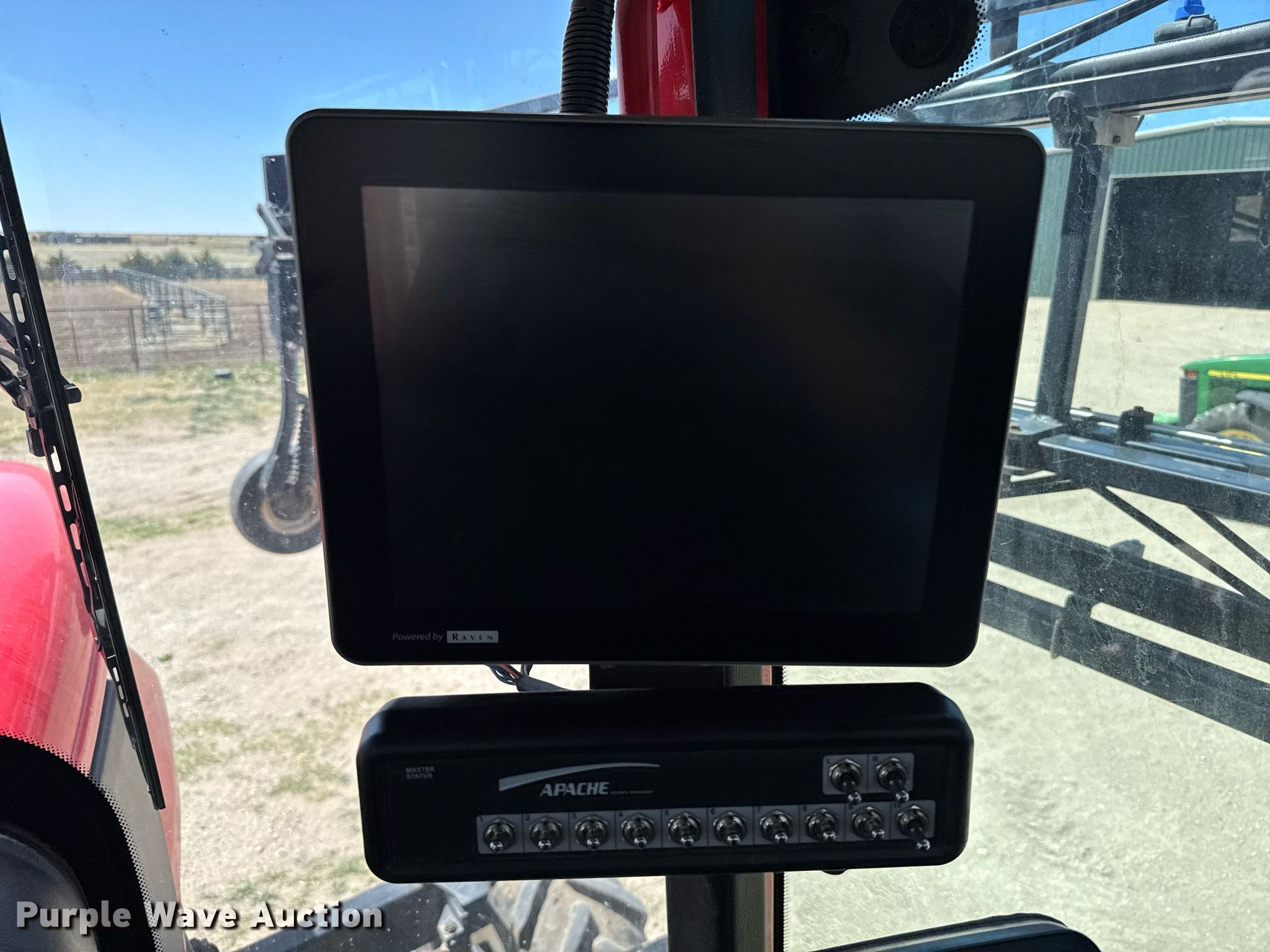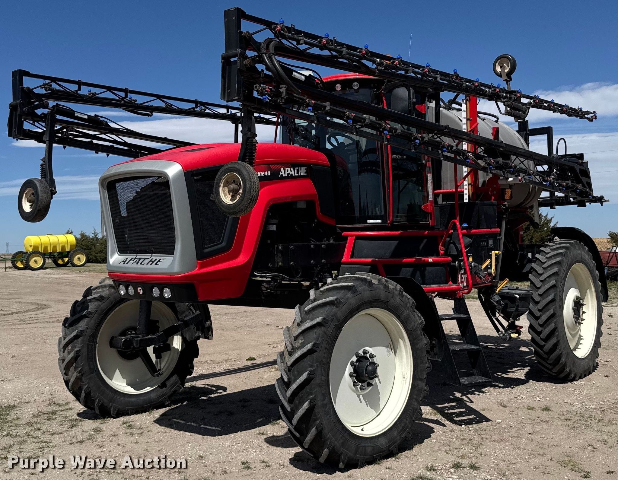 2019 Apache AS1240 sprayer. Engine hours: 1,865 on meter, Serial: 9190298. Engine Cummins, Displacement: 6.7L, Cylinders: 6, Fuel type: Diesel. Transmission Powershift, 6F - 3R. Operators station AC, Heat, Rotary beacon. Features Hydraulic ladder, Solution tank Capacity: 1,200 gallons, Type: Poly, Chemical eductor Type: Poly, Rinse tank Capacity: 100 gallons, Clean water tank, Boom Width: 100', Sections: 9, Boom breakaway, Hydraulic boom fold, Hydraulic height control, Automatic height control, Nozzle Spacing: 20", Nozzle bodies: 3-way, Fence row nozzles, Electronics Raven Viper 4, GPS monitor Raven viper 4, GPS receiver Raven viper 4, Spray controls Raven viper 4, Auto steer. Tires Front: 380/80/R38, Rear: 380/90R46, Row crop tires. M3 Farms. Oakley, KS 67748