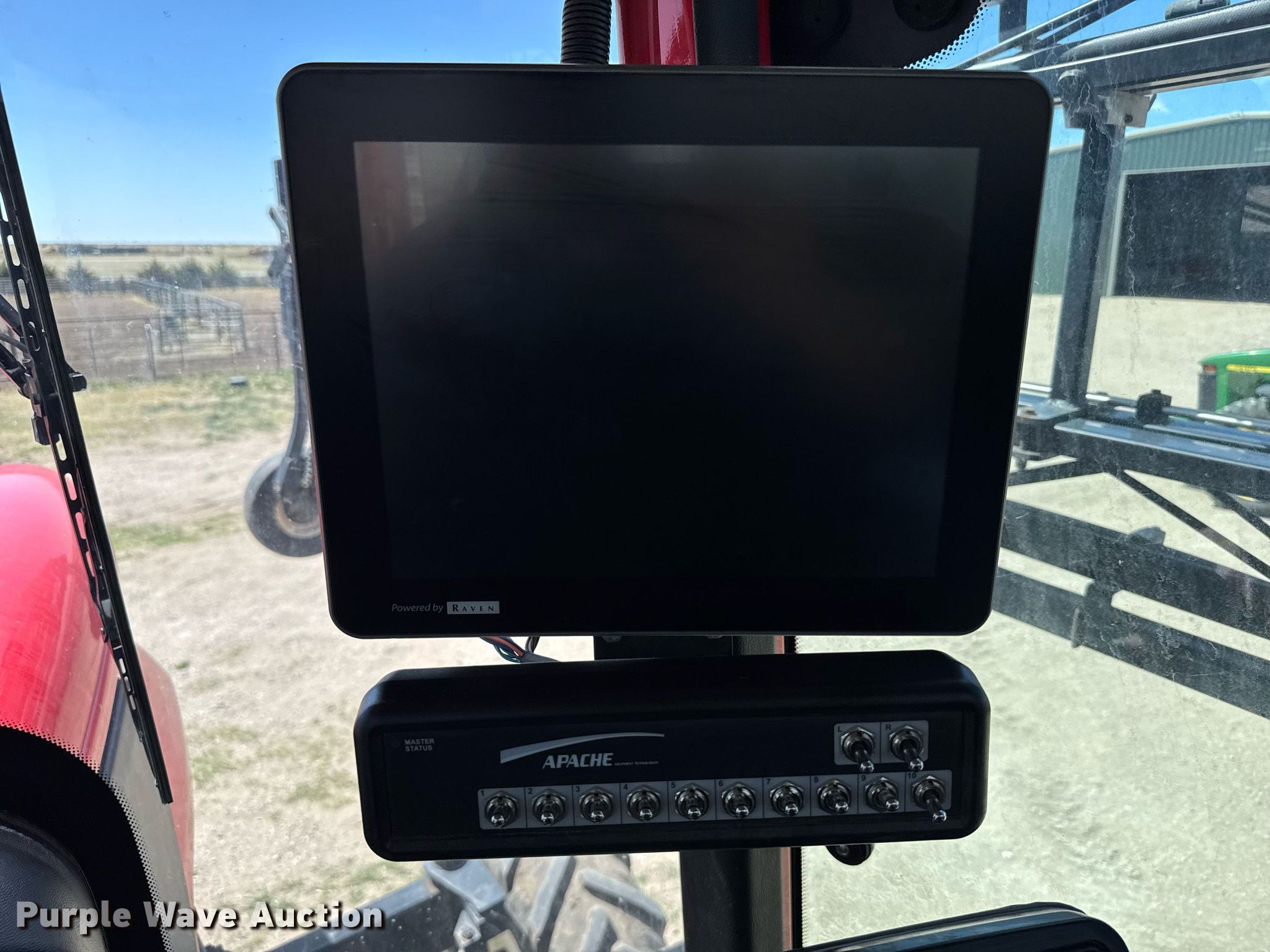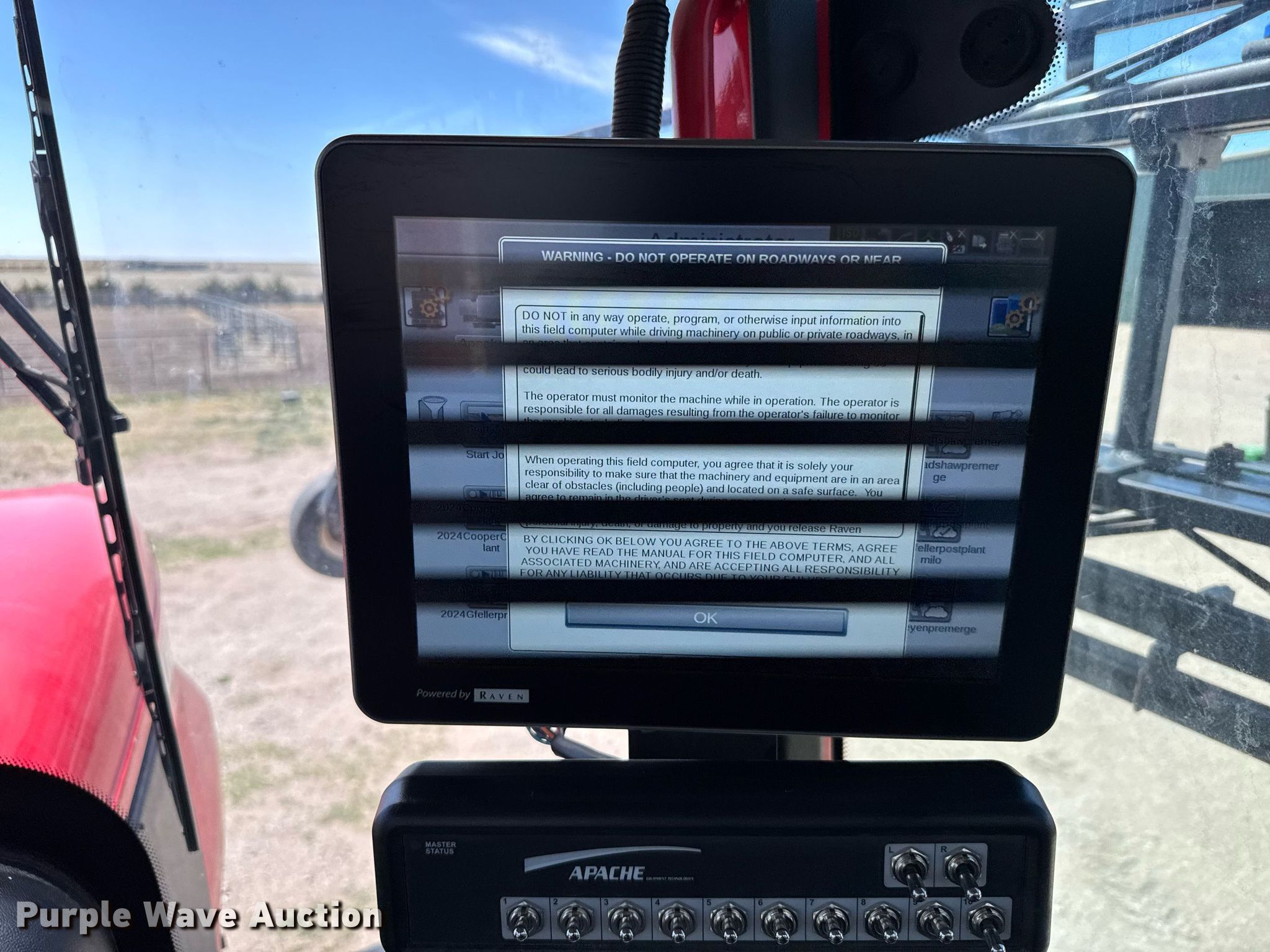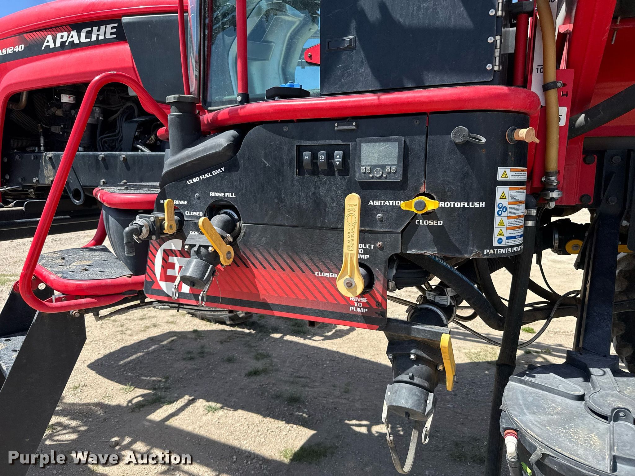 2019 Apache AS1240 sprayer. Engine hours: 1,865 on meter, Serial: 9190298. Engine Cummins, Displacement: 6.7L, Cylinders: 6, Fuel type: Diesel. Transmission Powershift, 6F - 3R. Operators station AC, Heat, Rotary beacon. Features Hydraulic ladder, Solution tank Capacity: 1,200 gallons, Type: Poly, Chemical eductor Type: Poly, Rinse tank Capacity: 100 gallons, Clean water tank, Boom Width: 100', Sections: 9, Boom breakaway, Hydraulic boom fold, Hydraulic height control, Automatic height control, Nozzle Spacing: 20", Nozzle bodies: 3-way, Fence row nozzles, Electronics Raven Viper 4, GPS monitor Raven viper 4, GPS receiver Raven viper 4, Spray controls Raven viper 4, Auto steer. Tires Front: 380/80/R38, Rear: 380/90R46, Row crop tires. M3 Farms. Oakley, KS 67748