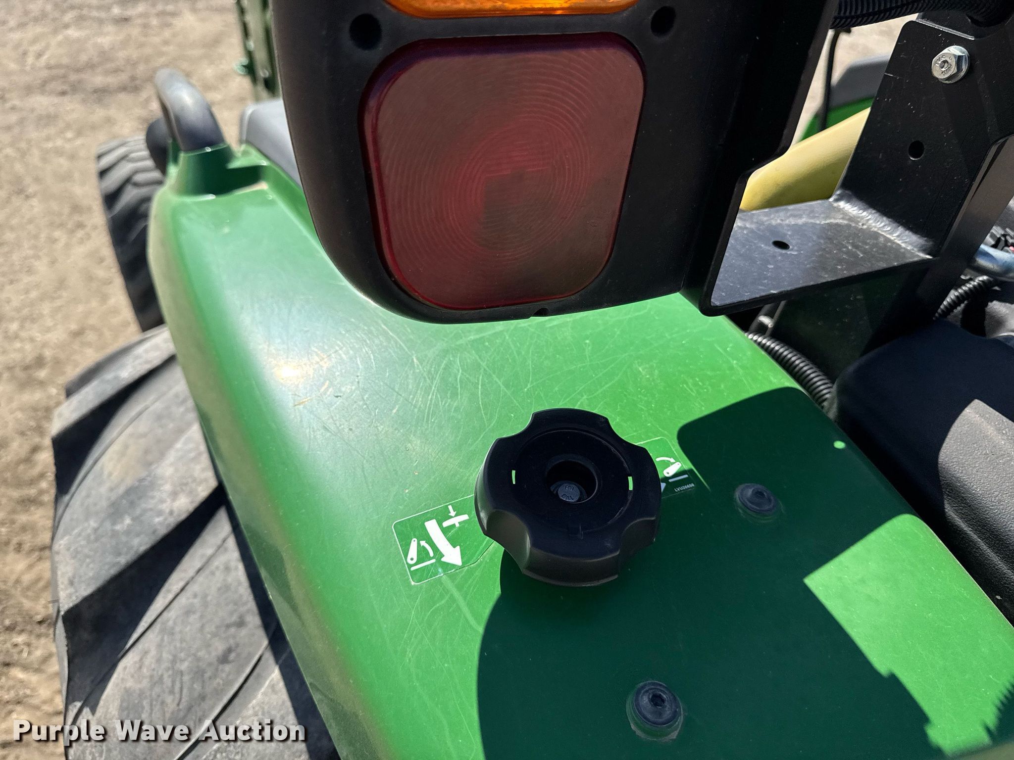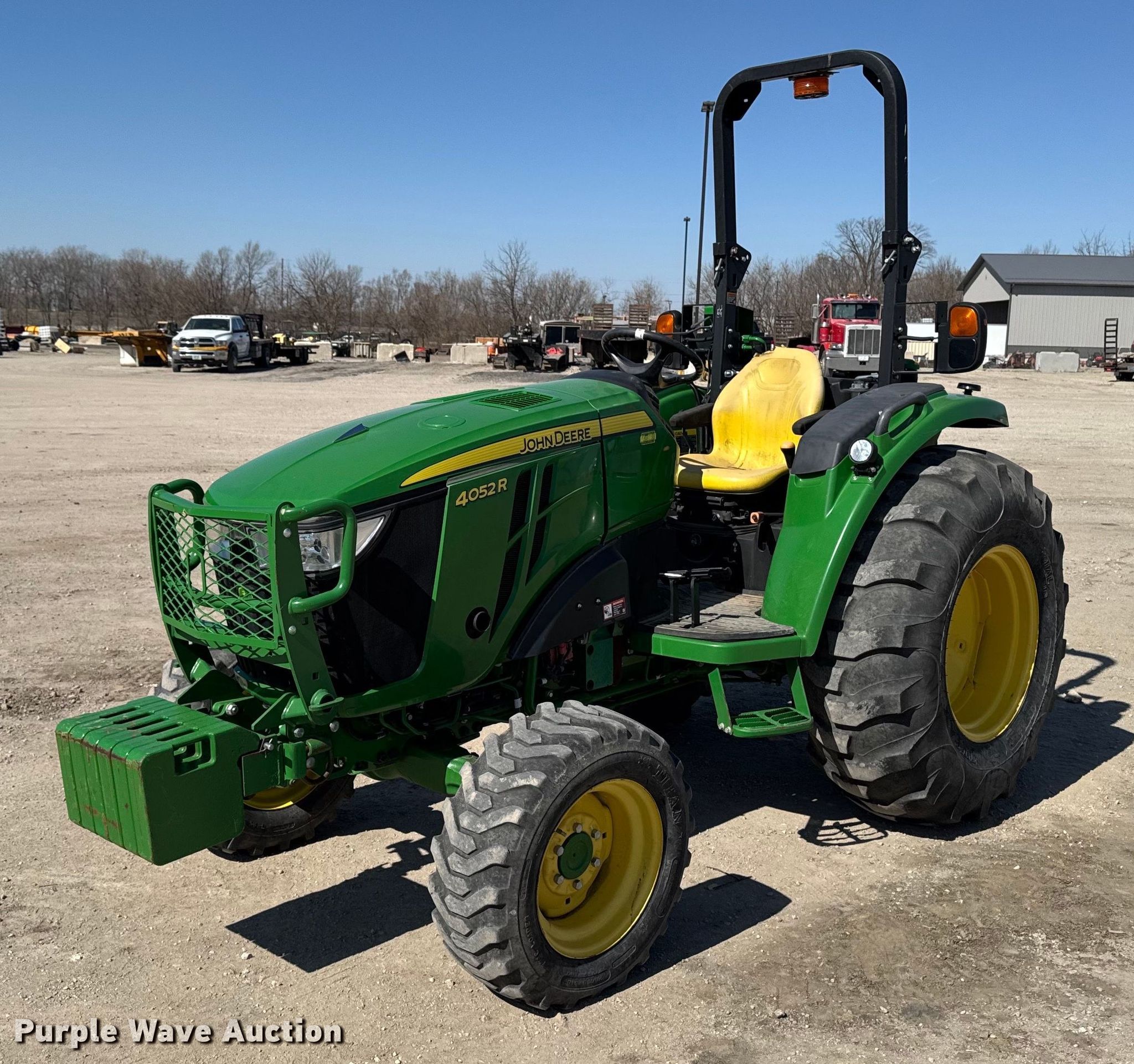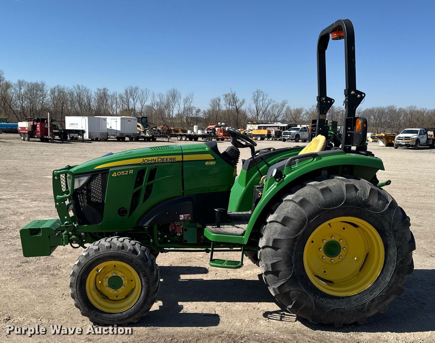 2019 John Deere 4052R MFWD tractor. Hours: 1,307 on meter, Serial: 1LV4052RHKK103017. Engine Yanmar 4RTMAC, Displacement: 2.091L, Cylinders: 4, Fuel type: Diesel. Transmission Hydrostatic, 3F - 3R, Differential lock. Features PTO: 540, Three point Top link, Hydraulic remote sets Front: 2, Rear: 2, Suitcase weights: 6. Tires Front: 260/70D16.5, Rear: 420/85D24. Notes PTO issues. Absolute Group Company. Granger, IA 50109