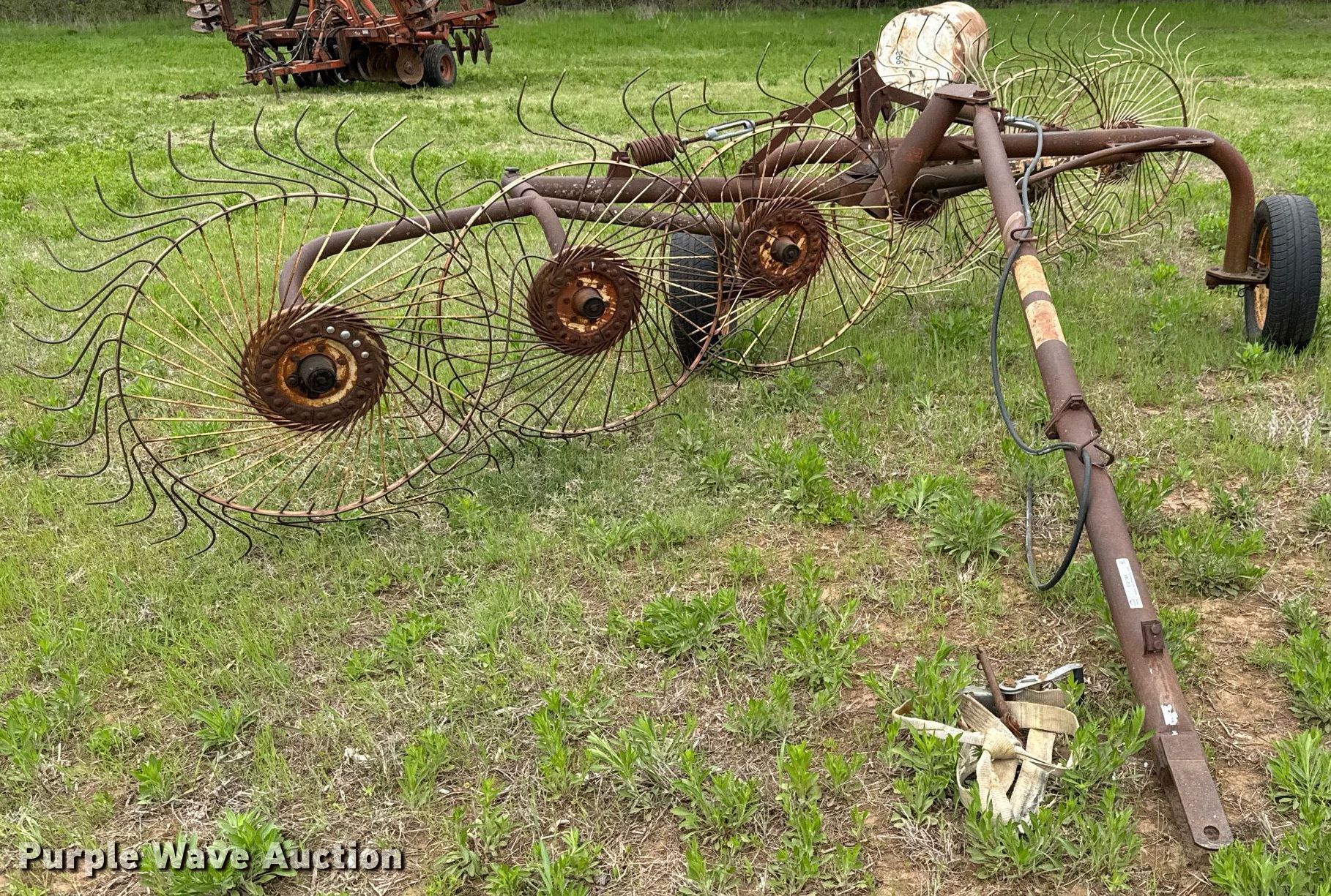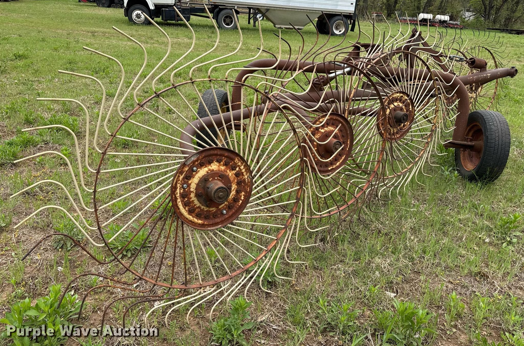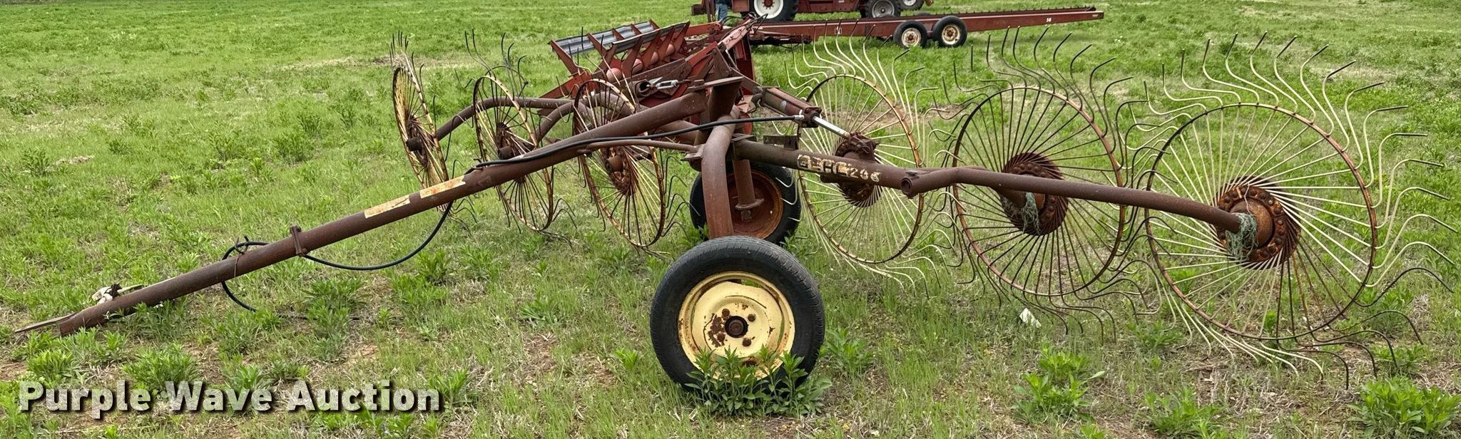 Purple Wave is selling a used Hay Rake in Kansas. This item is a Gehl 206 hay rake with the following: Width: 10', Wheels: 6, Diameter: 52"