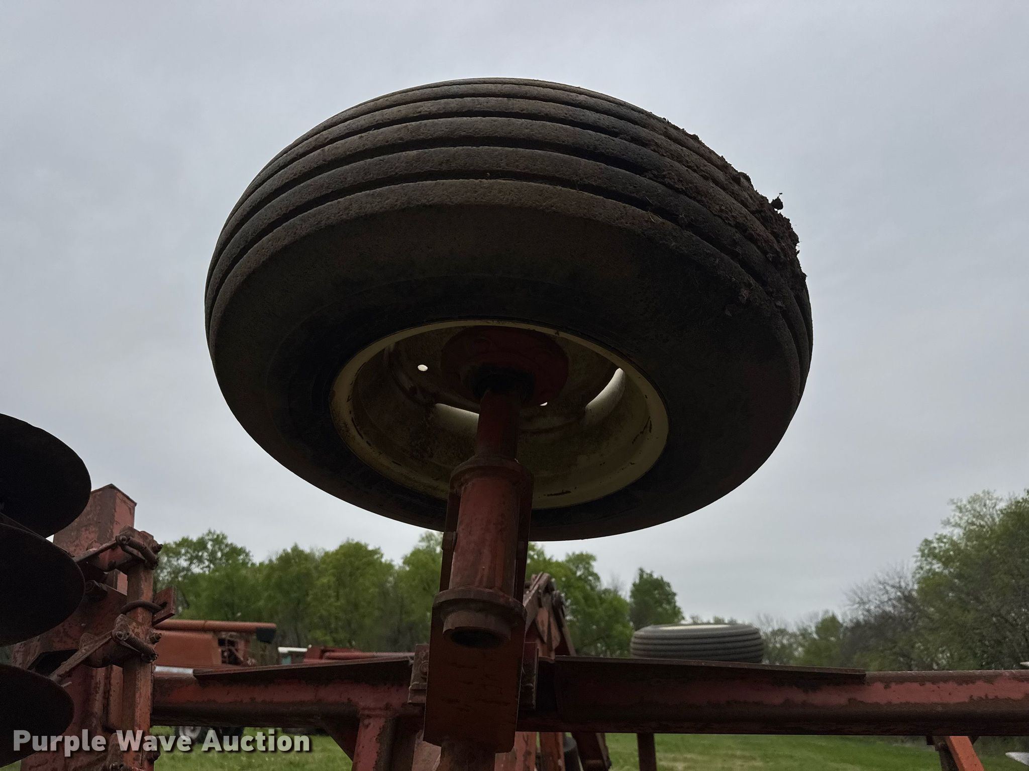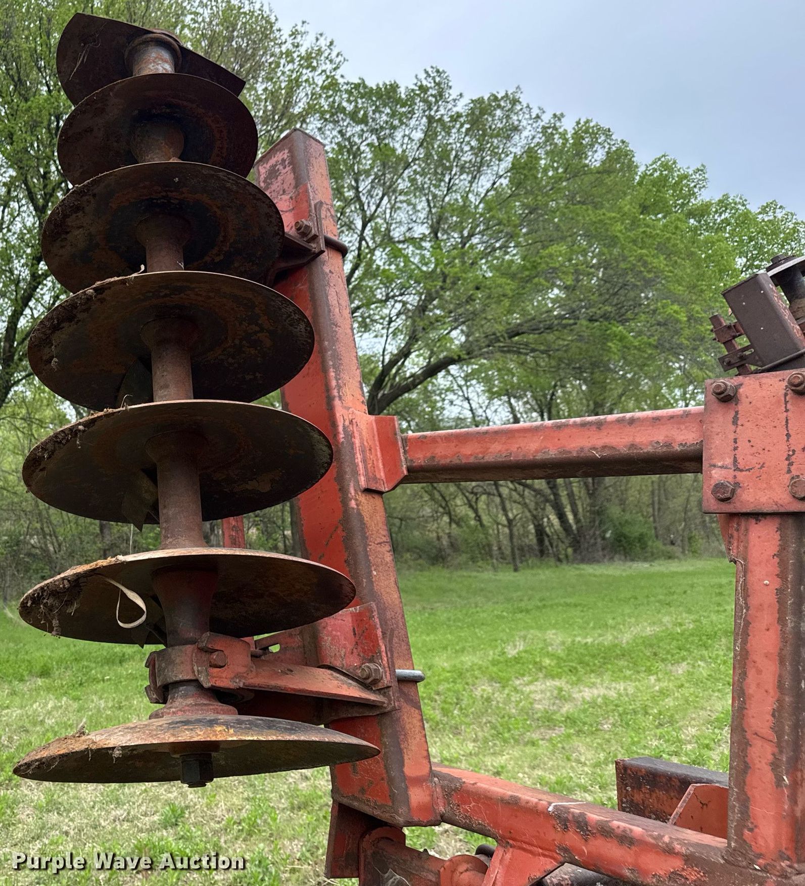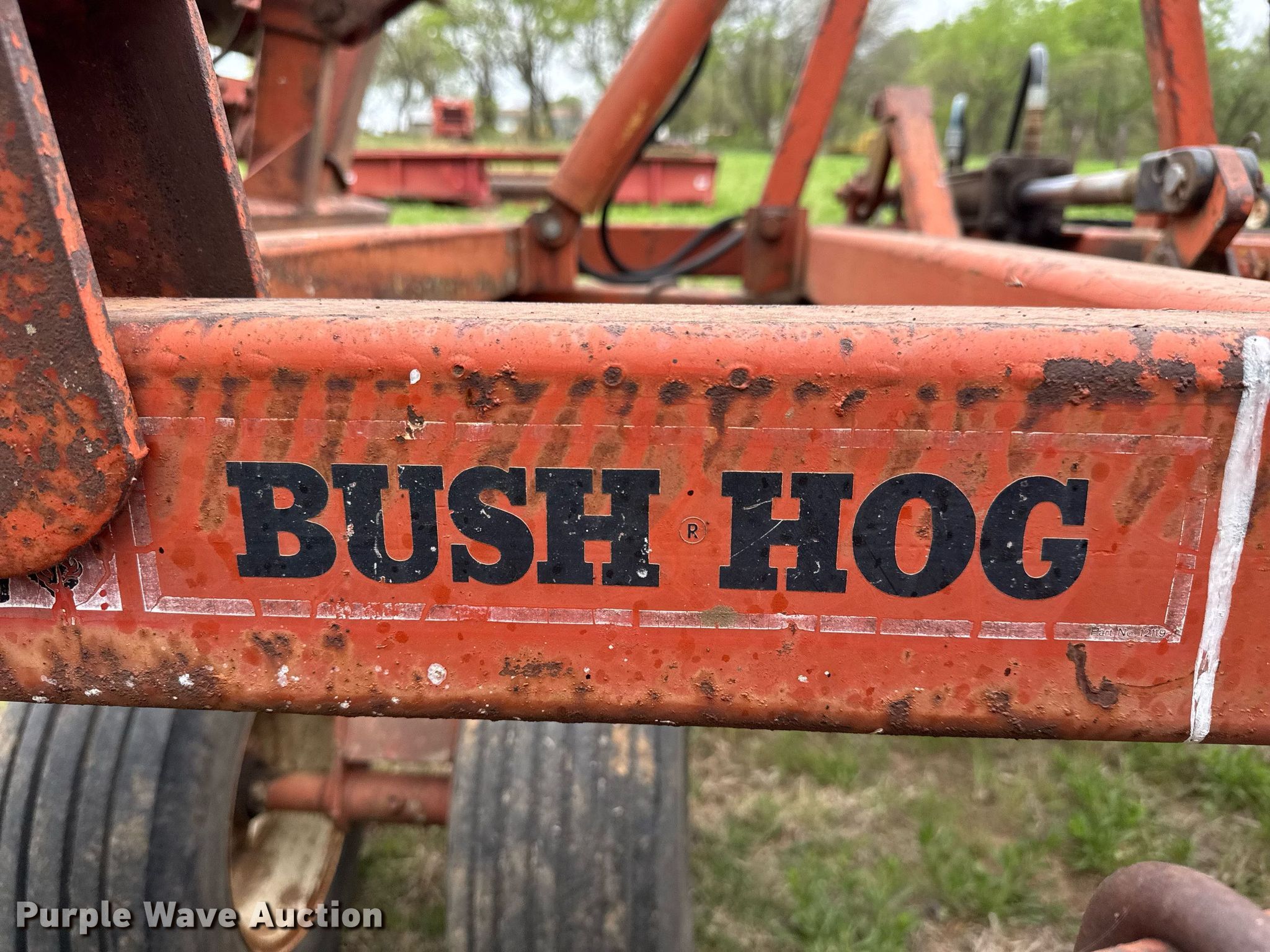 Bush Hog 1445 tandem disk. Overall width: 15'. Features Front blades Diameter: 20", Spacing: 9", Rear blades Diameter: 21", Spacing: 9", Disk scrapers, Operation Hydraulic lift, Hydraulic fold, Leveler: Manual. Tires Tire size: 9.5L-15. Mulvane, KS 67110