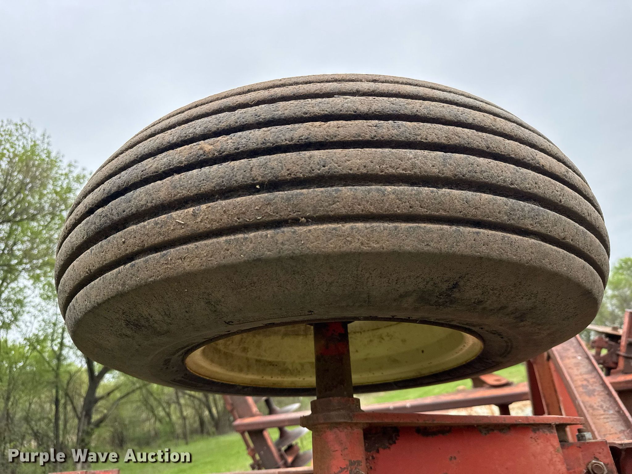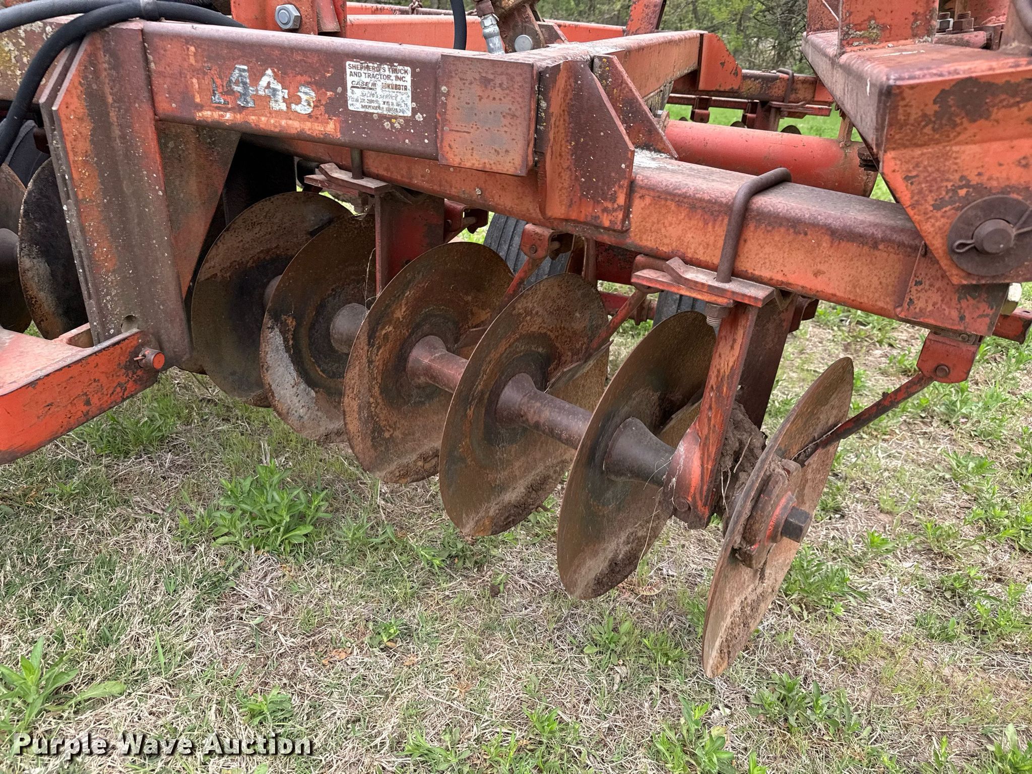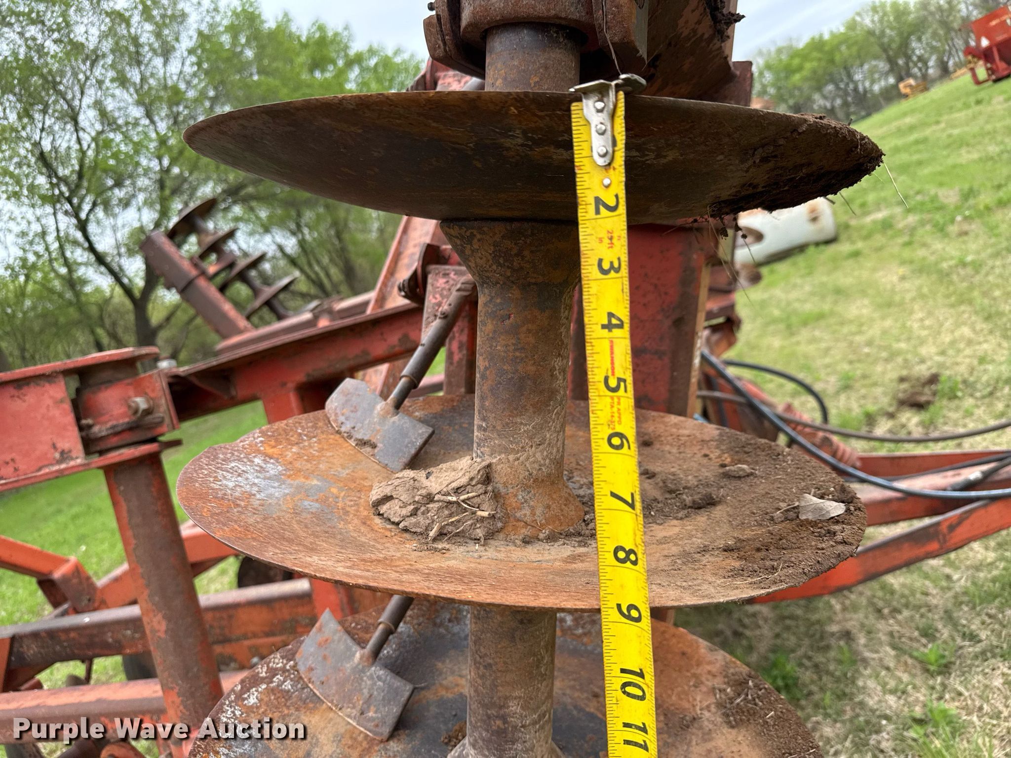Bush Hog 1445 tandem disk. Overall width: 15'. Features Front blades Diameter: 20", Spacing: 9", Rear blades Diameter: 21", Spacing: 9", Disk scrapers, Operation Hydraulic lift, Hydraulic fold, Leveler: Manual. Tires Tire size: 9.5L-15. Mulvane, KS 67110