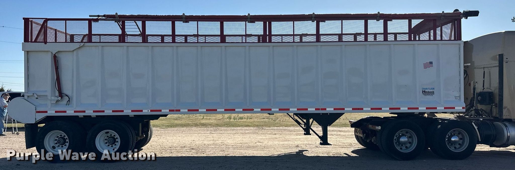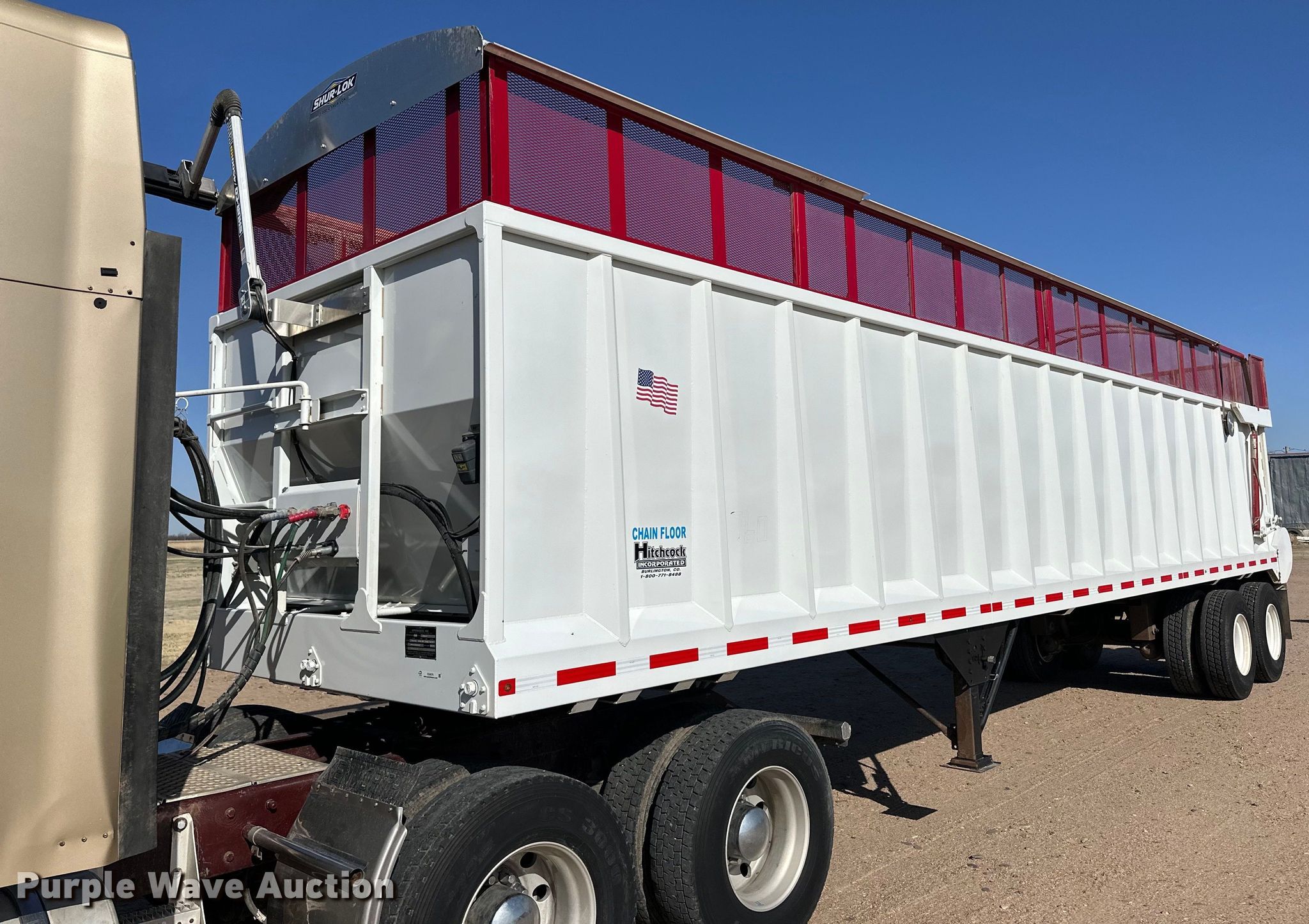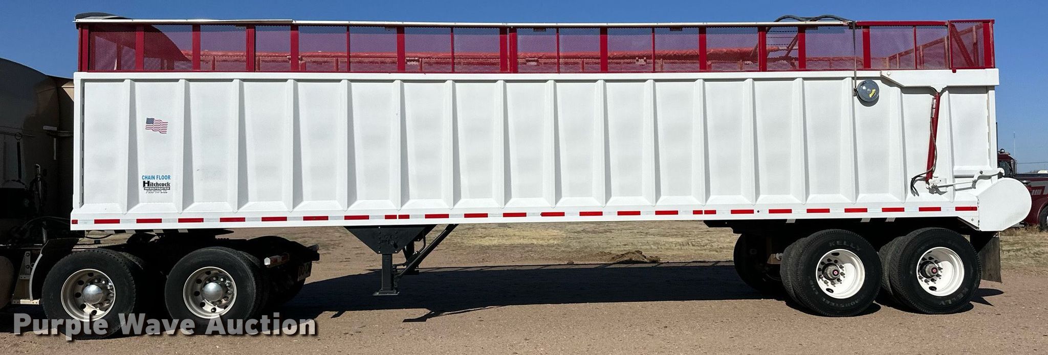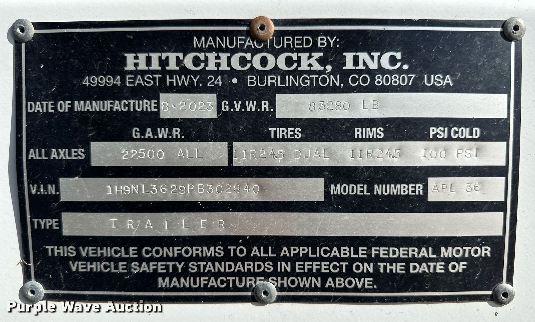 2023 Hitchcock APL36 silage trailer. VIN: 1H9NL3629PB302840. Dimensions Overall: 36' L x 102" W, Side height: 60", Sideboard height: 24". Features Body type: Steel, Trap gates: Hydraulic, Floor: Slat and chain Belt/ chain width: 84", Roll tarp. Chassis Landing gear: Dual, Suspension: Air, Brakes: Air, Axles: Tandem, GVWR: 83,280 lbs, GAWR: 22,500 lbs. Tires Steel wheels, Size: 11R22.5. Notes Semi not included. Kansas electronic title. Title has a lien that will be released following the close of the auction. A paper title will be printed once the lien is released. Title distribution may be delayed up to 30 days from verification of funds. Lakin, KS 67860
