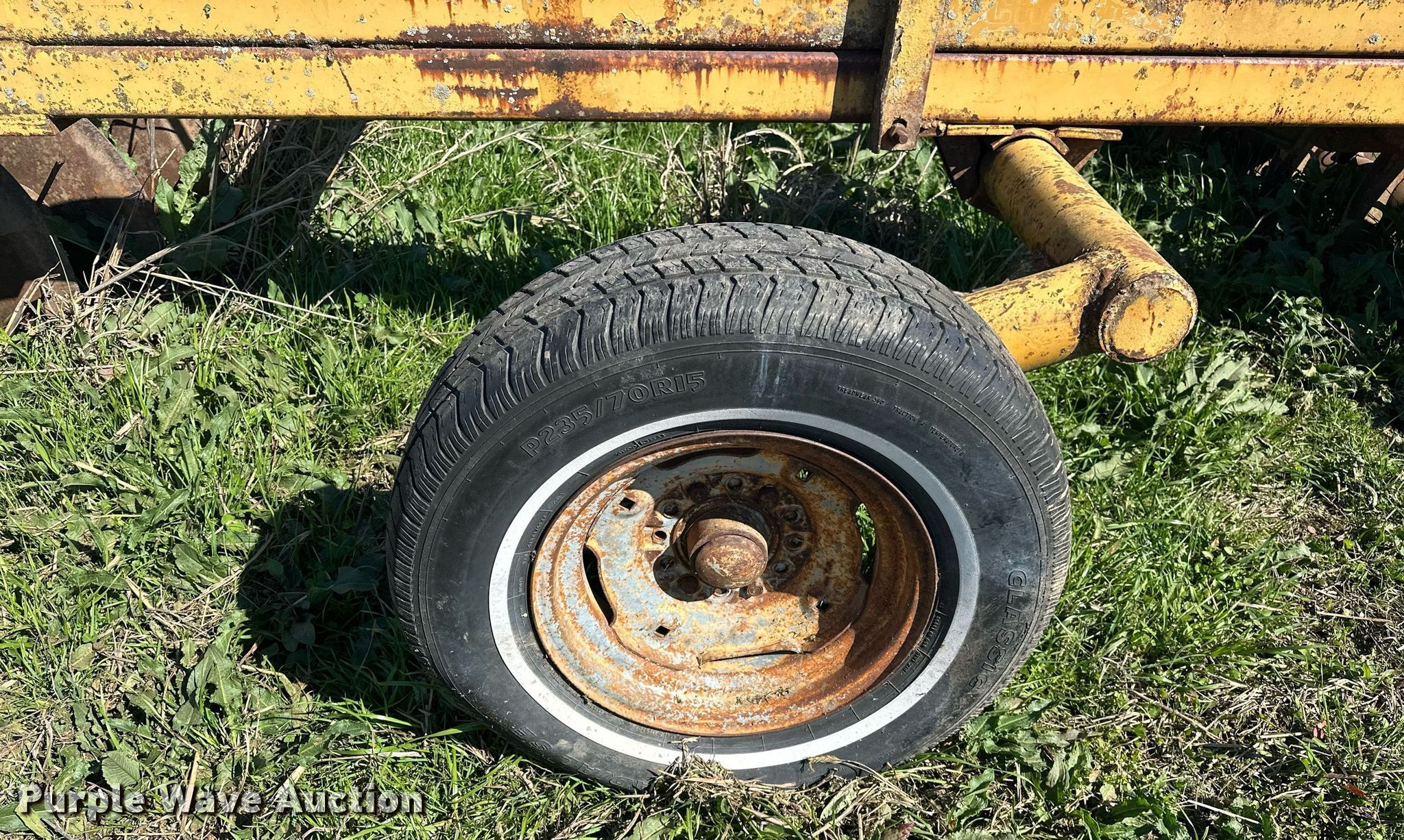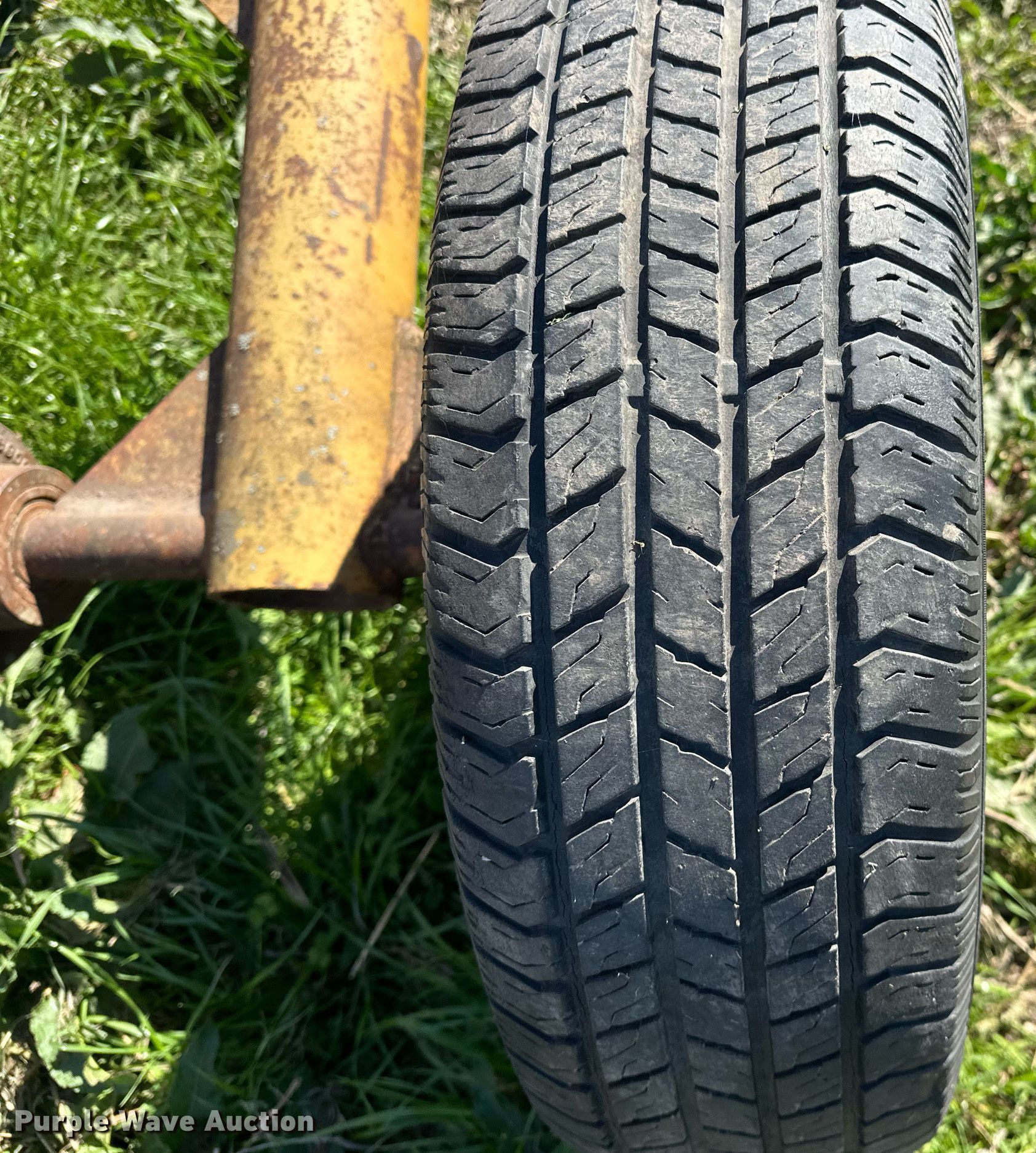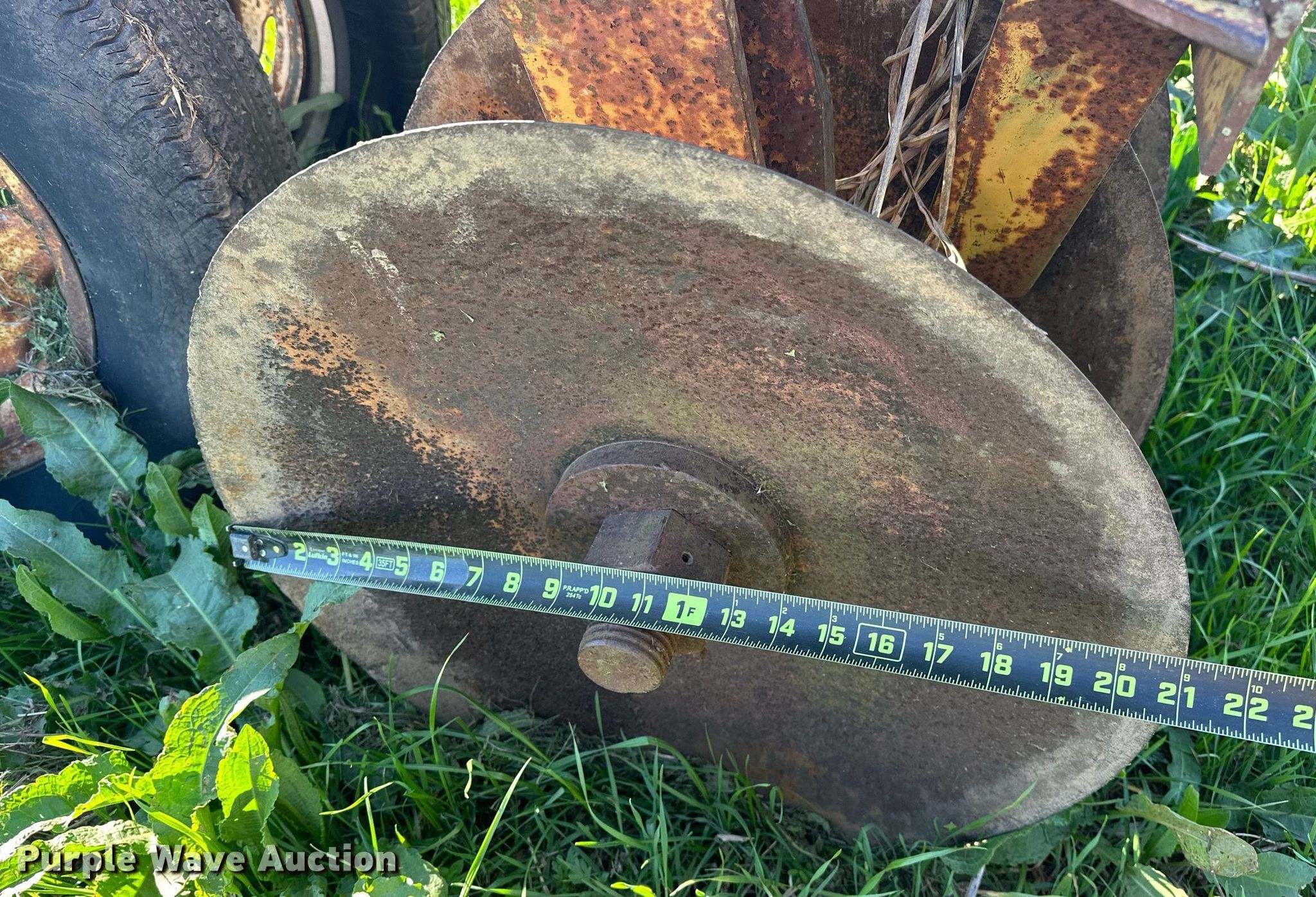 Off-set disk. Overall width: 14'. Features Front blades Diameter: 20", Spacing: 8", Rear blades Diameter: 22", Spacing: 8", Operation Hydraulic lift. Tires Tire size: 235/70R15. Notes Tire and wheel missing, Flat tires. 100097 Oklahoma 56. Okemah, OK 74859