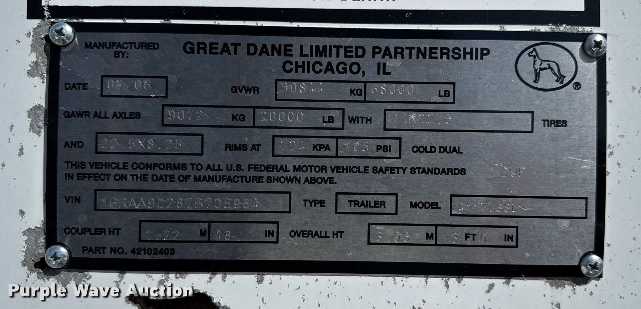 2007 Great Dane dry van trailer. VIN: 1GRAA90287B705964. Dimensions Overall: 45' L x 102" W, Rear door / ramp Width: 93". Features Deck type: Wood. Chassis Landing gear: Dual, Suspension: Spring, Brakes: Air, Axles: Tandem. Tires Steel wheels, Size: 11R22.5. Notes Semi not included, Rust damage, Wheel rust damage. Oklahoma title. Seller is an Oklahoma licensed motor vehicle dealer. Title will be assigned and distributed by the dealer. Please contact the seller for distribution questions. Title distribution may be delayed up to 30 days from verification of funds. 15107 North 137th East Avenue. Collinsville, OK 74021