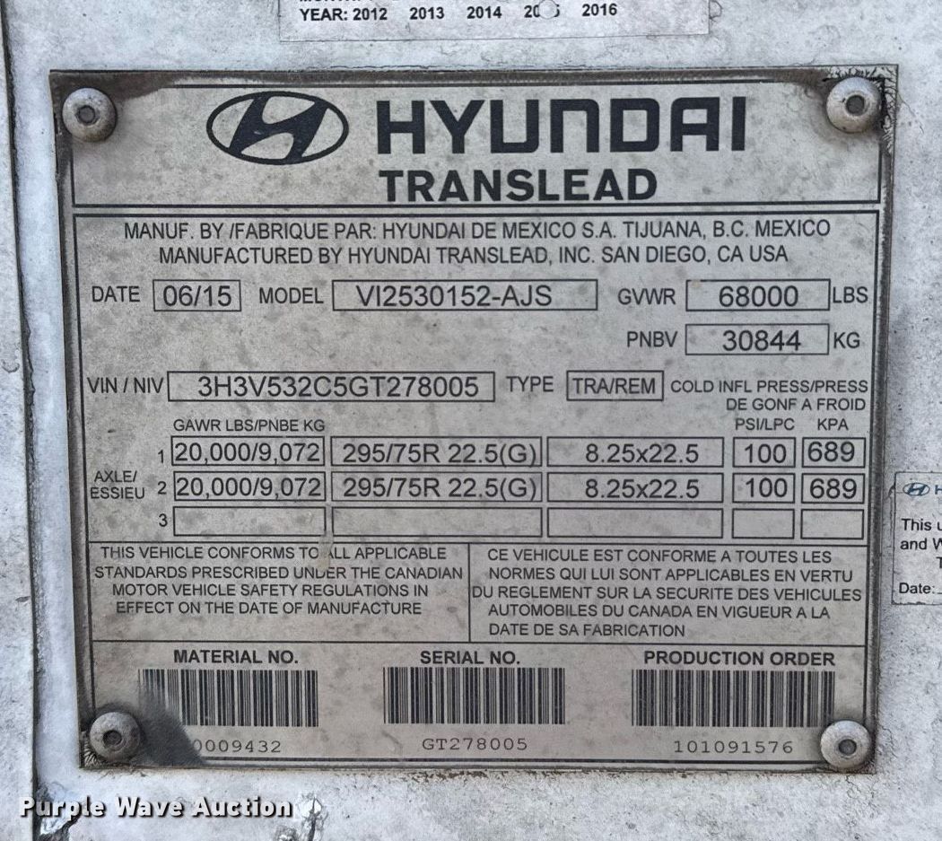 2016 Hyundai VI2530152-AJS dry van trailer. VIN: 3H3V532C5GT278005. Dimensions Overall: 53' L x 102" W, Rear door / ramp Width: 96". Features Deck type: Wood, E-track rail system. Chassis Landing gear: Dual, Suspension: Air, Brakes: Air, Axles: Tandem Sliding, GVWR: 68,000 lbs. Tires Steel wheels, Size: 295/75R22.5. Kansas title. Title distribution may be delayed up to 14 days from verification of funds. La Crosse, KS 67548