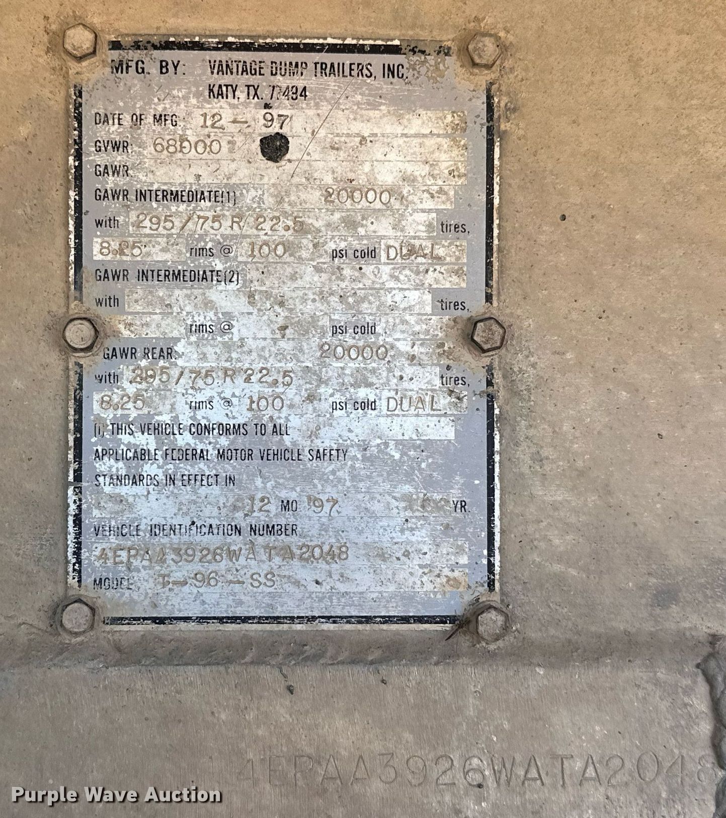 Purple Wave is selling a used End Dump Rock Trailer in Oklahoma. This item is a 1998 Vantage T-96-SS end dump trailer with the following: VIN: 4EPAA3926WATA2048