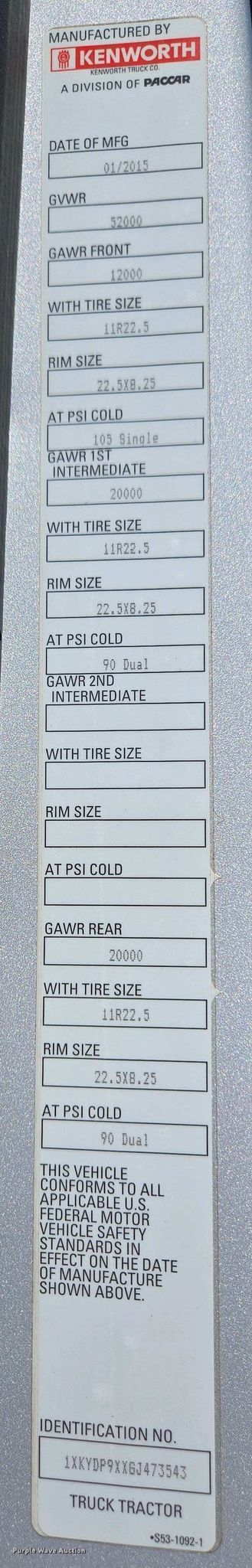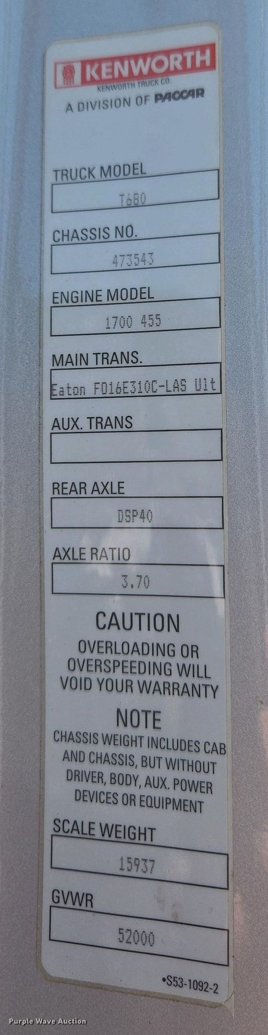 2016 Kenworth T680 semi truck. Miles: 49,334 on odometer, VIN: 1XKYDP9XXGJ473543. Engine Paccar MX13, Displacement: 12.9L, Cylinders: 6, Fuel type: Diesel, Engine brake. Transmission Eaton Fuller, Automated manual. Chassis Axles: Tandem, Gear ratio: 3.70, Differential lock: Inter-axle, Suspension: Air Dump valves, Brakes: Air, PTO, GVWR: 52,000 lbs FAWR: 12,000 lbs, IAWR: 20,000 lbs, RAWR: 20,000 lbs. Interior AC, Heat, Heated mirrors, Power windows, Power locks, Cruise control, Air ride cab. Features Deck plate: Aluminum, Fifth wheel type: Fixed, Fuel tank: Single. Tires Size: 11R22.5. Notes DEF deleted, DPF deleted, EGR deleted. Oklahoma title. Seller is an Oklahoma licensed motor vehicle dealer. Title will be assigned and distributed by the dealer. Please contact the seller for distribution questions. Title distribution may be delayed up to 14 days from verification of funds. Broken Bow, OK 74728