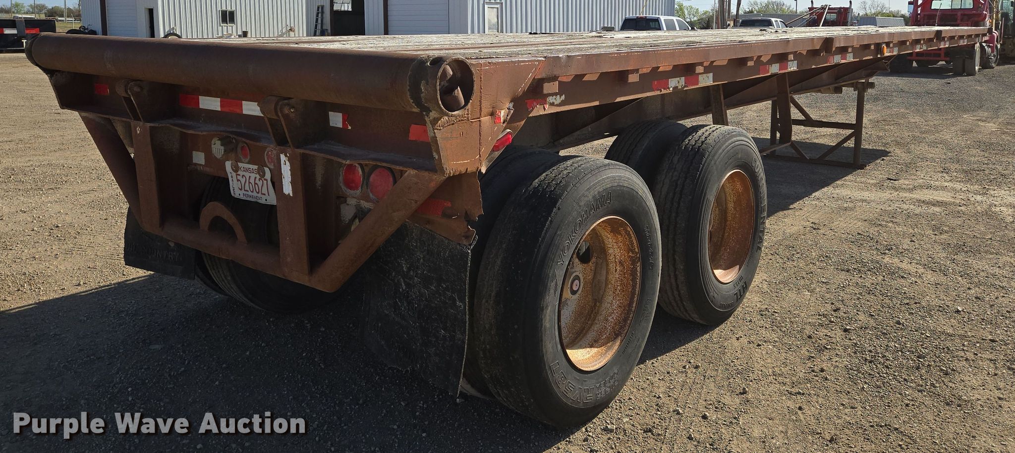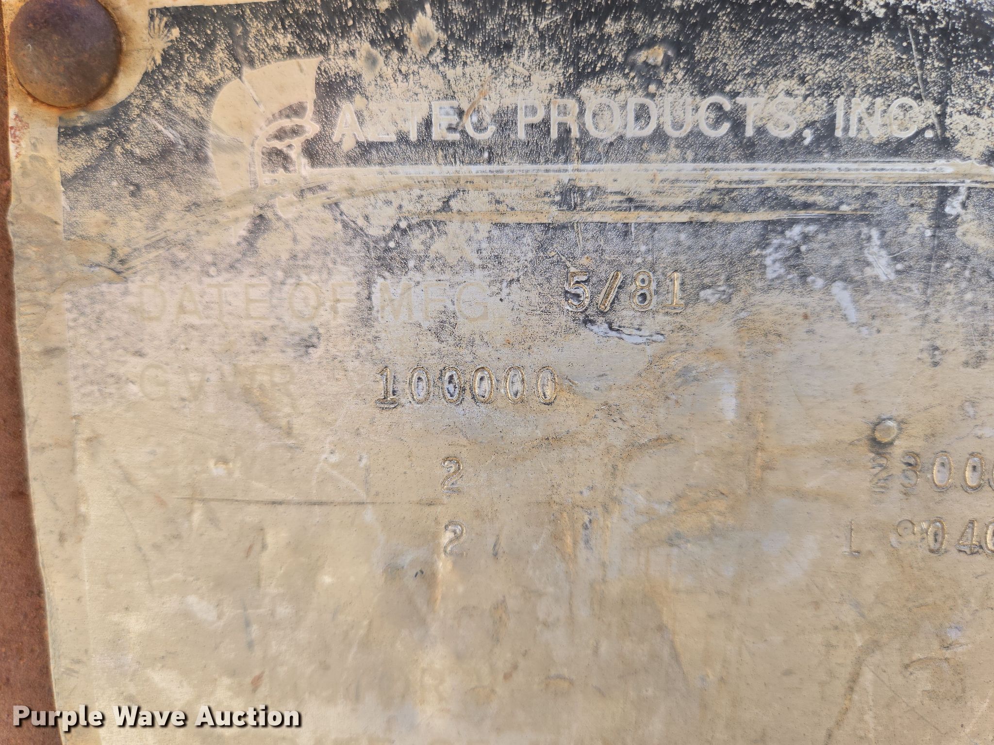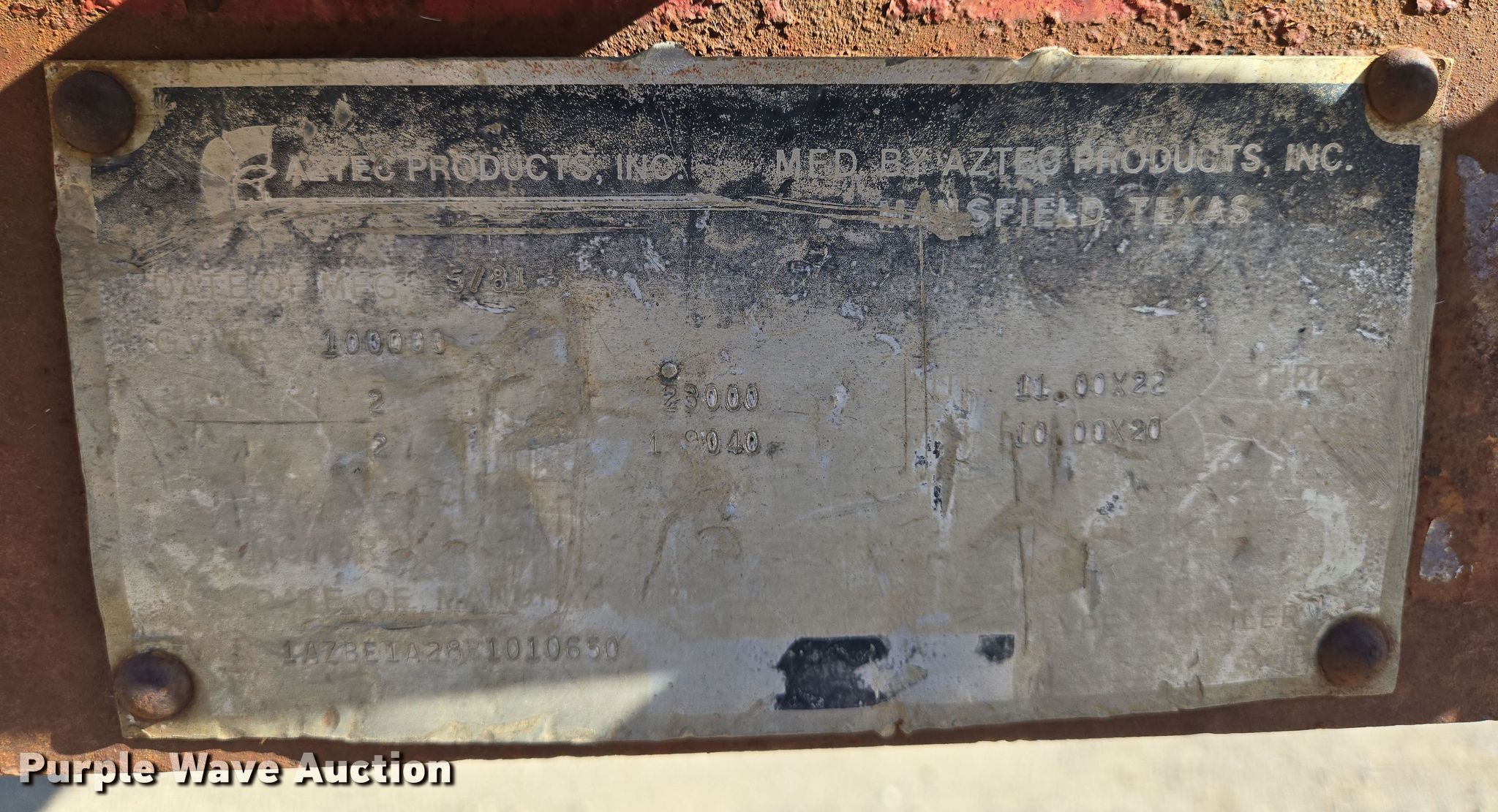 1981 Aztec oilfield trailer. VIN: 1AZBE1A28B1010650. Dimensions Overall: 36' L x 96" W. Features Deck type: Wood, Rolling tailboard. Chassis Landing gear: Dual, Suspension: Spring, Brakes: Air, Axles: Tandem, GVWR: 100,000 lbs. Tires Steel wheels, Size: 11R22.5. Notes Deck boards damaged. Kansas title. Title distribution may be delayed up to 14 days from verification of funds. El Dorado, KS 67042