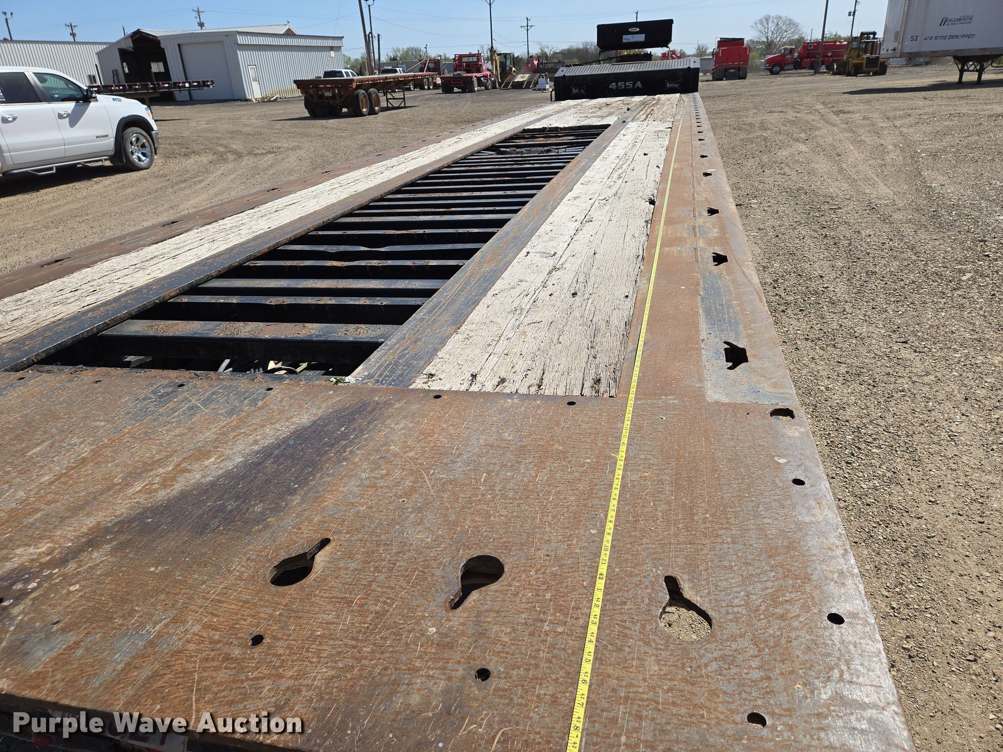 2016 Landoll drop deck equipment trailer. VIN: 1LH455WJ3G1A22984. Dimensions Overall: 52' 8" L x 102" W, Deck: 43' L x 102" W, Top deck length: 9' 8". Features Deck type: Wood, Winch Brayden, Capacity: 20,000 lbs. Chassis Landing gear: Dual, Hydraulic, Suspension: Air, Brakes: Air, Axles: Triple Sliding, GVWR: 132,800 lbs, GAWR: 21,420 lbs. Tires Aluminum wheels, Size: 235/75R17.5. Notes Bushing issues, rear axle lateral movement. Kansas title. Title distribution may be delayed up to 14 days from verification of funds. El Dorado, KS 67042