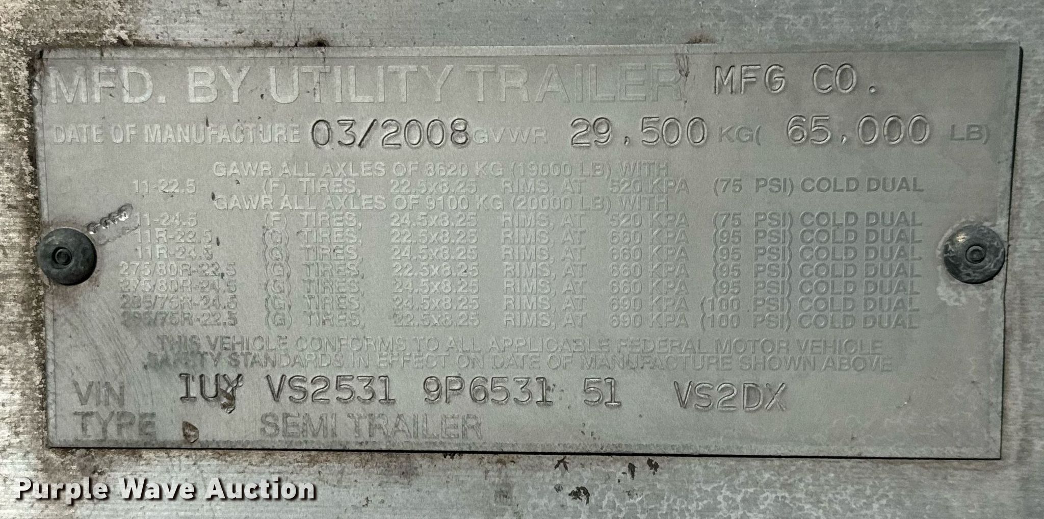 2009 Utility 4000D-X dry van trailer. VIN: 1UYVS25319P653151. Dimensions Overall: 53' L x 102" W. Features Deck type: Wood, E-track rail system. Chassis Landing gear: Dual, Suspension: Air, Brakes: Air, Axles: Tandem Sliding, GVWR: 65,000 lbs. Tires Aluminum wheels, Steel wheels, Size: 295/75R22.5. Missouri title. Title distribution may be delayed up to 30 days from verification of funds. Park City, KS 67219