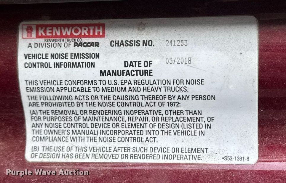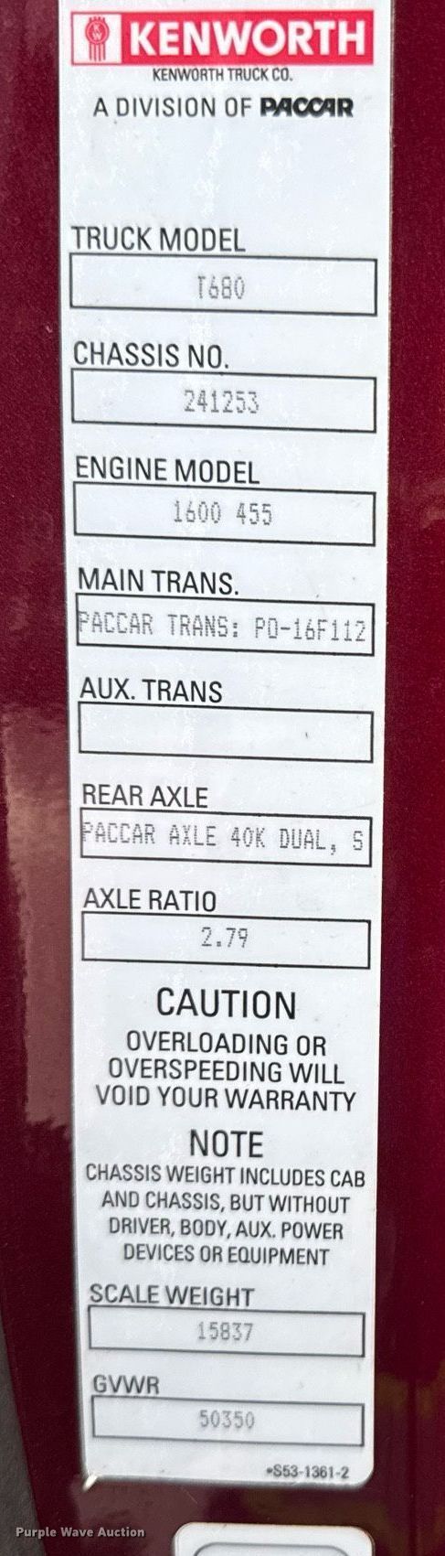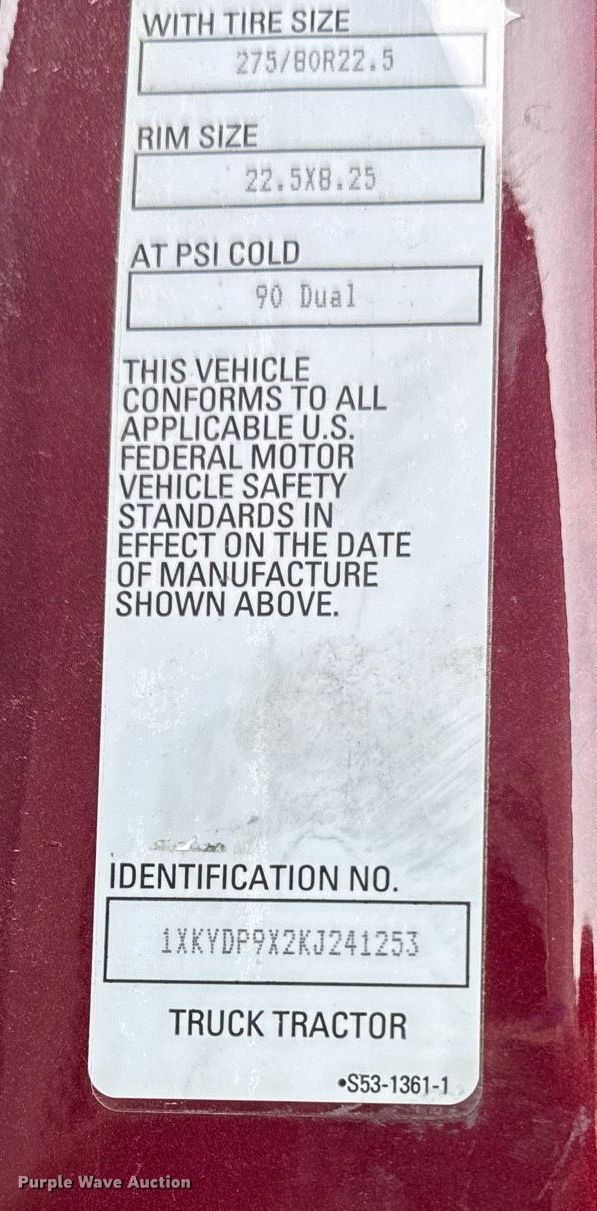 2019 Kenworth T680 semi truck. Miles: 429,139 on odometer, VIN: 1XKYDP9X2KJ241253, Unit #: 47813325. Engine Paccar MX-13, Displacement: 12.9L, Cylinders: 6, Fuel type: Diesel, Engine brake. Transmission Automated manual. Chassis Axles: Tandem, Differential lock: Inter-axle, Suspension: Air Dump valves, Brakes: Air, GVWR: 50,350 lbs FAWR: 12,350 lbs, IAWR: 19,000 lbs, RAWR: 19,000 lbs. Interior AC, Heat, Heated mirrors, Power windows, Power locks, Cruise control, Air ride cab, Sleeper Sleeper length: 44", Beds: Single, Rear climate control. Features Deck plate: Aluminum, Fifth wheel type: Fixed, Fuel tank: Dual. Tires Size: 295/75R22.5. Notes Windshield chipped or cracked, Dead battery, Transmission issues, fault code , Unit will need to be towed or hauled. Repossessed item, stored at a secured facility. Please review REQUIRED REMOVAL INSTRUCTIONS. Lender owned. Item condition and history are unknown. No additional information is available. Titles will be distributed after confirmation of payment and removal. Indiana title. Title distribution may be delayed up to 30 days from verification of funds. Lender Owned. Sandston, VA 23150