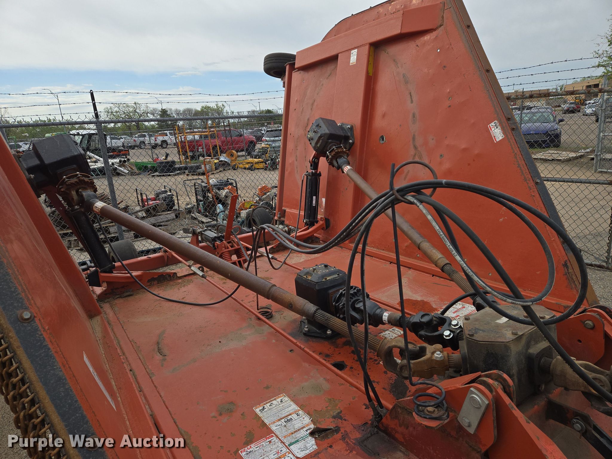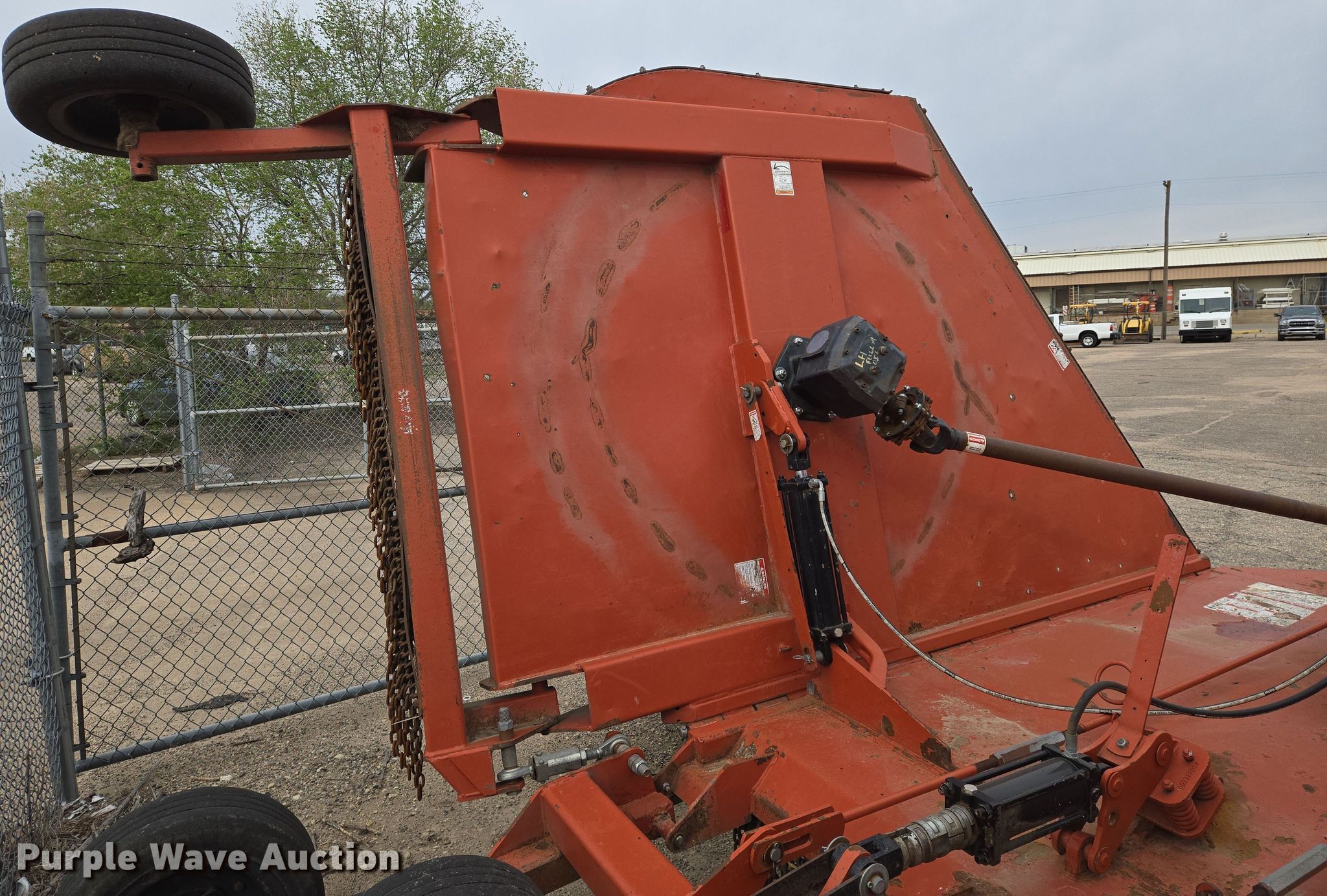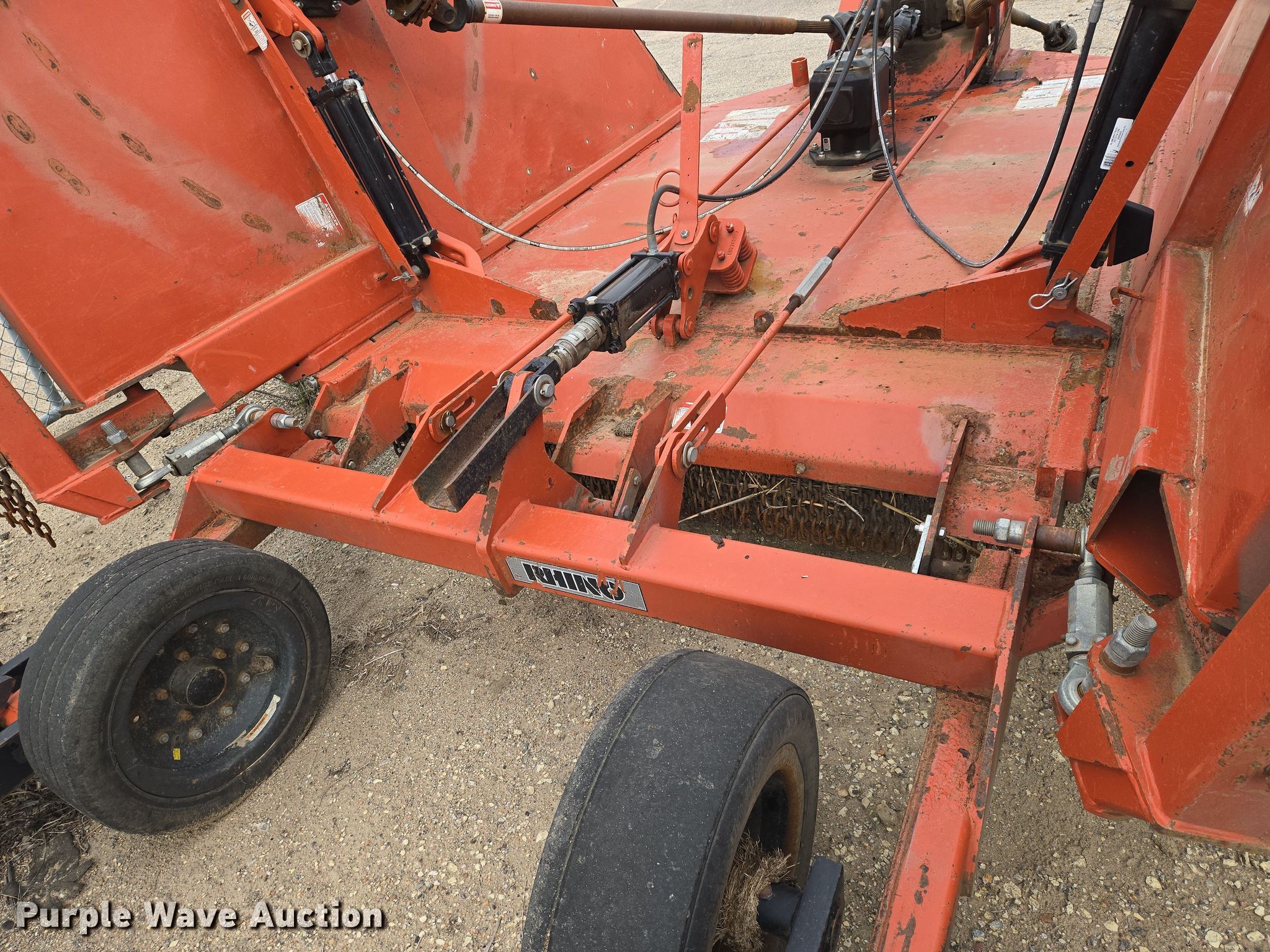 Rhino batwing rotary mower. Unit #: 003670. Features Width: 20', Hydraulic lift, Hydraulic fold, PTO: 540. Tires Size: 25.5X8-14. Notes Frame bent. City of Wichita Central Maintenance Facility. 1801 South McLean Boulevard. Wichita, KS 67213