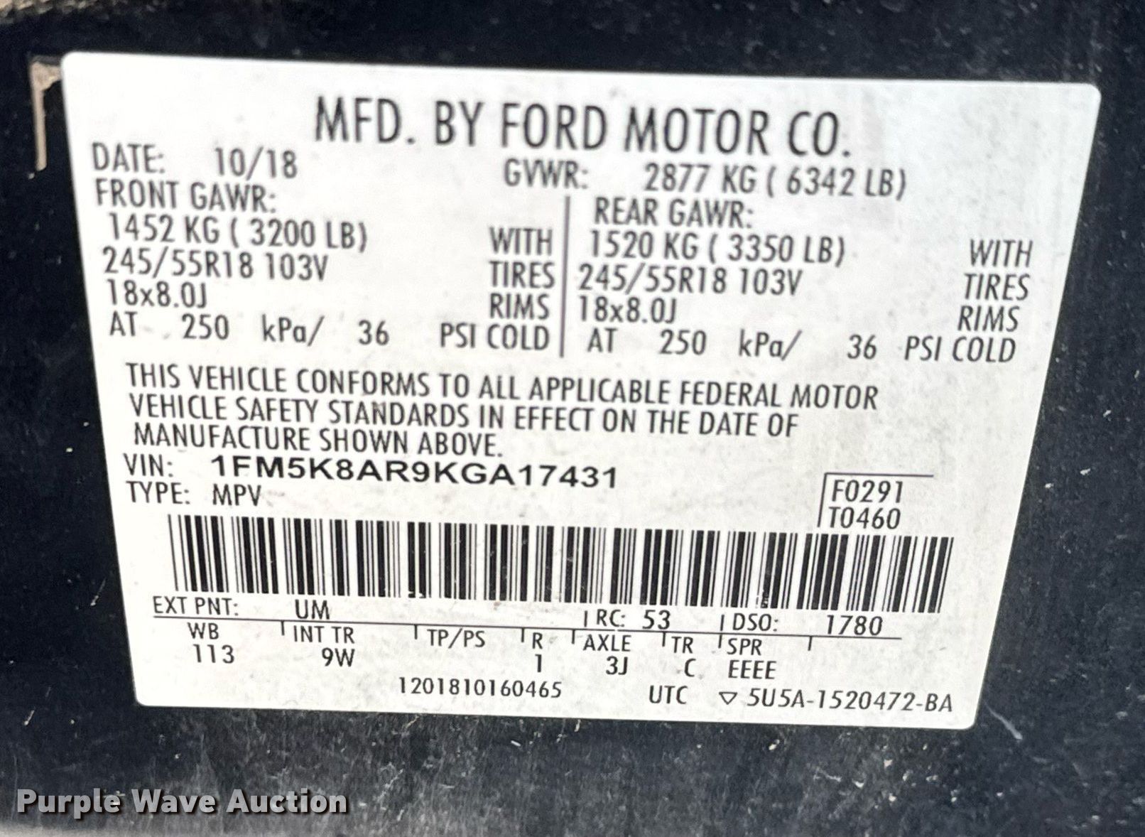Purple Wave is selling a used Passenger Vehicle in Kansas. This item is a 2019 Ford Explorer Police Interceptor SUV with the following: Miles: 93,168 on odometer, VIN: 1FM5K8AR9KGA17431, Unit #: 3679