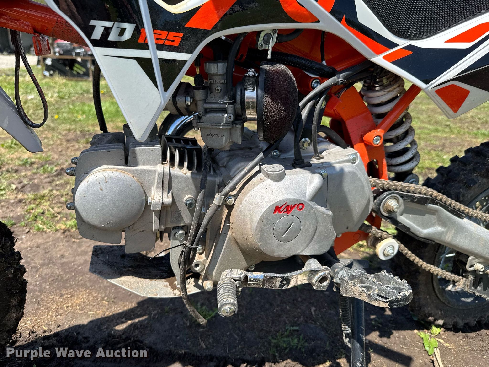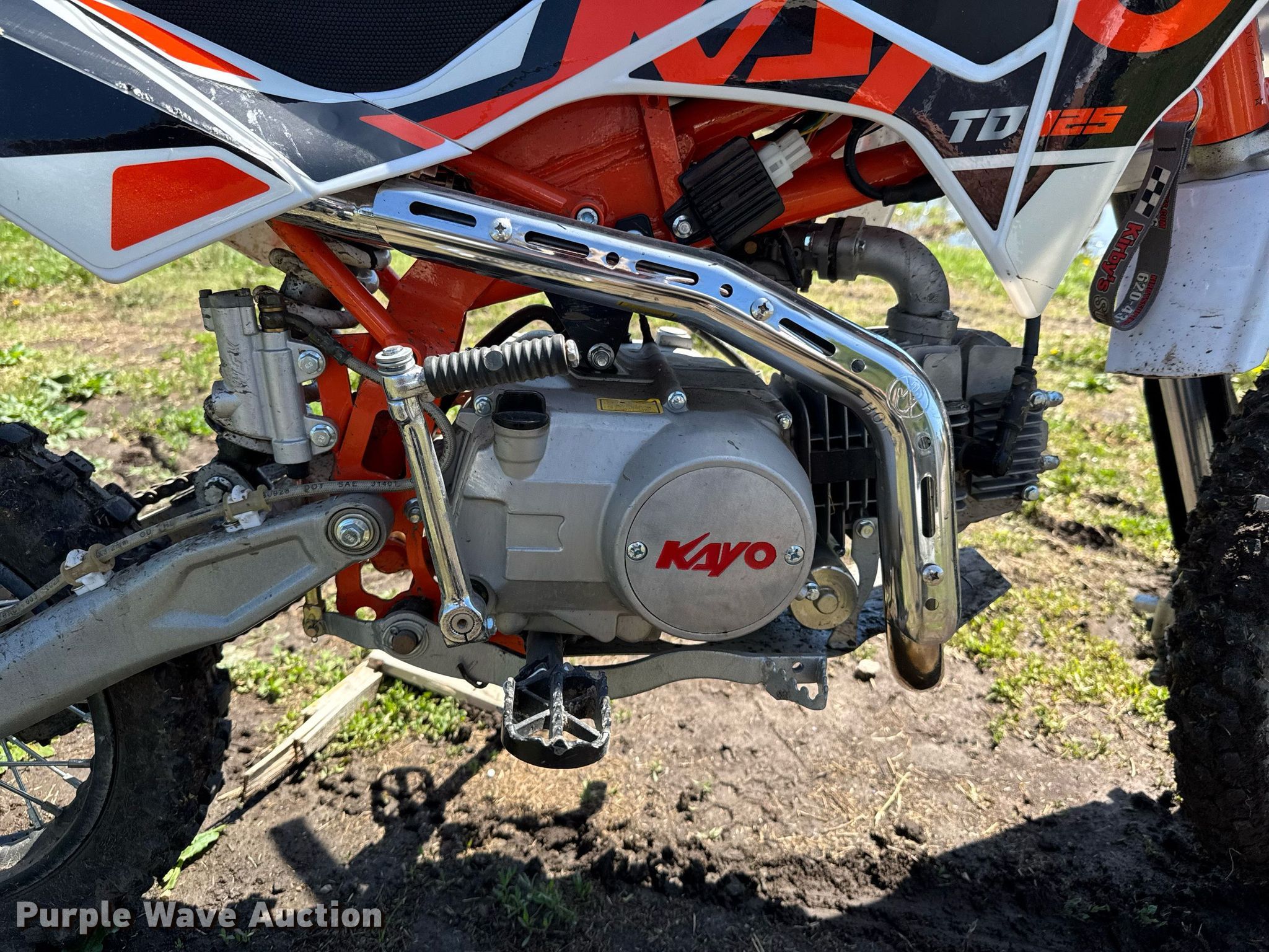 2022 Kayo TD125 motorcycle. VIN: L6JYGJLC6N1007606. Engine Kayo, Displacement: 125 cc, Cylinders: 1, Fuel type: Gas. Transmission Manual, Speed: 3. Tires Front: 80/100-14, Rear: 80/100-12. Transfer of ownership documentation will be a bill of sale. Fredonia, KS 66736