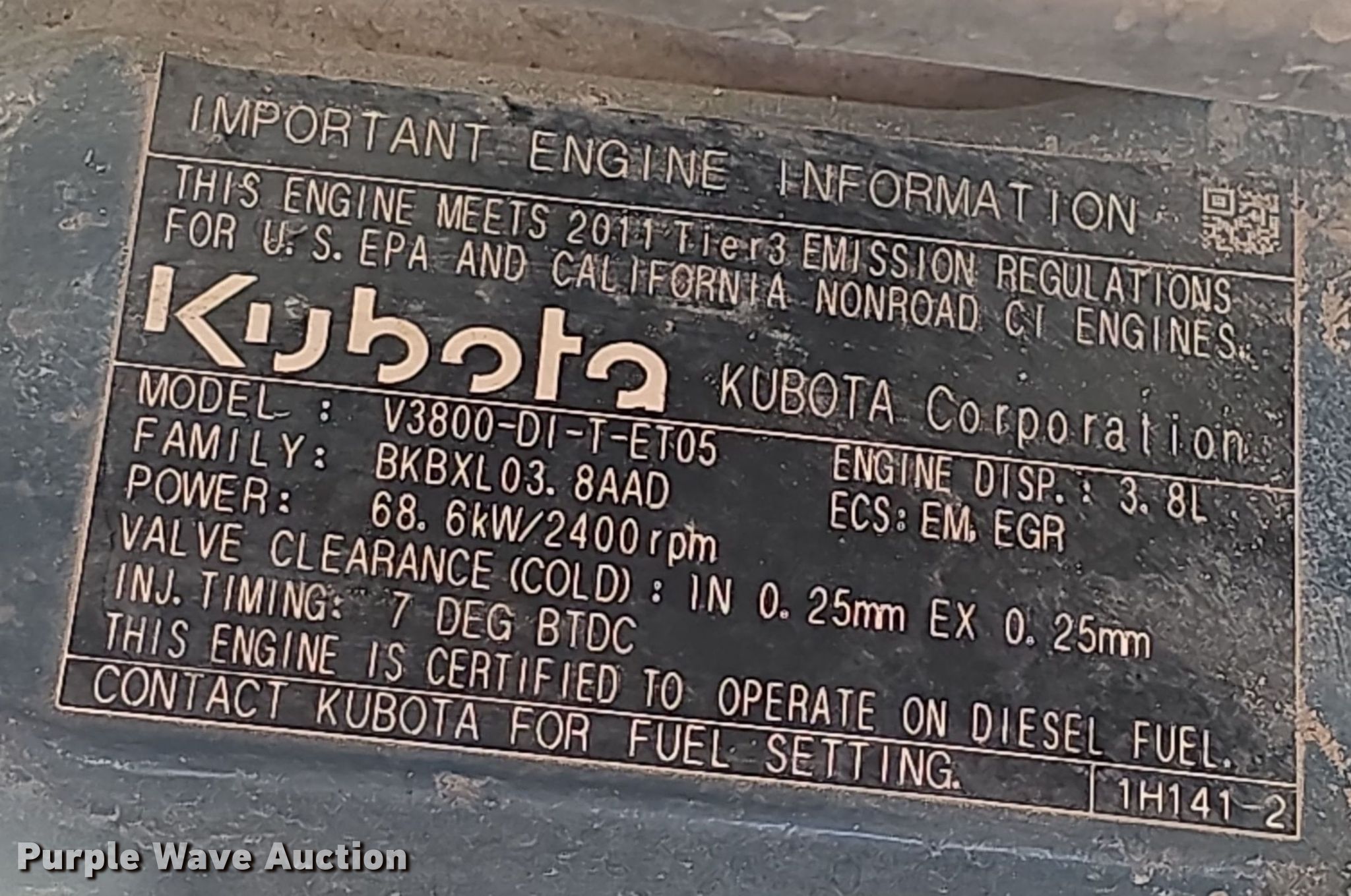 2012 Kubota SVL90 tracked skid steer loader. Hours: 889 on meter, Serial: 11368. Engine Kubota V3800, Serial: BW3136, Displacement: 3.8L, Cylinders: 4, Fuel type: Diesel, kW: 68.6. Transmission Hydrostatic, Two speed travel. Operators station Enclosed cab, AC, Heat, Bucket control: Hand. Features Auxiliary hydraulics, Bucket Kubota S6609, Width: 80", Teeth: Weld-on. Tracks Width: 18". Abilene, KS 67410