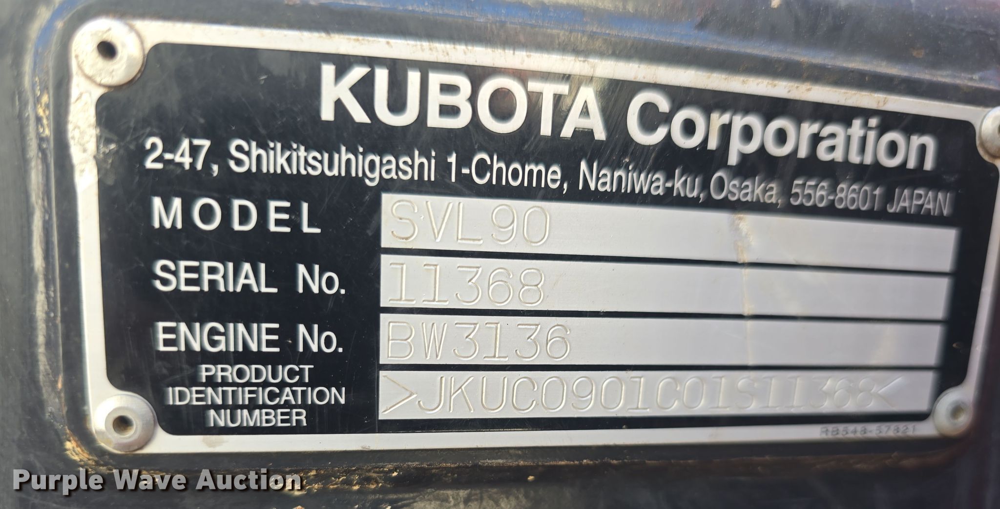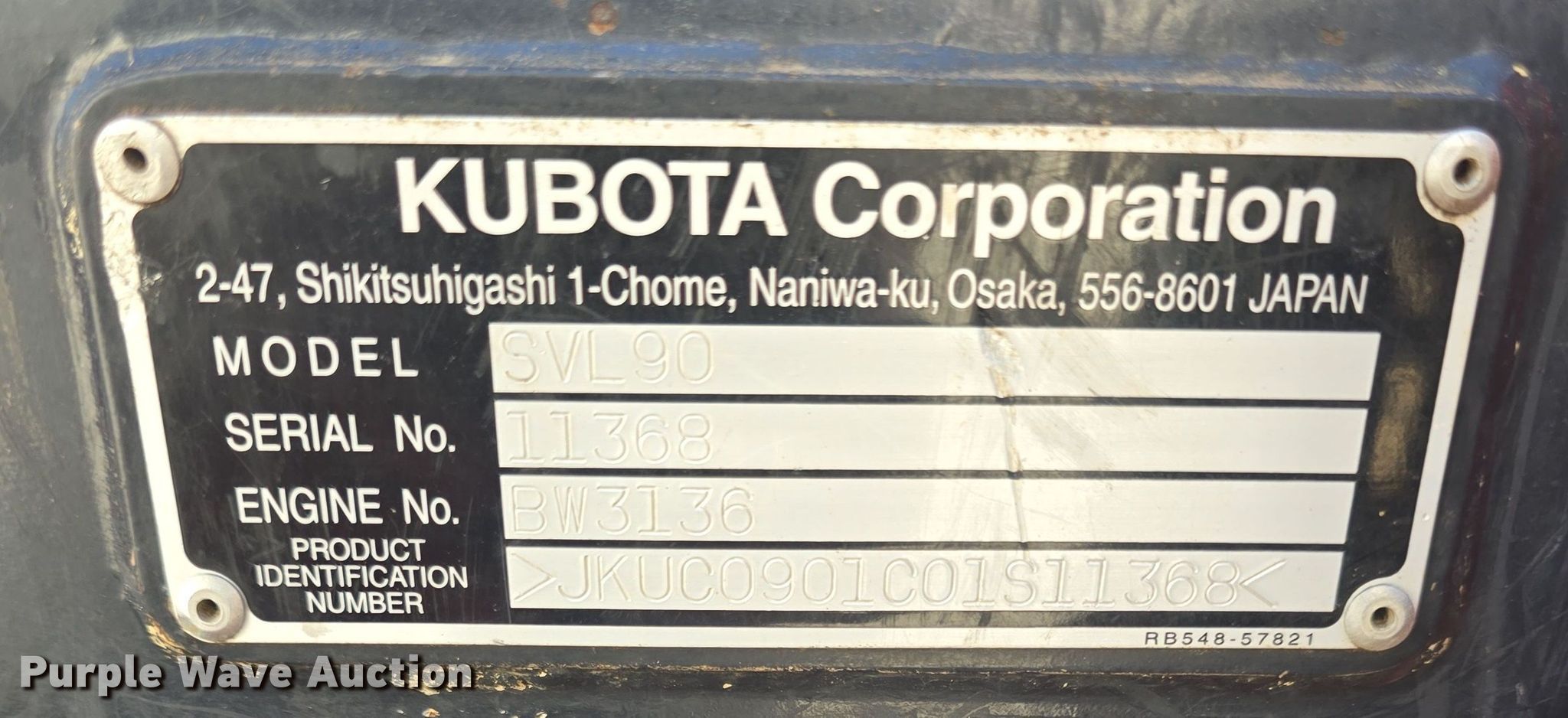 Purple Wave is selling a used Tracked Skid Steer Loader in Kansas. This item is a 2012 Kubota SVL90 tracked skid steer loader with the following: Hours: 889 on meter, Serial: 11368