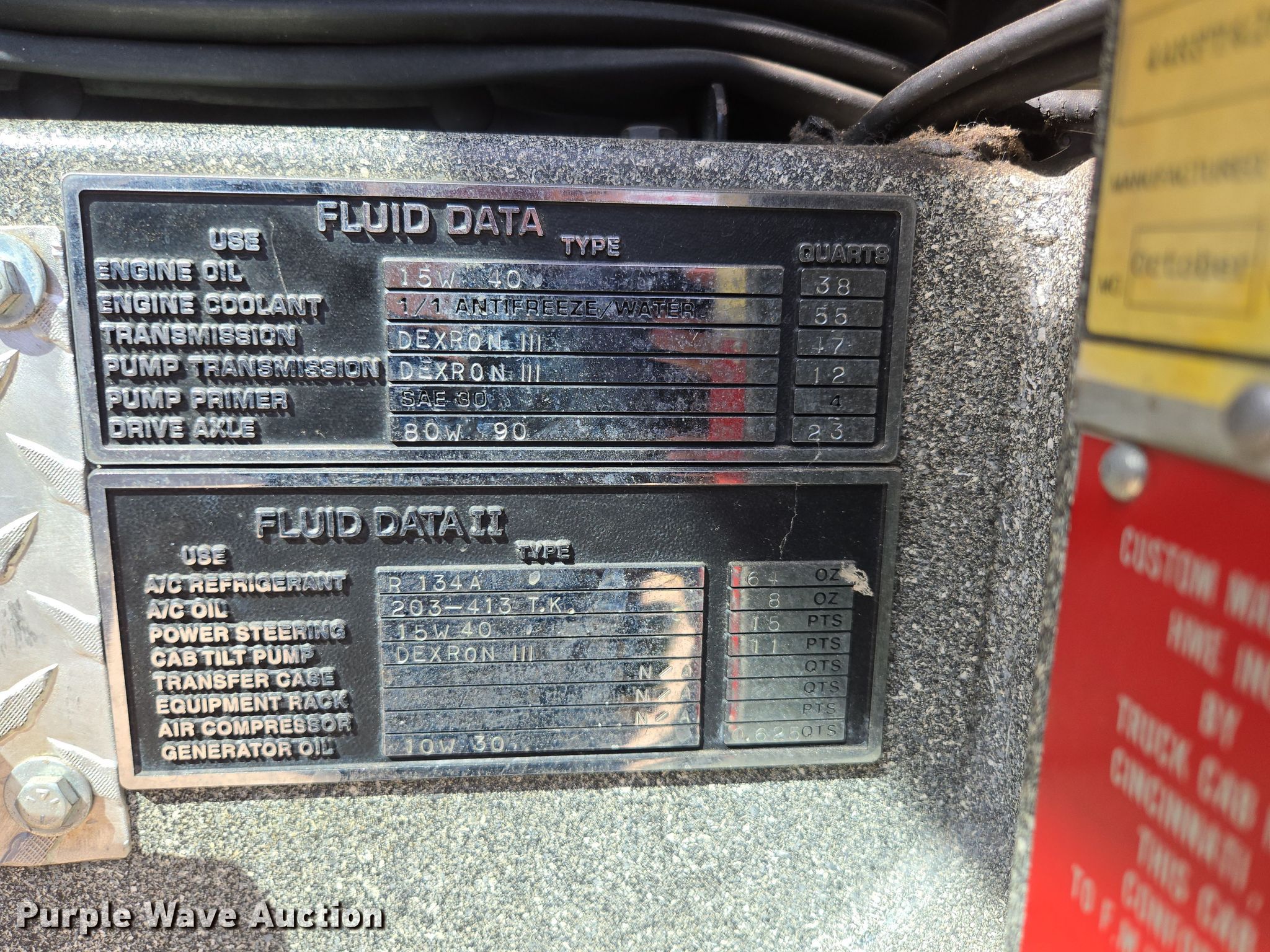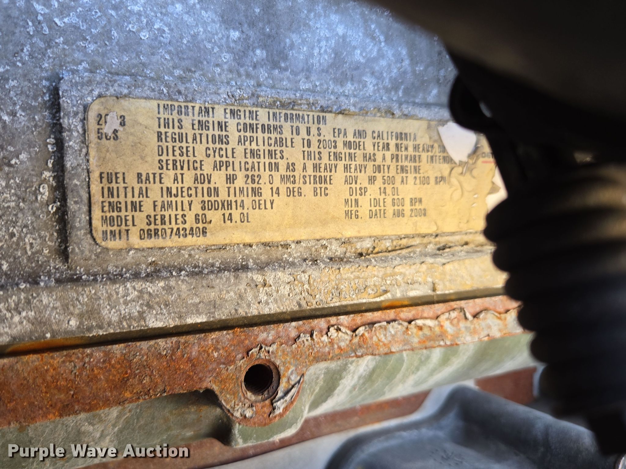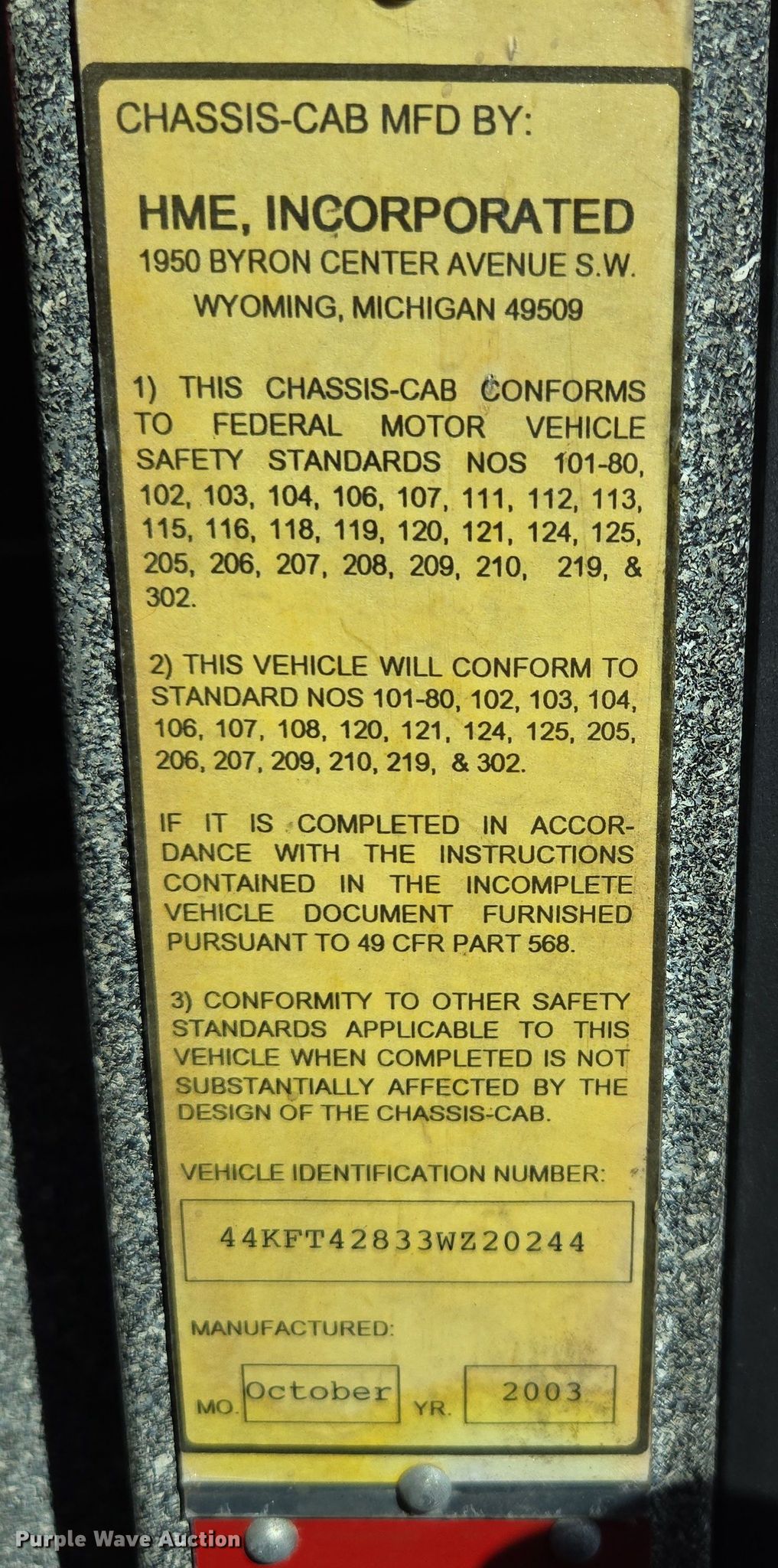 2003 HME Central States Fire Apparatus ladder fire truck. Miles: 132,194 on odometer, Hours: 11,130 on meter, VIN: 44KFT42833WZ20244, Unit #: 8. Engine Detroit Diesel 60 Series, Serial: 06R0743406, Displacement: 14.0L, Cylinders: 6, Fuel type: Diesel, HP: 500. Transmission Automatic. Chassis Axles: Single, Suspension: Spring, Brakes: Air, GVWR: 52,500 lbs. Interior AC, Heat, Auxiliary controls. Features Fire truck body Aerial RK Aerials LLC 75T143, Hours: 1,377 on meter, Maximum height: 75', Maximum lift capacity: 500 lbs, Stabilizers Quantity: 2, Elevated deck gun, Tank, Pump 2,000 gpm, Ground ladder, PA/ siren controls, Foam system Foam cell capacity: 30 gallons, 3000 Watt Heavy Duty inverter. Tires Front: 425/65R22.5, Rear: 315/80R22.5. Notes Possible ladder hydraulic valve issues, Contents included, Rust damage. Missouri title. Seller is a Missouri licensed motor vehicle dealer. Title will be assigned and distributed by the dealer. Please contact the seller for distribution questions. Precision Fire Apparatus. Springfield, MO 65807