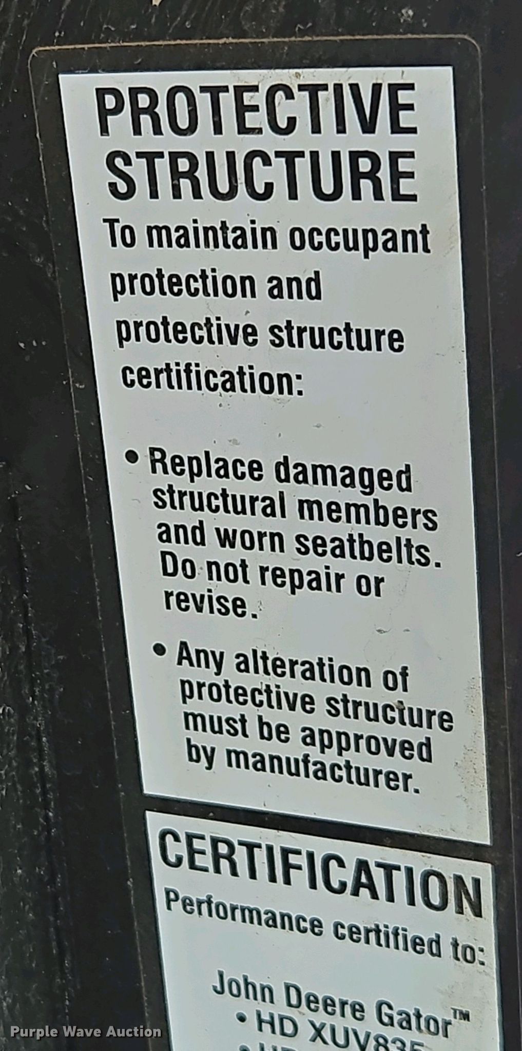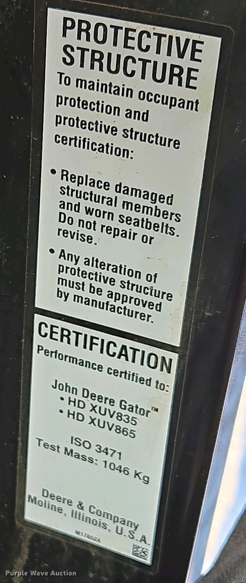 2023 John Deere Gator XUV835M utility vehicle. Miles: 6,551 on odometer, Hours: 444 on meter, Miles or hours may vary, unit still in use, VIN: 1M0835MDCPM060784. Engine John Deere, Displacement: 812cc, Cylinders: 3, Fuel type: Gas, Electric start. Transmission Automatic. Chassis Four wheel drive/ All wheel drive. Operators station Enclosed cab, OROPS, AC, Heat. Features Grille guard, Receiver hitch, Dump bed 44" L x 56" W, Dump bed type: Electric/ Hydraulic. Tires Front: 27x9.00R14 NHS, Rear: 27x11.00R14. Notes PowerGard warranty valid until September 24, 2025 or 600 hours. Kansas non-highway not intnd for road use title. Title distribution may be delayed up to 14 days from verification of funds. Columbus, KS 66725