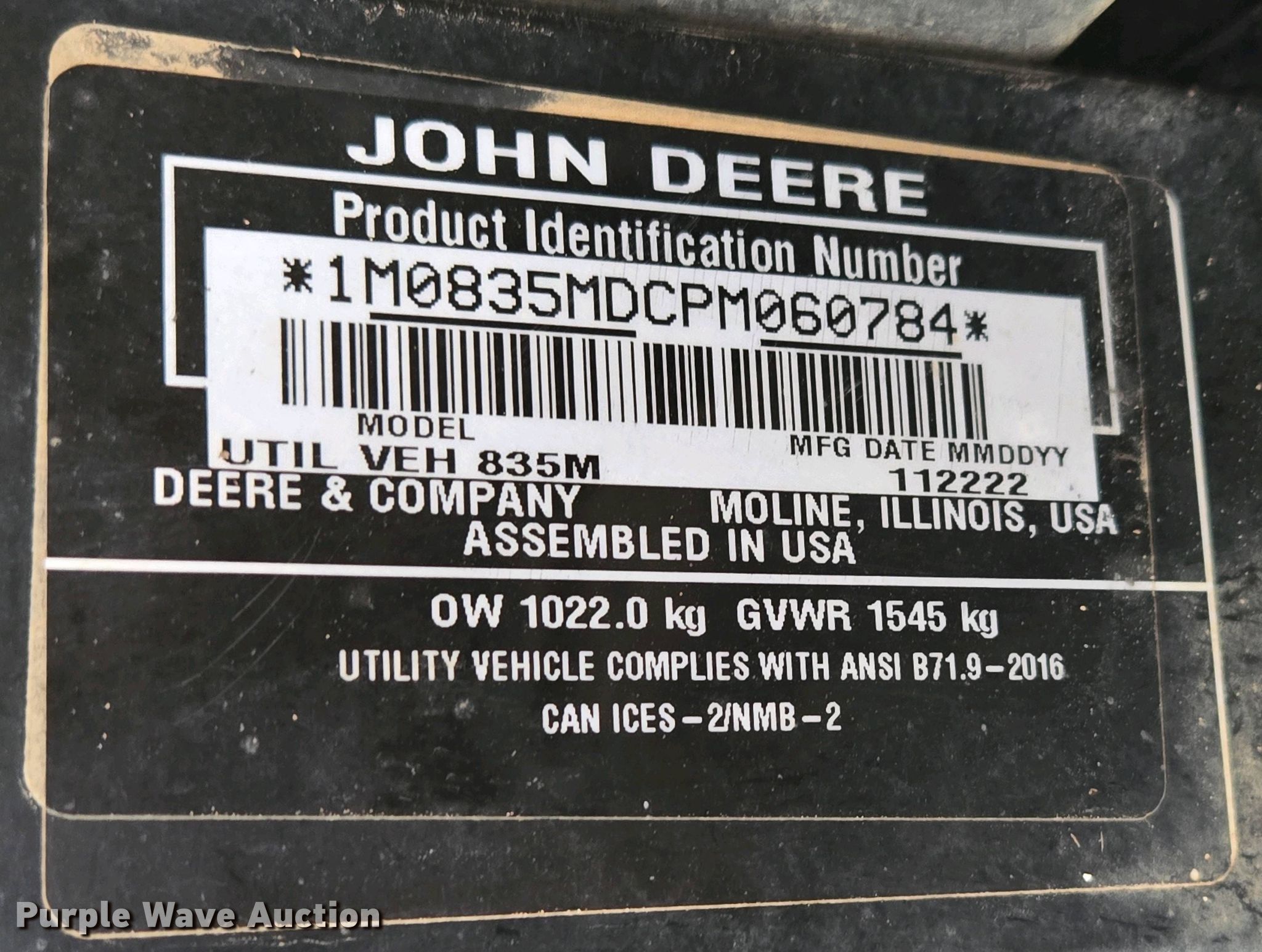 Purple Wave is selling a used Utility Vehicle in Kansas. This item is a 2023 John Deere Gator XUV835M utility vehicle with the following: Miles: 6,551 on odometer, Hours: 444 on meter, Miles or hours may vary, unit still in use, VIN: 1M0835MDCPM060784