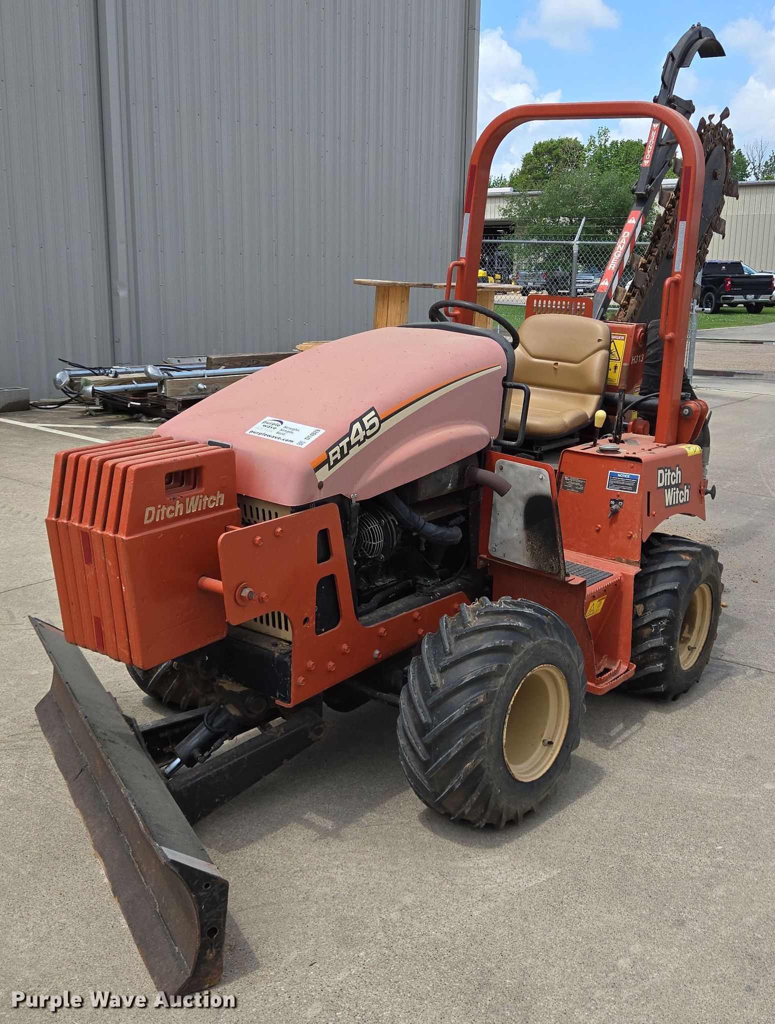2011 Ditch Witch RT45 trencher. Hours: 524 on meter, Serial: CMWRT45XLB0000730. Engine Deutz, Serial: 11028237, Displacement: 2.332L, Cylinders: 3, Fuel type: Diesel, HP: 42, kW: 31.5. Transmission Hydrostatic. Features Trencher Estimated dig depth: 60", Cutting width: 5", Side shift, Teeth: Dirt, Crumber, Backfill blade Width: 64". Tires Front: 26x12.00-12NHS. Newtron Beaumont, LLC. Nederland, TX 77627