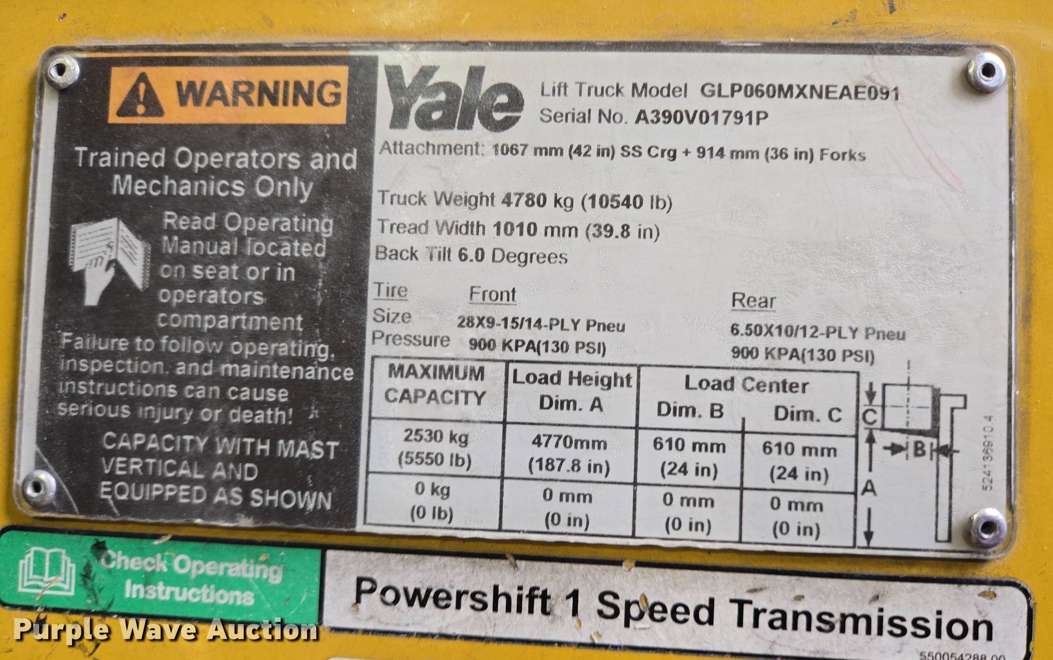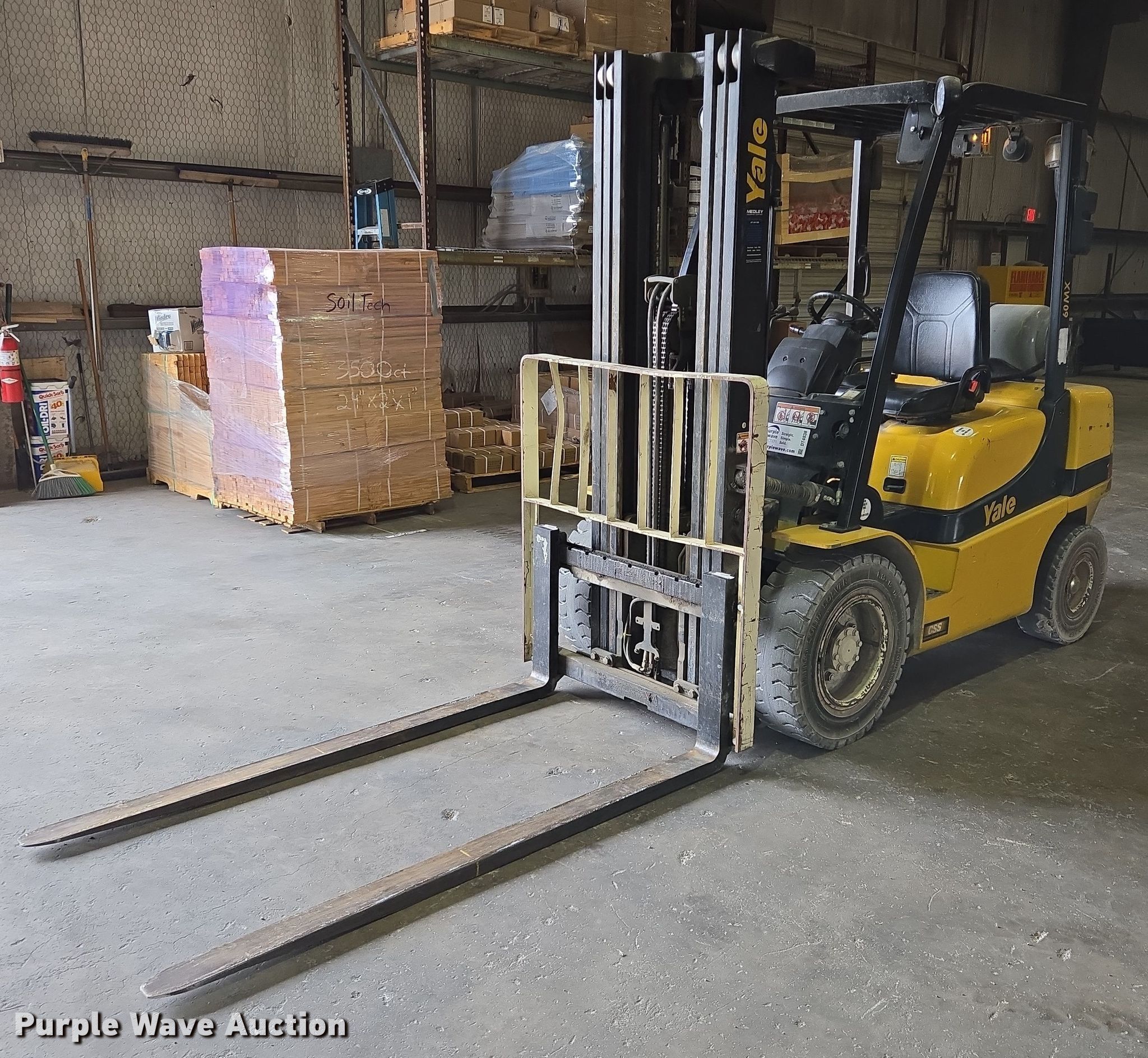Purple Wave is selling a used Cushion Tire or Pneumatic Forklift in Texas. This item is a 2016 Yale GLP060MXNEAE091 forklift with the following: Hours: 6,539 on meter, Serial: A390V01791P, Unit #: SFS2020