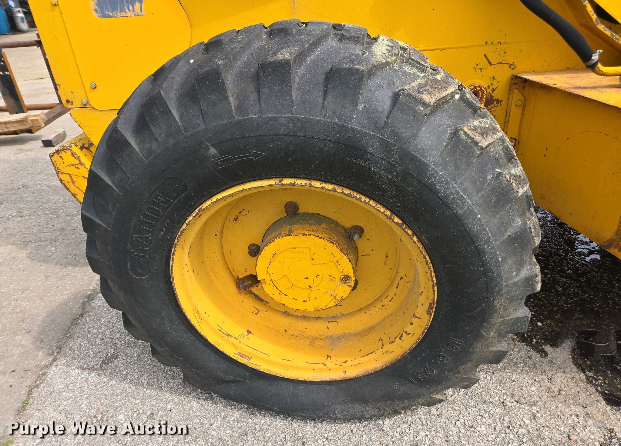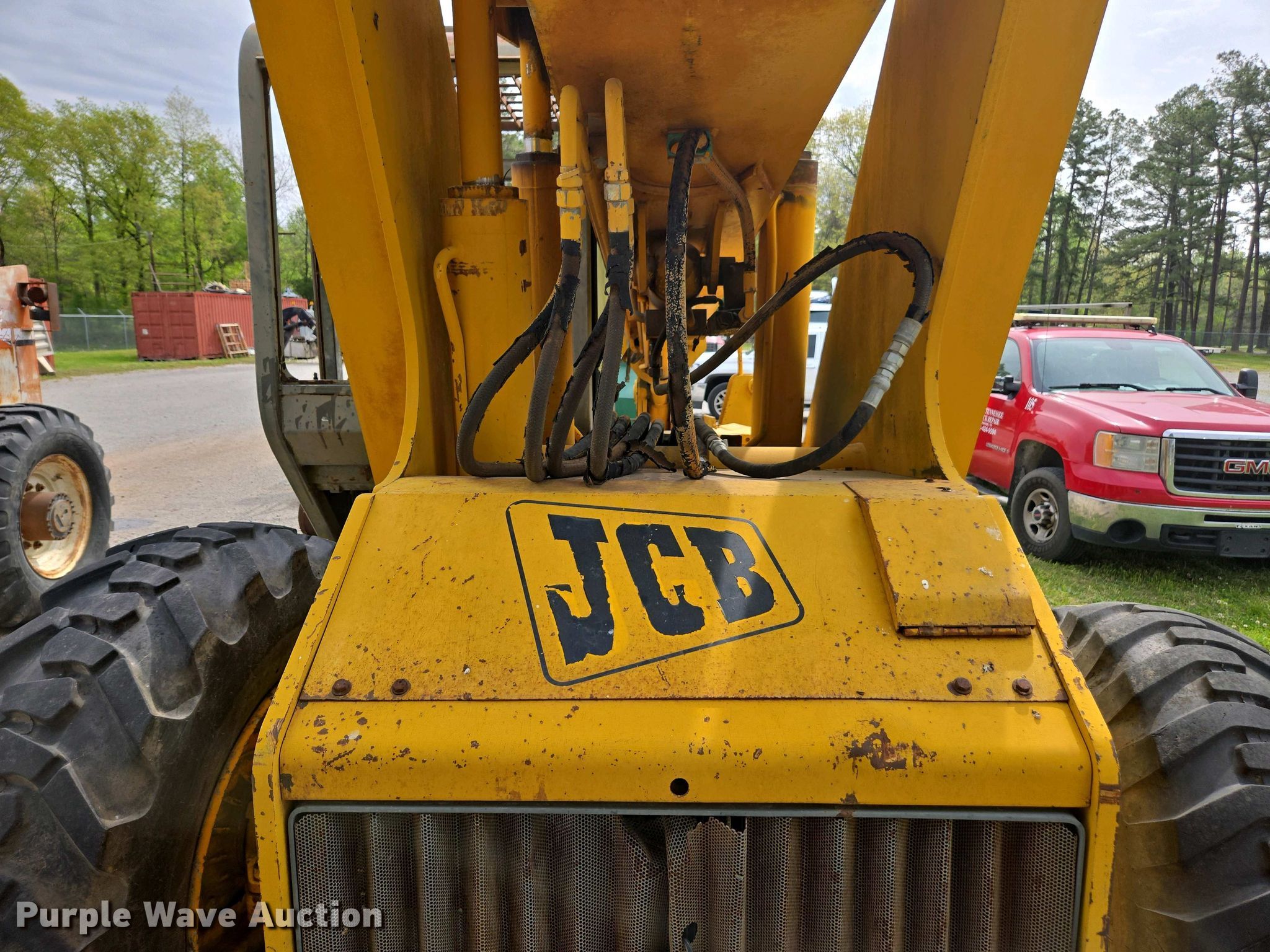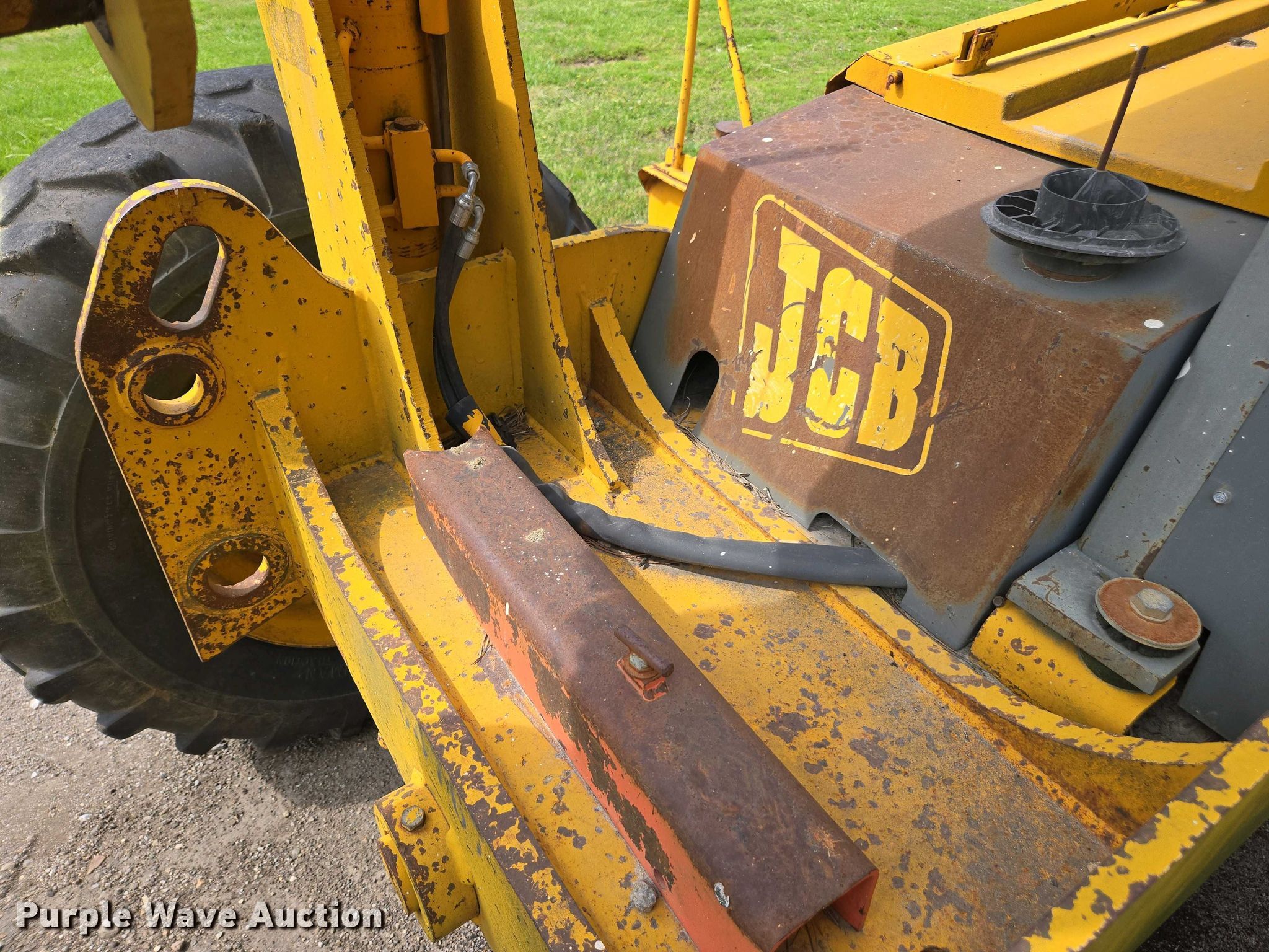 1994 JCB 506B telehandler. Hours: 6,142 on meter, Serial: USA506B0RE0572498. Engine Perkins, Cylinders: 4, Fuel type: Diesel. Transmission Shuttle shift, 3F - 3R, Four wheel drive. Operators station Canopy, Steering: Crab, Four wheel. Features Maximum lift capacity: 6,000 lbs, Maximum lift height: 36', Boom stages: 3, Fork length: 60", Auxiliary hydraulics, Hydraulic leveling, Quick attach: Manual. Tires Size: 15.5-25. Notes Hydraulic issues, leaks. Jerry's Oil Company. Denmark, TN 38305
