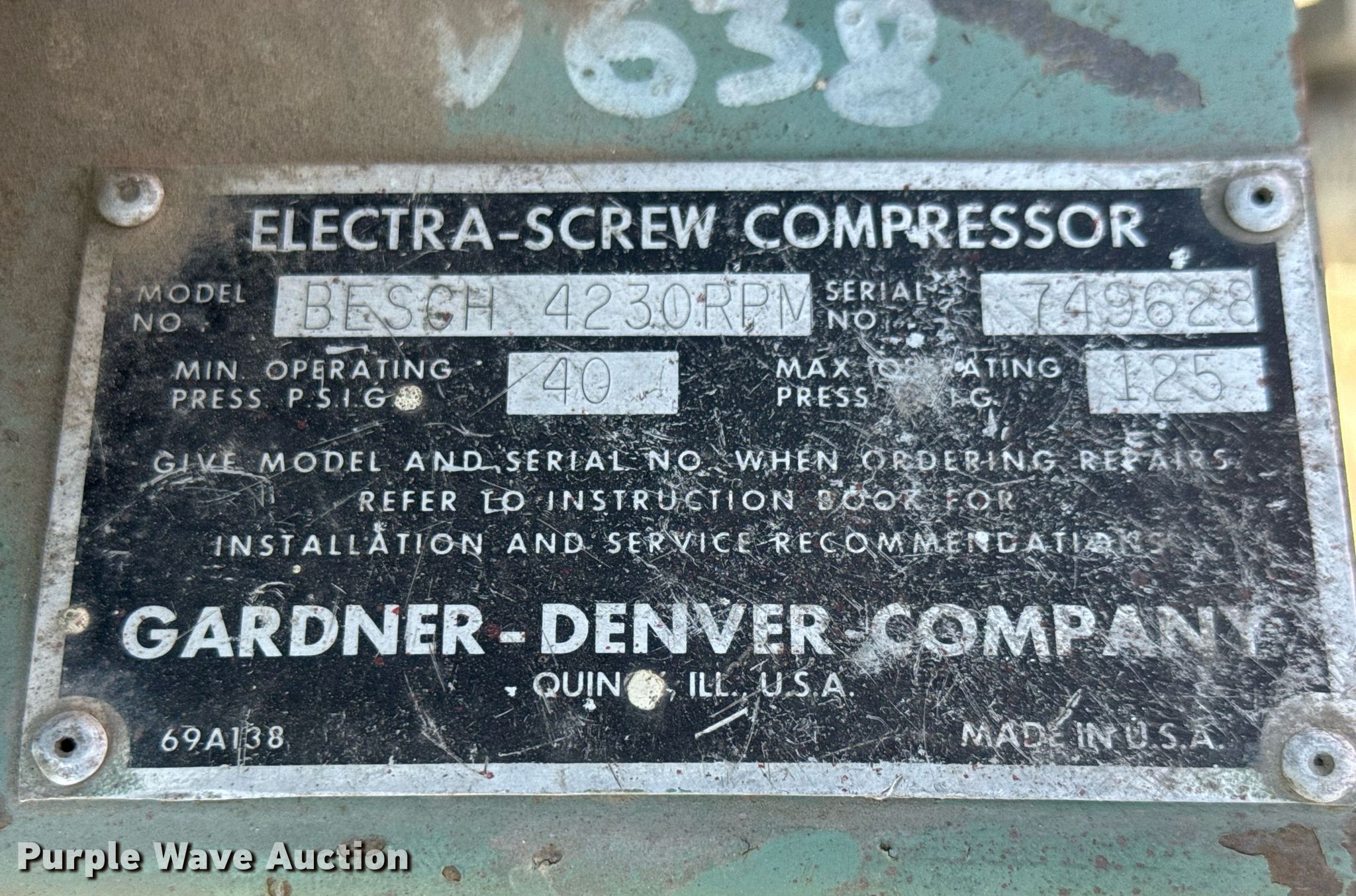 Purple Wave is selling a used Air Compressor in Kansas. This item is a (2) air compressors with the following: Gardner Denver BESCH 4230 RPM Electra-Screw, Electric motor, General Electric, Phase: 3, HP: 10,, Quincy 325, Electric motor, Baldor Reliancer, Phase: Single, HP: 5,