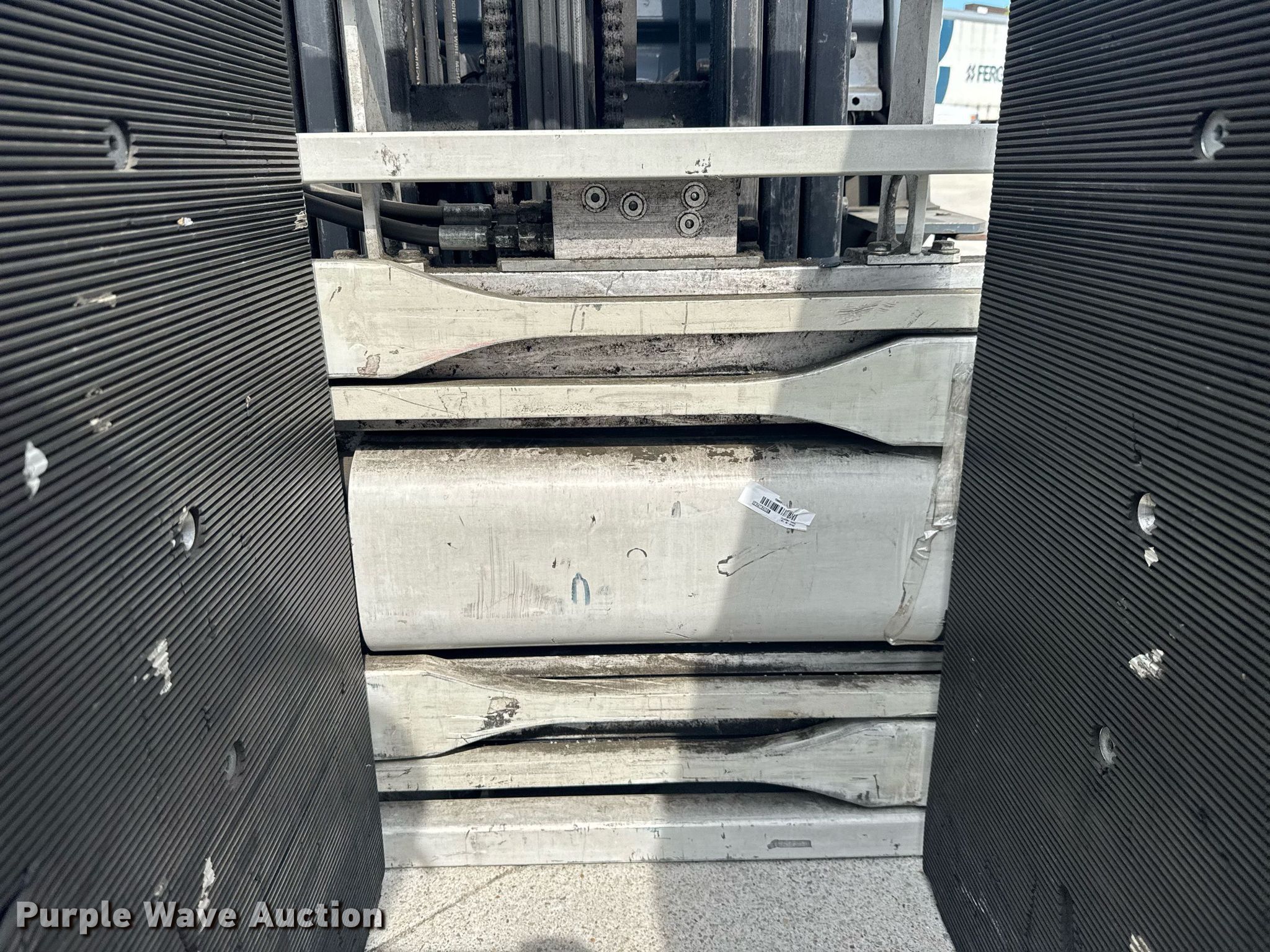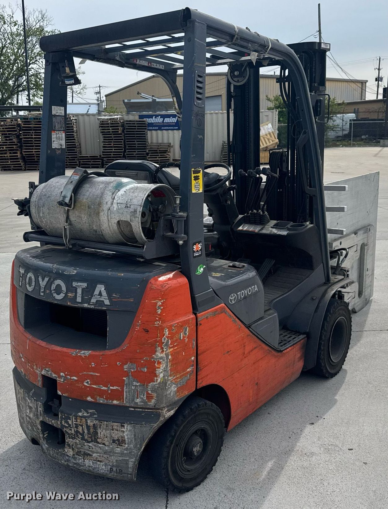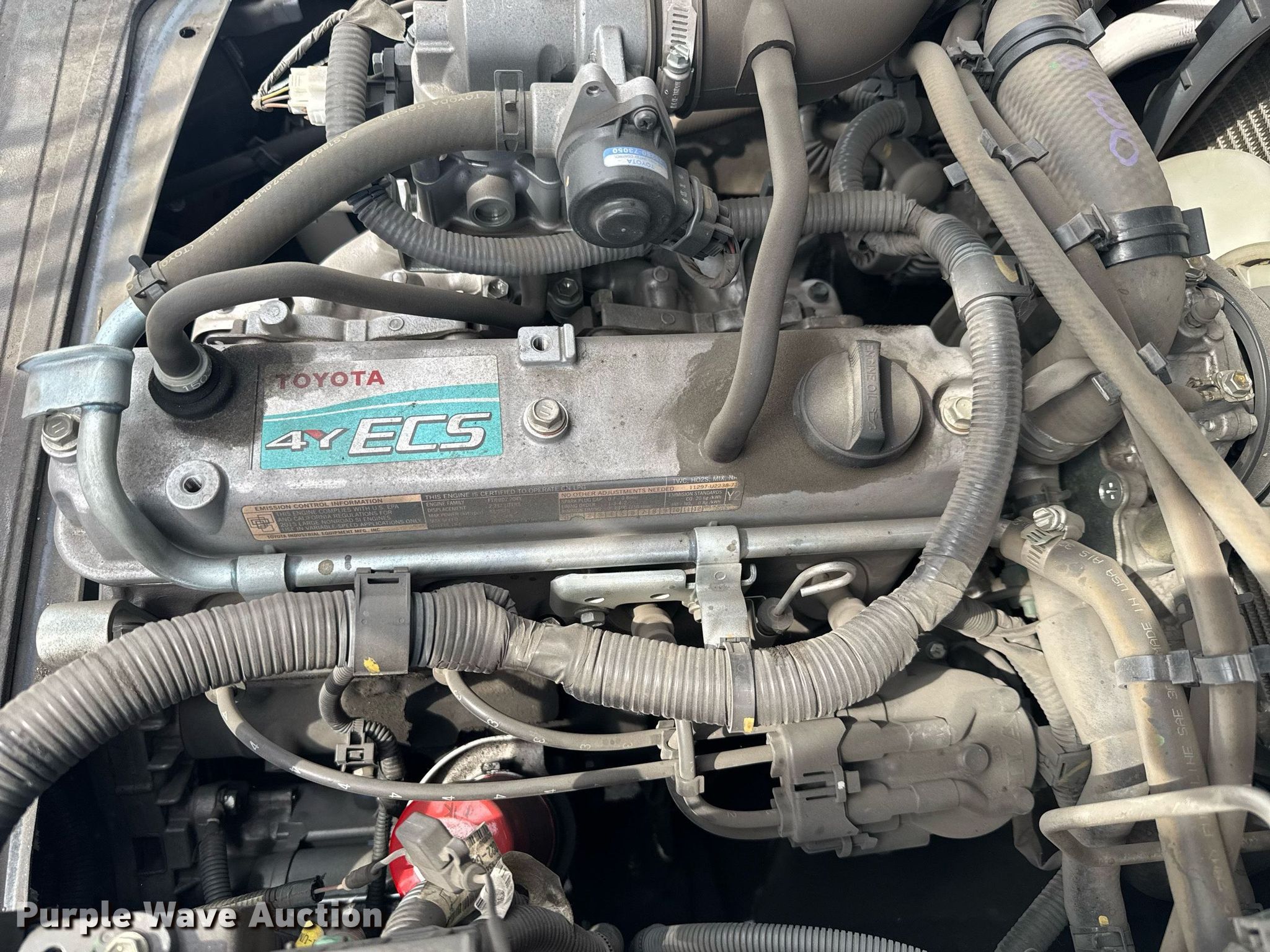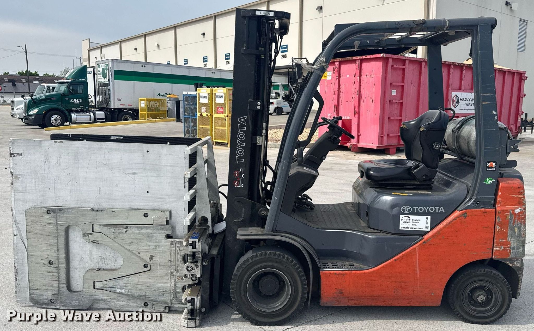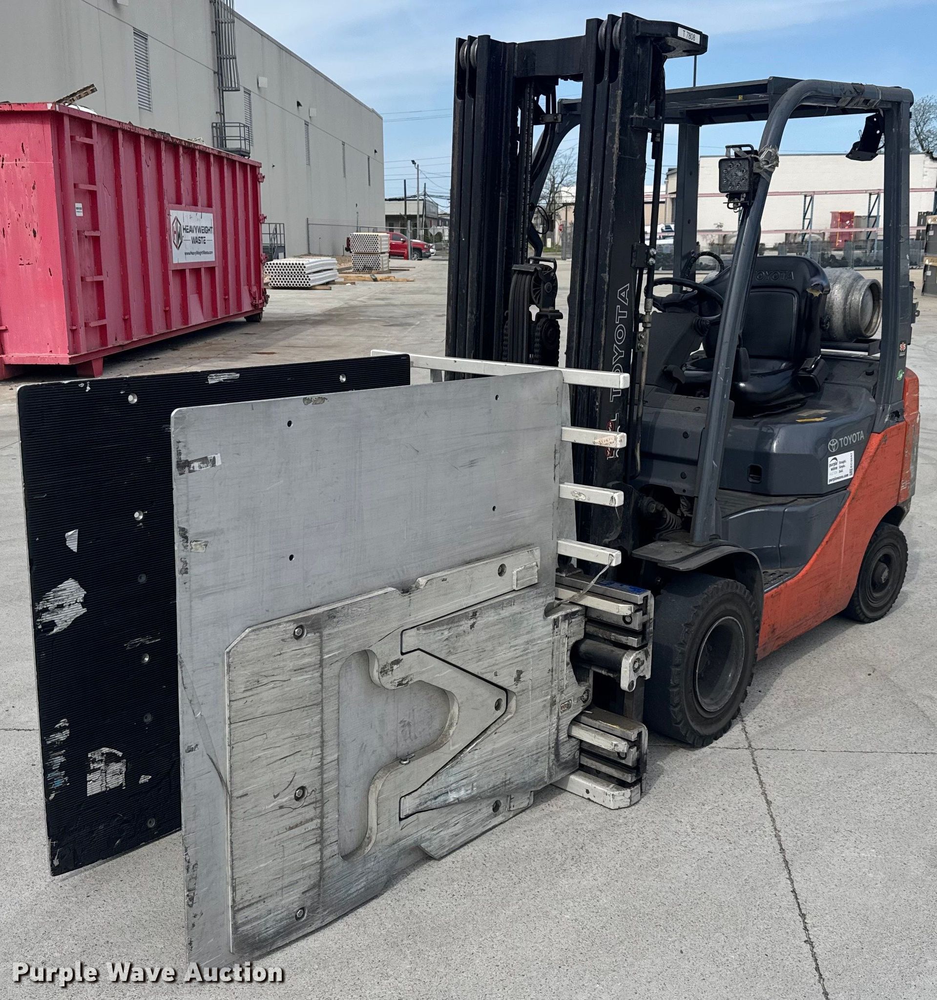 Toyota 8FGU18 forklift. Hours: 4,972 on meter, Serial: 60928, Unit #: SFS1965. Engine Toyota 4Y ECS, Displacement: 2.237L, Cylinders: 4, Fuel type: LPG LP bottle: Not included. Transmission Powershift. Operators station OROPS. Features Maximum lift capacity: 2,800 lbs, Maximum lift height: 189", Mast stages: 3, Side shift, Mast tilt, Carton clamps. Tires Front: 6.50-10, Rear: 5.00-8, Solid. Ferguson. Birmingham, AL 35222