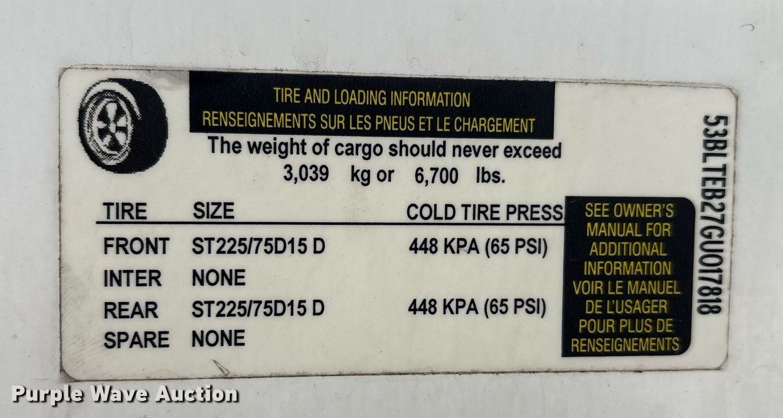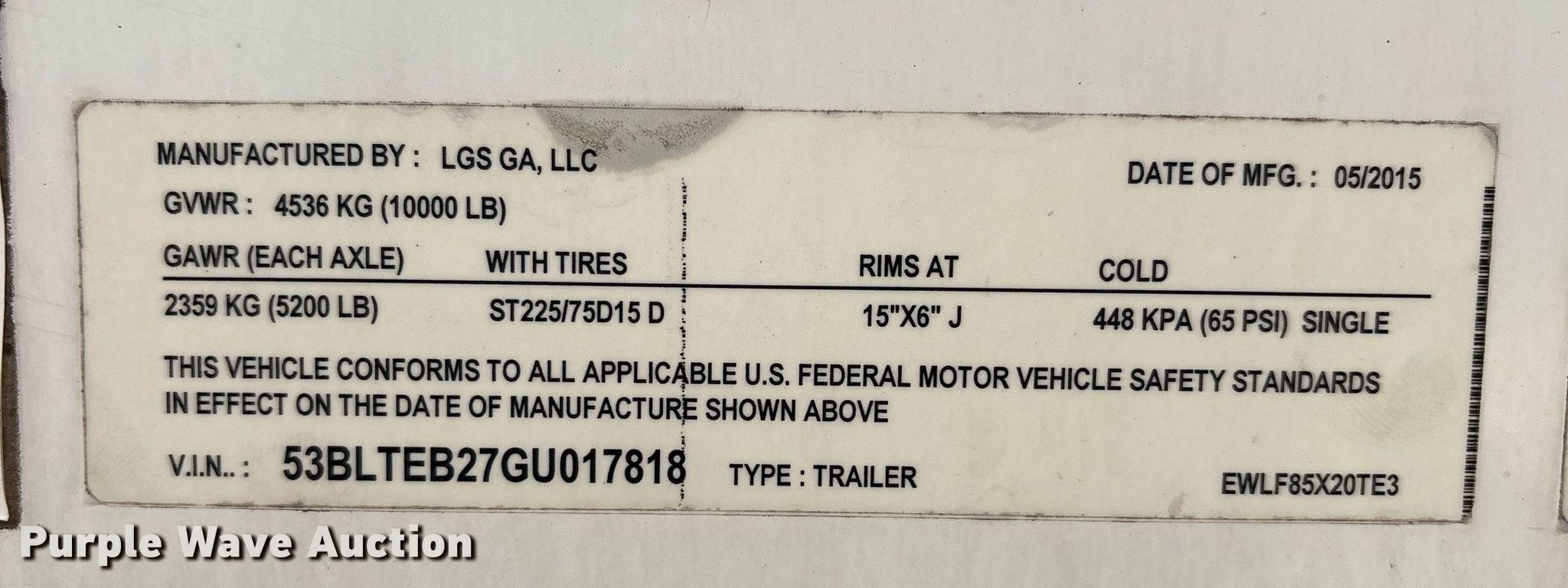 2016 LGS Trailers enclosed cargo trailer. VIN: 53BLTEB27GU017818. Dimensions Overall: 24' 6" L x 8' 6" W, Body: 21' 6" L x 8' 6" W, Rear door / ramp 77" L x 95" W. Features Deck type: Wood. Chassis Ball hitch: 2 5/16", Landing gear: Single, Suspension: Spring, Brakes: Electric, Axles: Tandem, GVWR: 10,000 lbs, GAWR: 5,200 lbs. Tires Steel wheels, Size: 225/75R15. Texas title. Title distribution may be delayed up to 14 days from verification of funds. Fort Worth, TX 76179