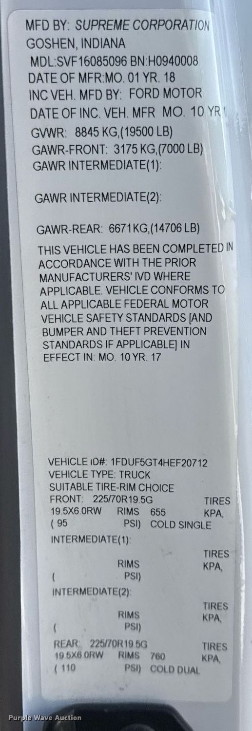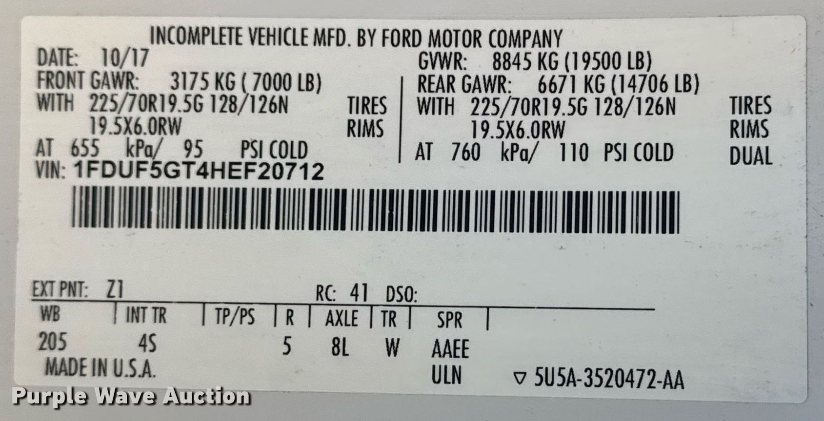 2017 Ford F550 Super Duty box truck. Miles: 237,112 on odometer, VIN: 1FDUF5GT4HEF20712. Engine Ford, Displacement: 6.7L, Cylinders: 8, Fuel type: Diesel. Transmission Automatic. Chassis Axles: Single, Suspension: Spring, Brakes: Hydraulic, GVWR: 19,500 lbs, Wheelbase: 205". Interior AC, Heat, Heated mirrors, Power windows, Power locks, Cruise control, Auxiliary controls. Features Box bed Supreme Corp, 16' L x 96" W x 90" H, Floor: Wood. Tires Size: 225/70R19.5. Notes Shelving included, Dash warning indicator: Airbag. Oklahoma title. Seller is an Oklahoma licensed motor vehicle dealer. Title will be assigned and distributed by the dealer. Please contact the seller for distribution questions. Title distribution may be delayed up to 30 days from verification of funds. 15107 North 137th East Avenue. Collinsville, OK 74021