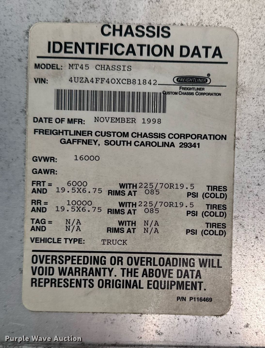 1999 Freightliner MT45 delivery truck. Miles: 248,523 on odometer, VIN: 4UZA4FF40XCB81842. Engine Model: BT5.9/ISB, Displacement: 5.9L, Fuel type: Diesel. Transmission Automatic. Chassis Axles: Single, Suspension: Spring, Brakes: Hydraulic, GVWR: 16,000 lbs. Interior AC, Heat, Backup camera. Features Box bed 14' 2" L x 88" W x 87" H, Floor: Aluminum. Tires Size: 225/70R19.5. Oklahoma classic title. Seller is an Oklahoma licensed motor vehicle dealer. Title will be assigned and distributed by the dealer. Please contact the seller for distribution questions. Title distribution may be delayed up to 30 days from verification of funds. 15107 North 137th East Avenue. Collinsville, OK 74021