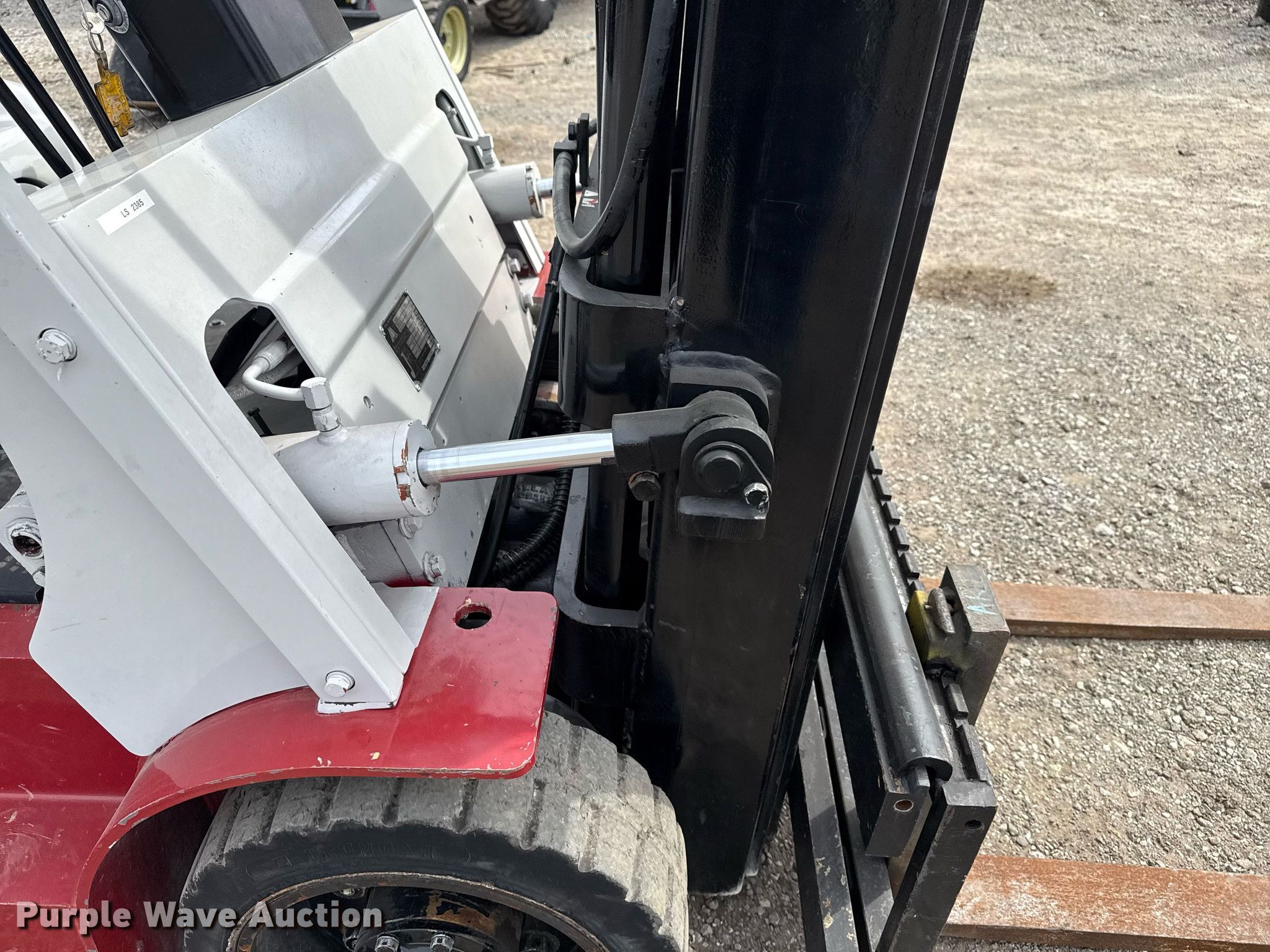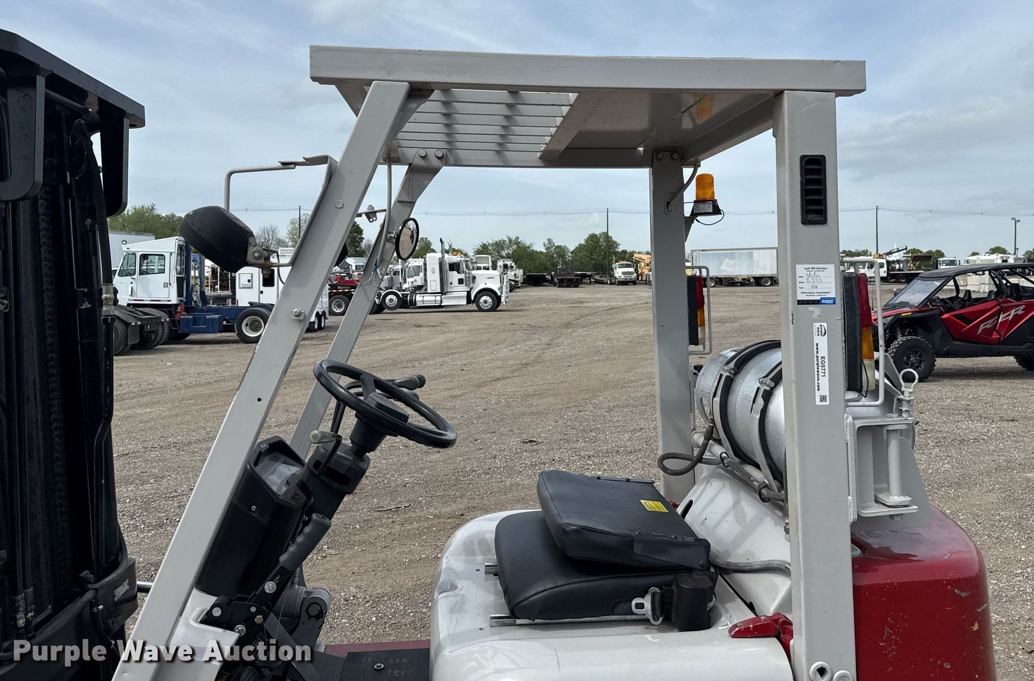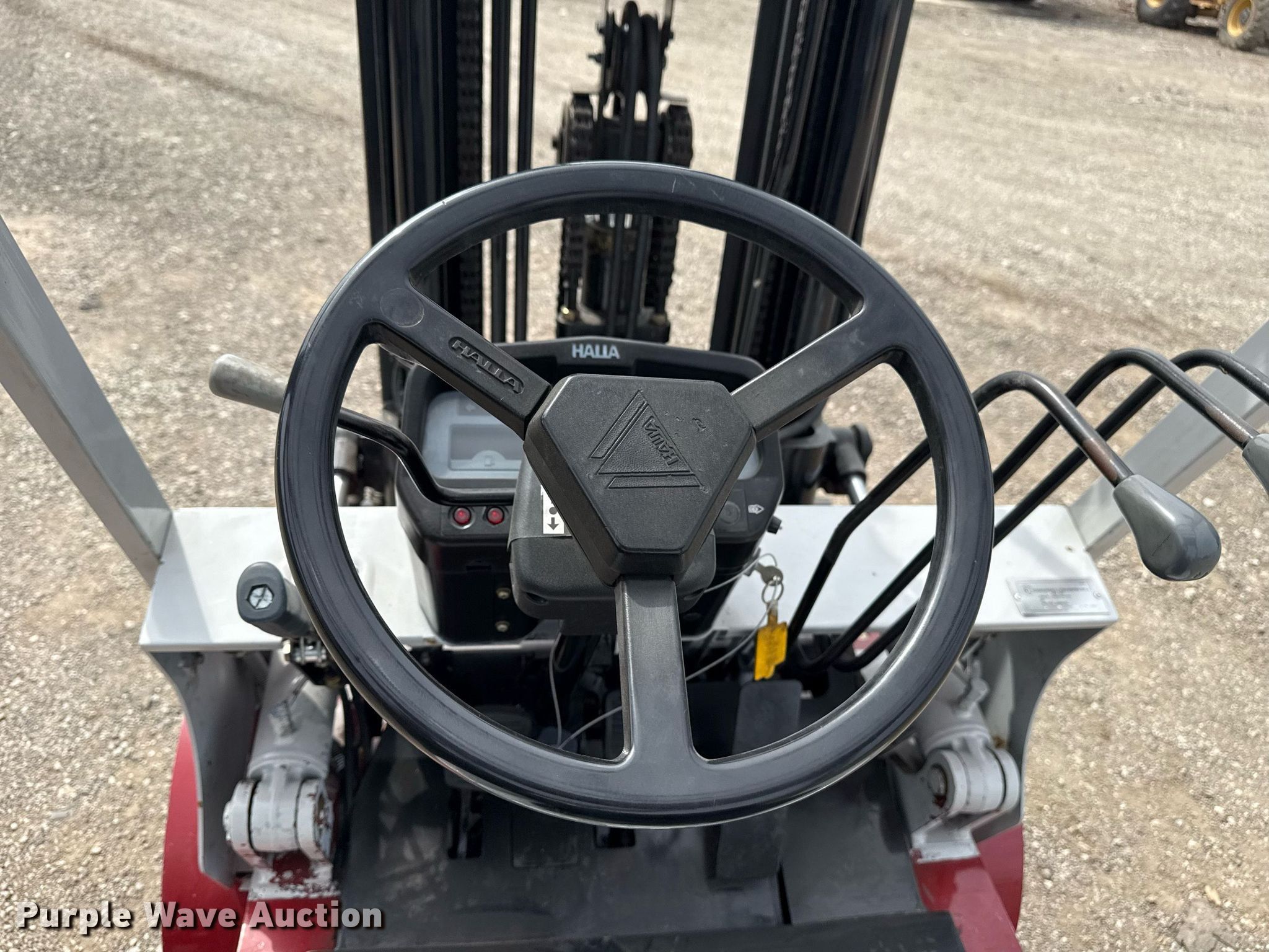 Halla LF25C forklift. Hours: 2,481 on meter, Serial: 147LK. Engine Cylinders: 4, Fuel type: LPG LP bottle: Included. Transmission Powershift, 1F - 1R. Operators station Canopy. Features Maximum lift capacity: 4,400 lbs, Maximum lift height: 185", Side shift, Mast tilt, Fork length: 42". Tires Front: 21x7x15, Rear: 16x6, Solid. 15107 North 137th East Avenue. Collinsville, OK 74021