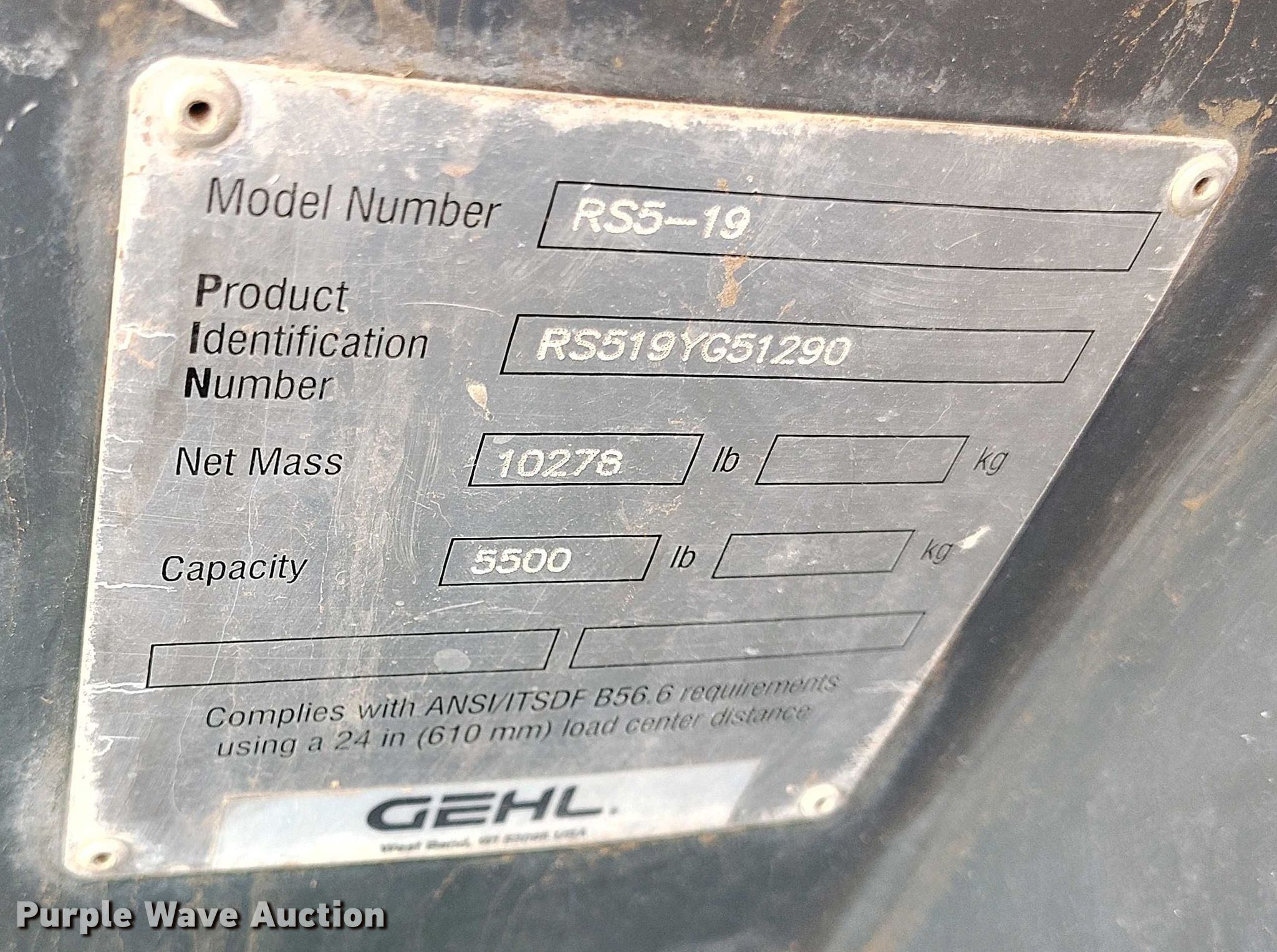 Purple Wave is selling a used Telehandler in Colorado. This item is a Gehl RS5-19 telehandler with the following: Hours: 4,918 on meter, Miles or hours may vary, unit still in use, Serial: RS519YG51290, Unit #: SFS1981
