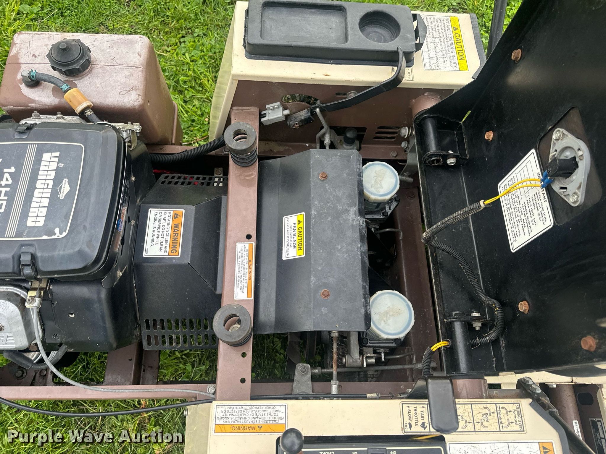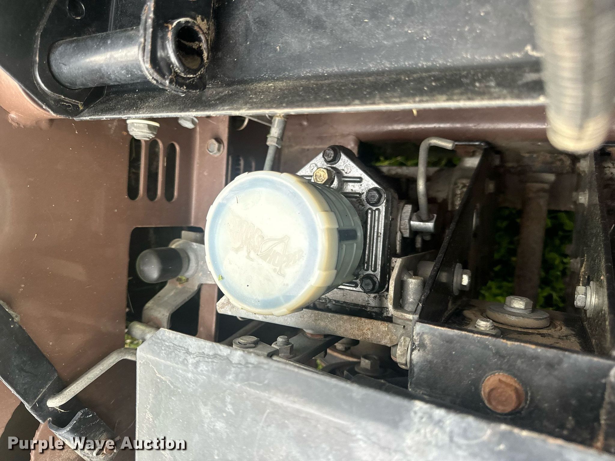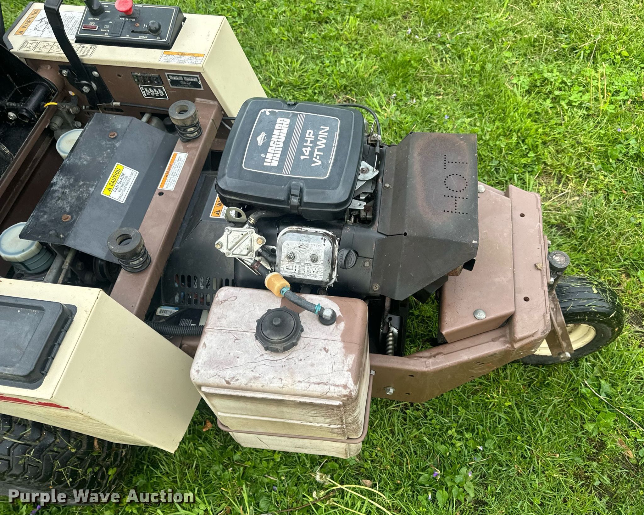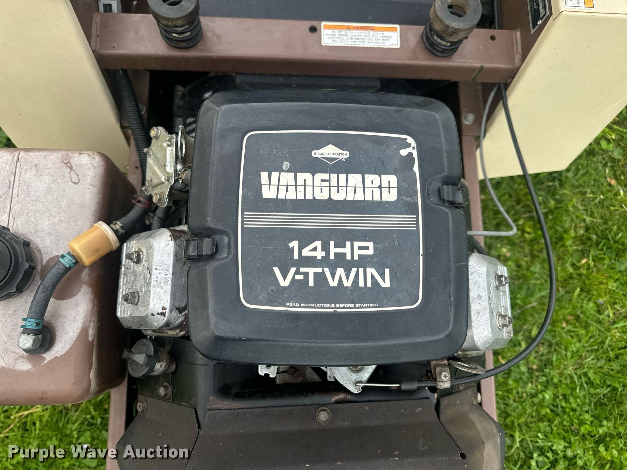Grasshopper 614 ZTR lawn mower. Cutting width: 44", Serial: 475338. Engine Briggs & Stratton Vanguard, Cylinders: 2, Fuel type: Gas, HP: 14. Transmission Hydrostatic. Tires Front: 18x8.50-8, Rear: 13x5.00-6, Deck tires: 9x3.50-4. Notes Rust damage. Marshall, MO 65340