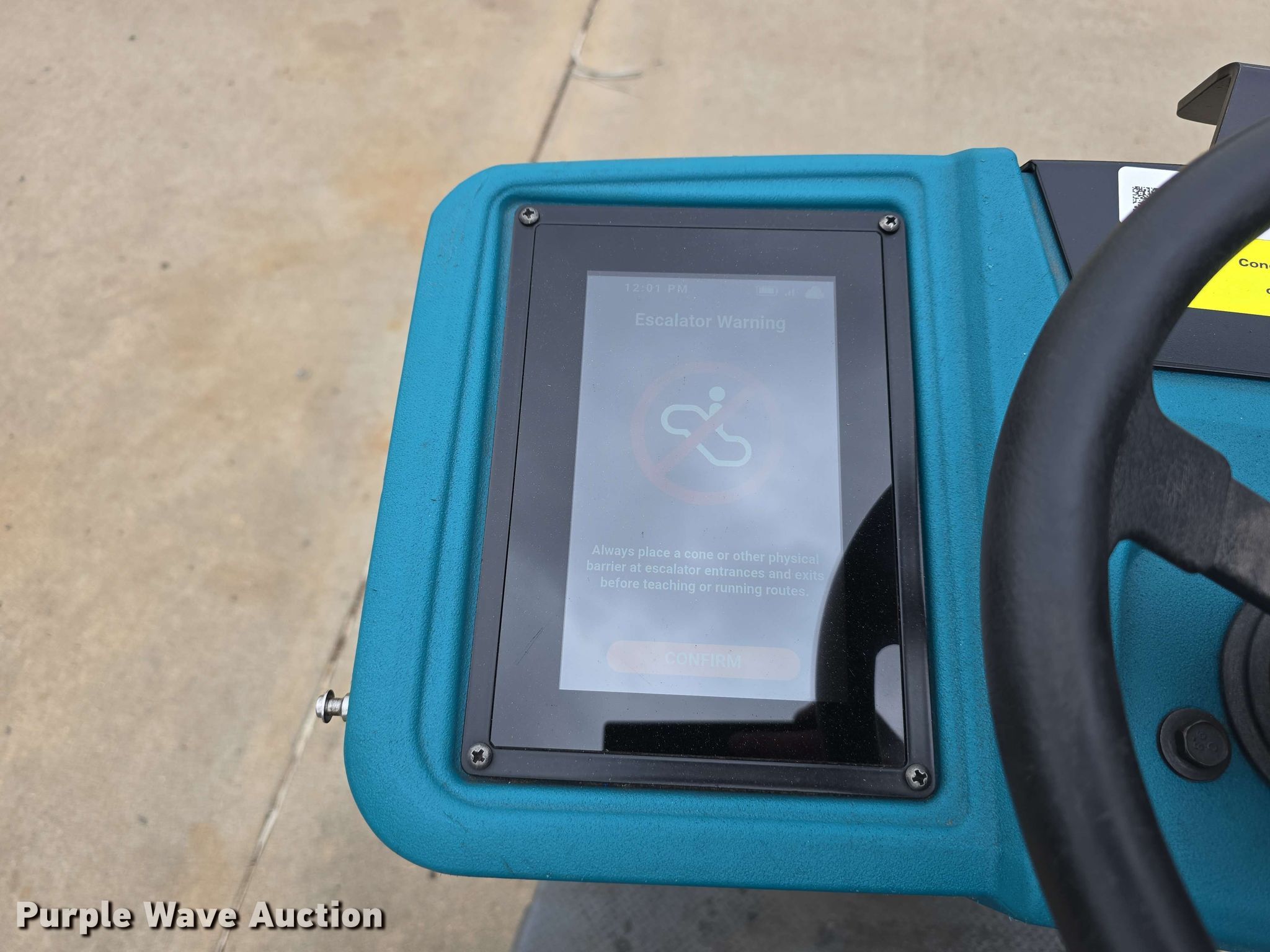2019 Tennant T7AMR floor scrubber. Hours: 2,738 on meter, Serial: T7AMR-10944134. Electric motor Volts: 24. Transmission Hydrostatic. Features BrainOs autonomous system, Water spray system, Sweeper bed Sweeper bed type: Vacuum, Cleaning width: 26", Solution tank Capacity: 29 gallons, Recovery tank Capacity: 29 gallons. Tires Solid. Notes Scrubber pads missing, Non-operational scrubber system, autonomous function. Nebraska Commercial Equipment. Papillion, NE 68046
