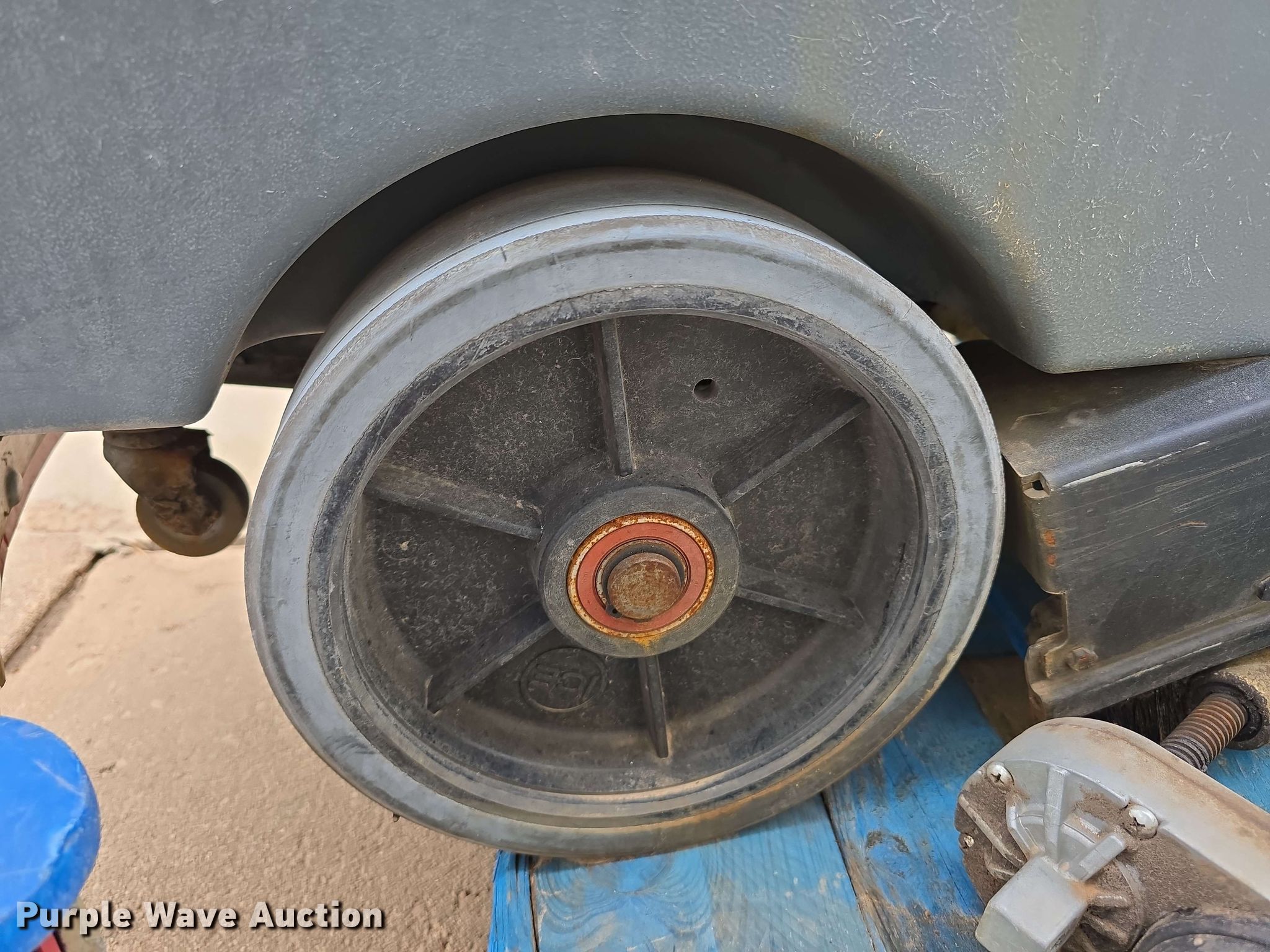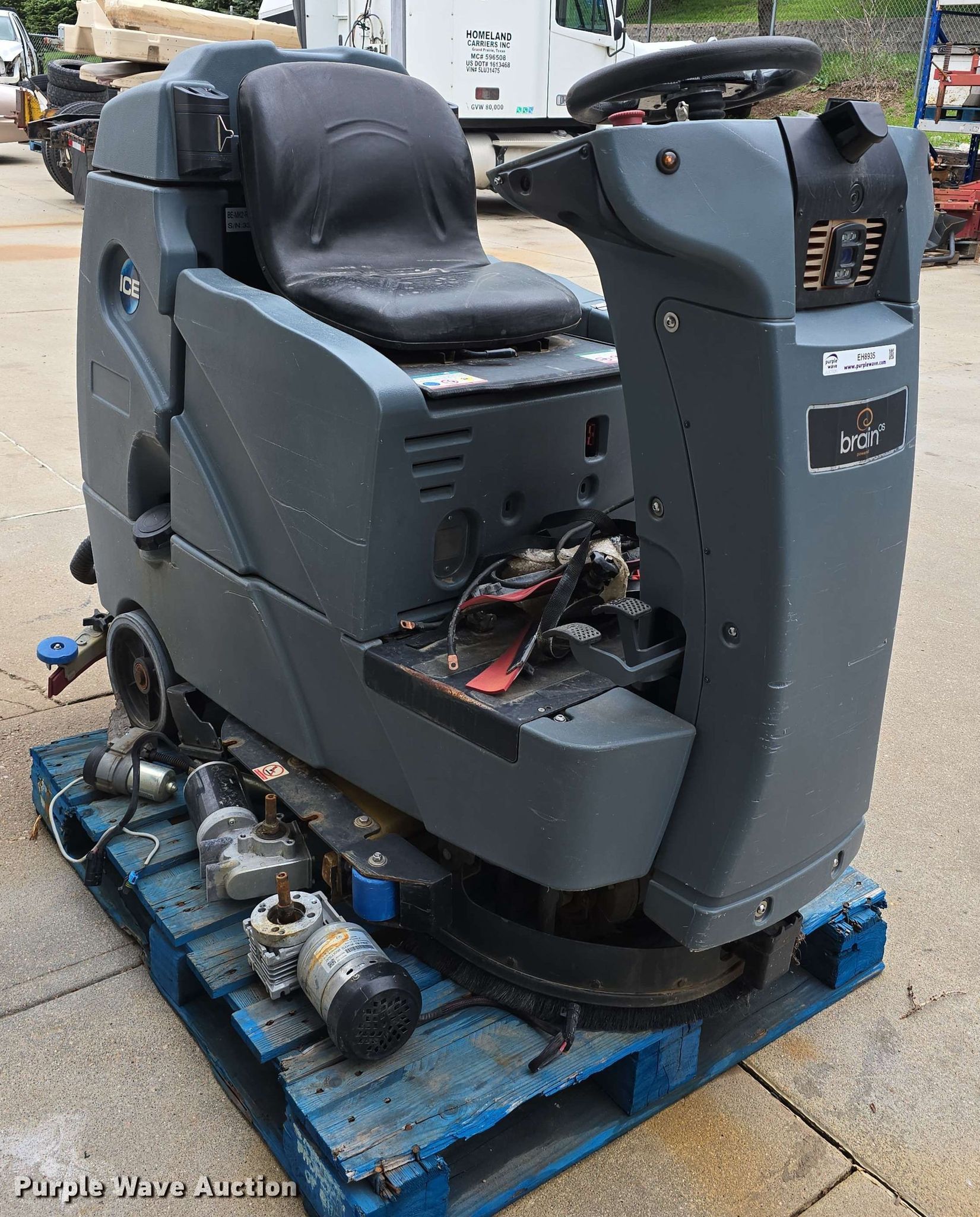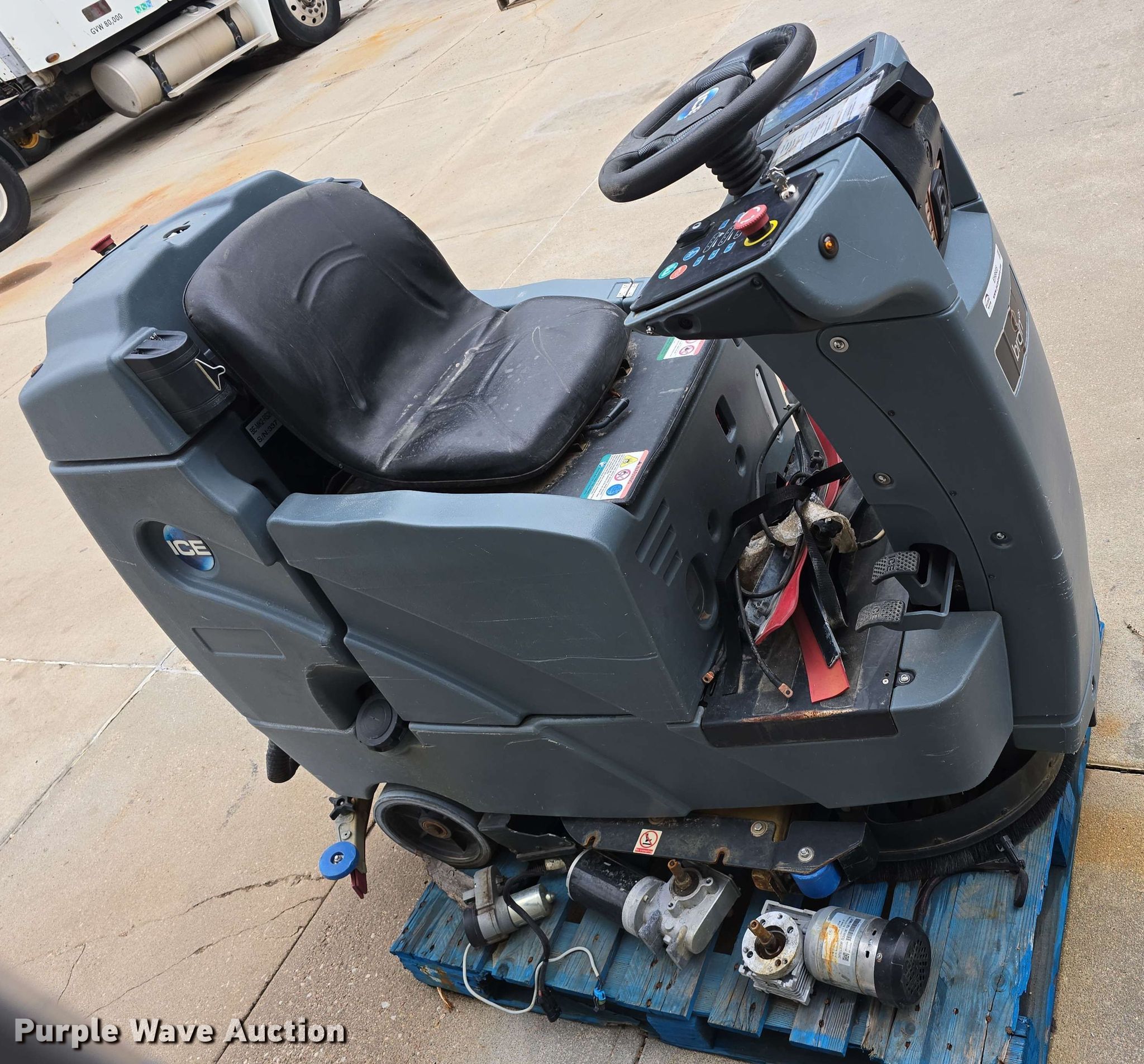 ICE BE-MK2-RS26 floor scrubber. Serial: 337. Transmission Hydrostatic. Features Volts: 24, Sweeper bed Sweeper bed type: Vacuum. Tires Solid. Notes Parts missing, Batteries missing, Scrubber brooms missing, Non-operational unit. Nebraska Commercial Equipment. Papillion, NE 68046