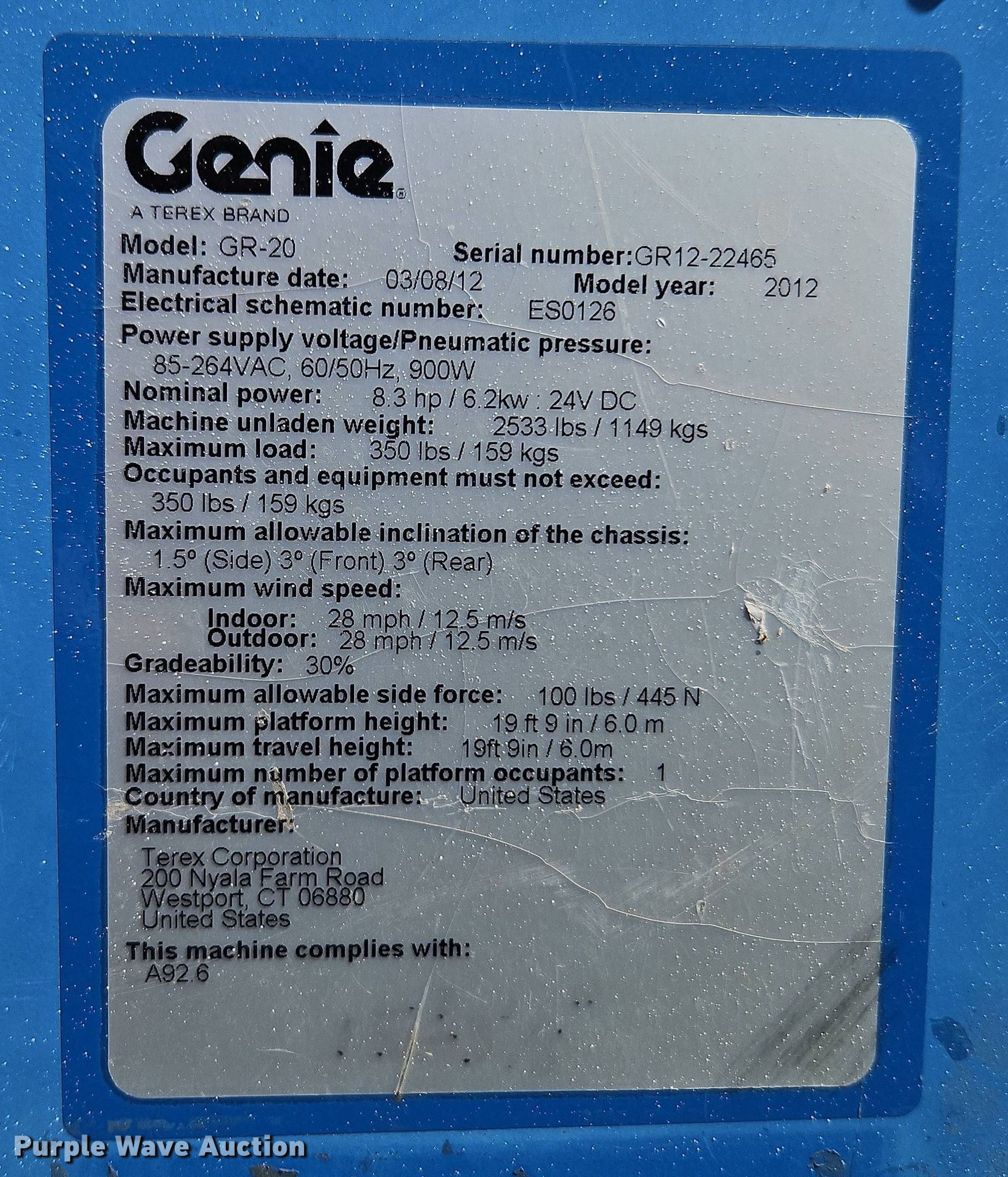 Purple Wave is selling a used Scissor or Vertical Lift in Missouri. This item is a 2012 Genie GR-20 vertical lift with the following: Hours: Unknown