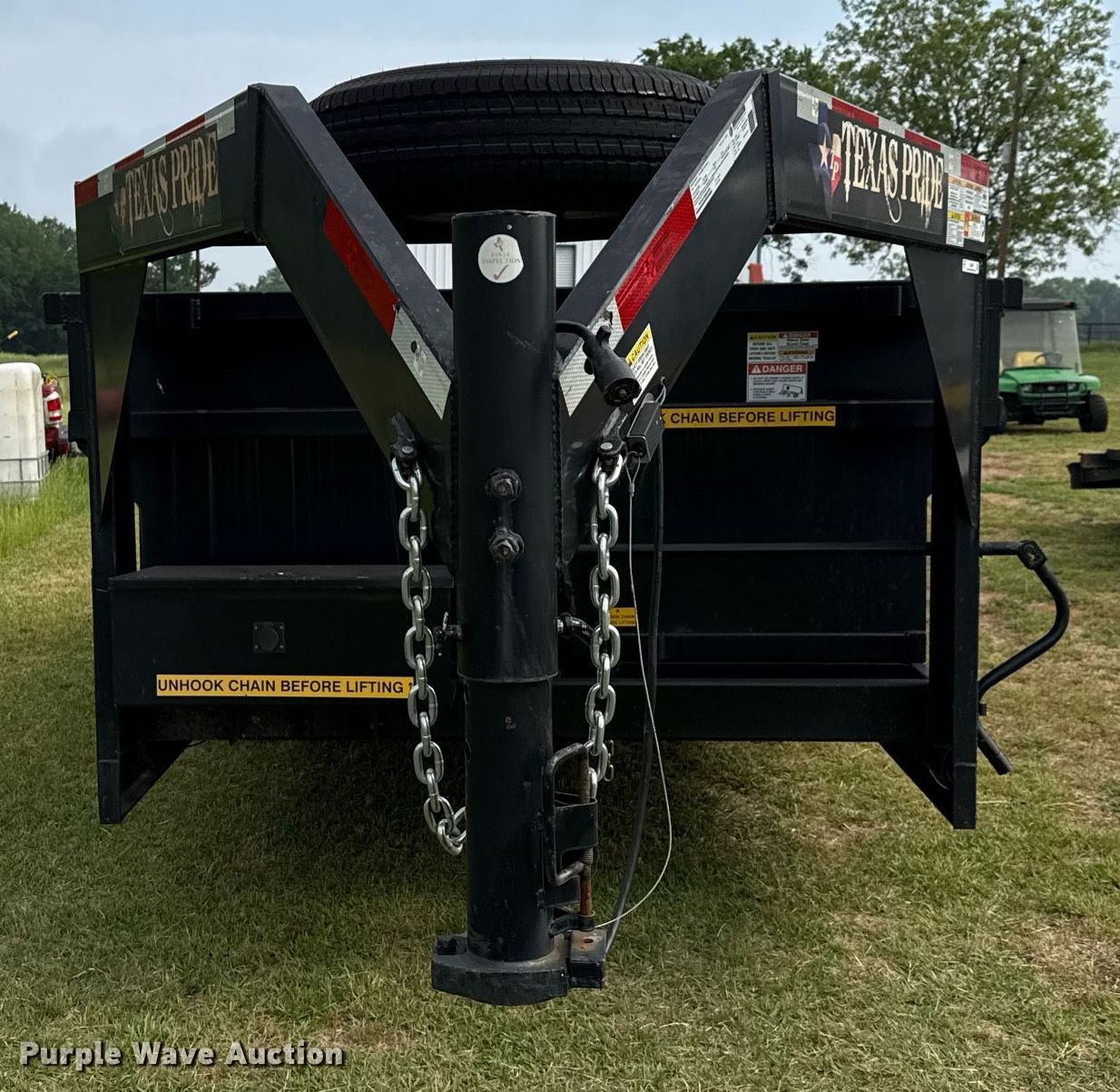 2021 Texas Pride DT714316KGN dump trailer. VIN: 7HCGD1426MB025354. Dimensions Overall: 22' 4" L x 103" W, Body: 17' L x 82" W, Side height: 36". Features Body type: Steel, Ram: Single, End gate: Manual, Trailer controls. Chassis Hitch: Gooseneck, Landing gear: Single, Suspension: Spring, Brakes: Electric, Axles: Tandem, GVWR: 16,000 lbs, GAWR: 8,000 lbs. Tires Steel wheels, Size: 235/85R16. Texas title. Title distribution may be delayed up to 14 days from verification of funds. Bremond, TX 76629
