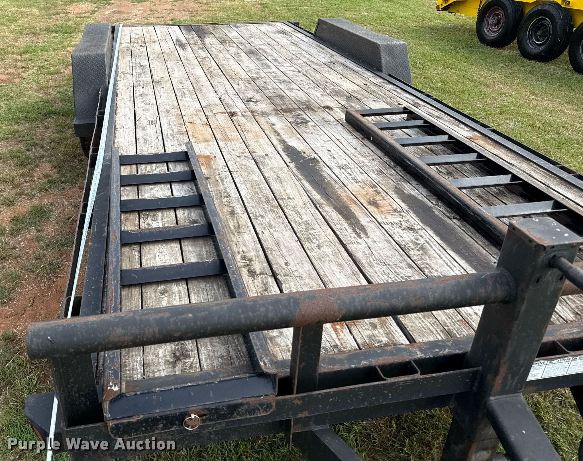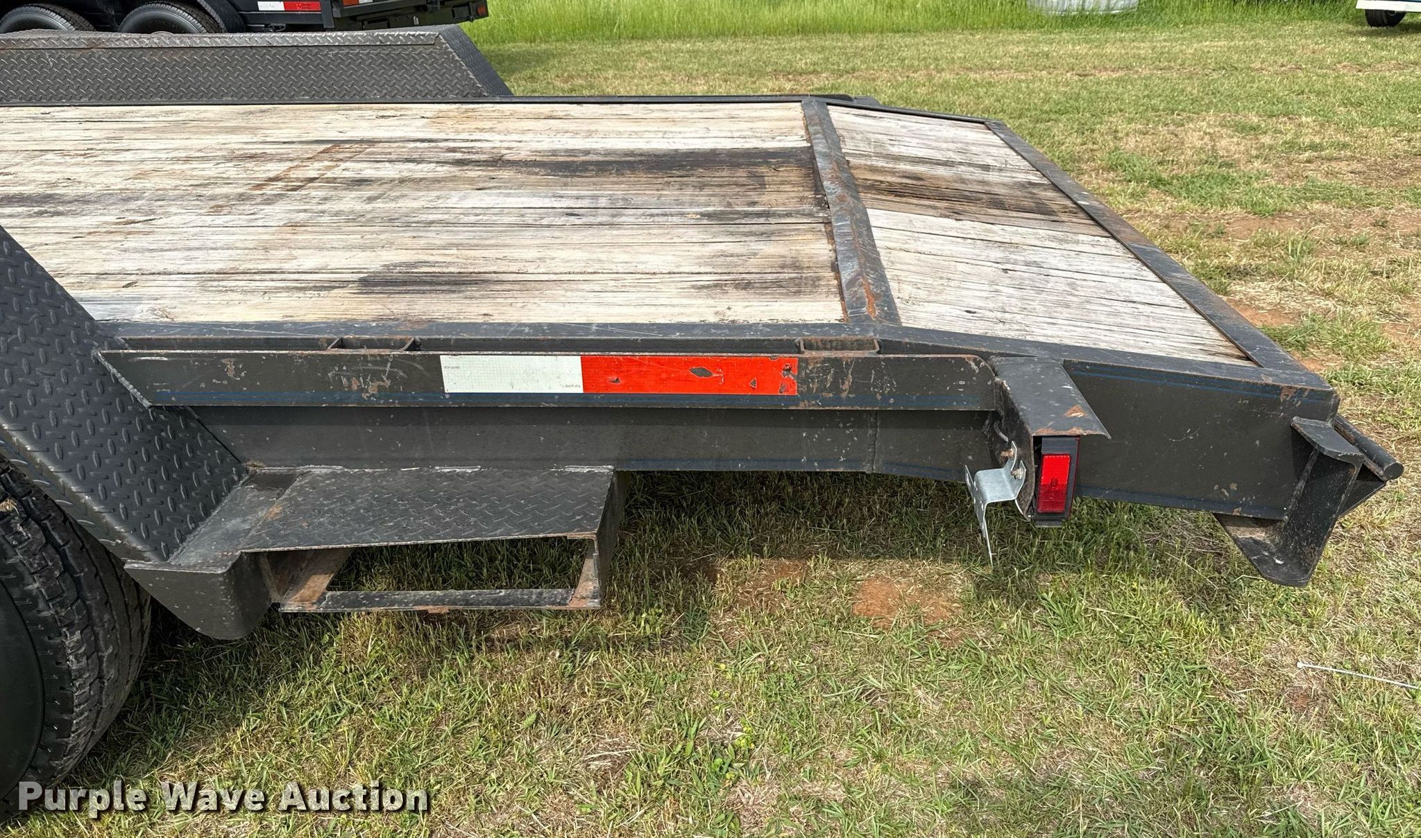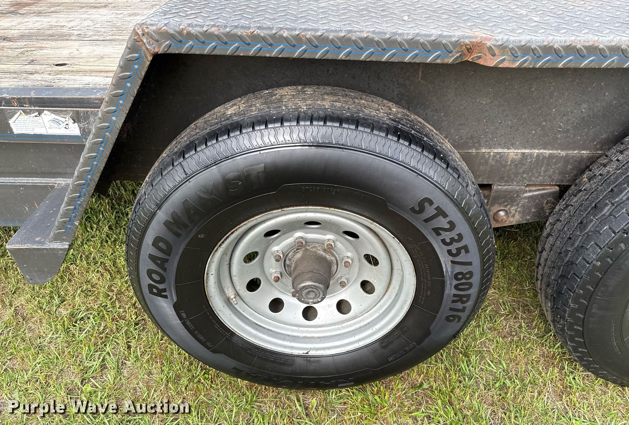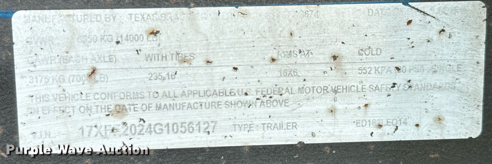 2016 Texas Bragg ED182LEO14 utility trailer. VIN: 17XFF2024G1056127. Dimensions Overall: 24' L x 102" W, Deck: 18' L x 83" W, Deck height: 27", Tail length: 2', Ramps: Manual Length: 60". Features Deck type: Wood. Chassis Ball hitch: 2 5/16", Landing gear: Single, Suspension: Spring, Brakes: Electric, Axles: Tandem, GVWR: 14,000 lbs, GAWR: 7,000 lbs. Tires Steel wheels, Size: 235/80R16. Texas title. Title distribution may be delayed up to 14 days from verification of funds. Bremond, TX 76629