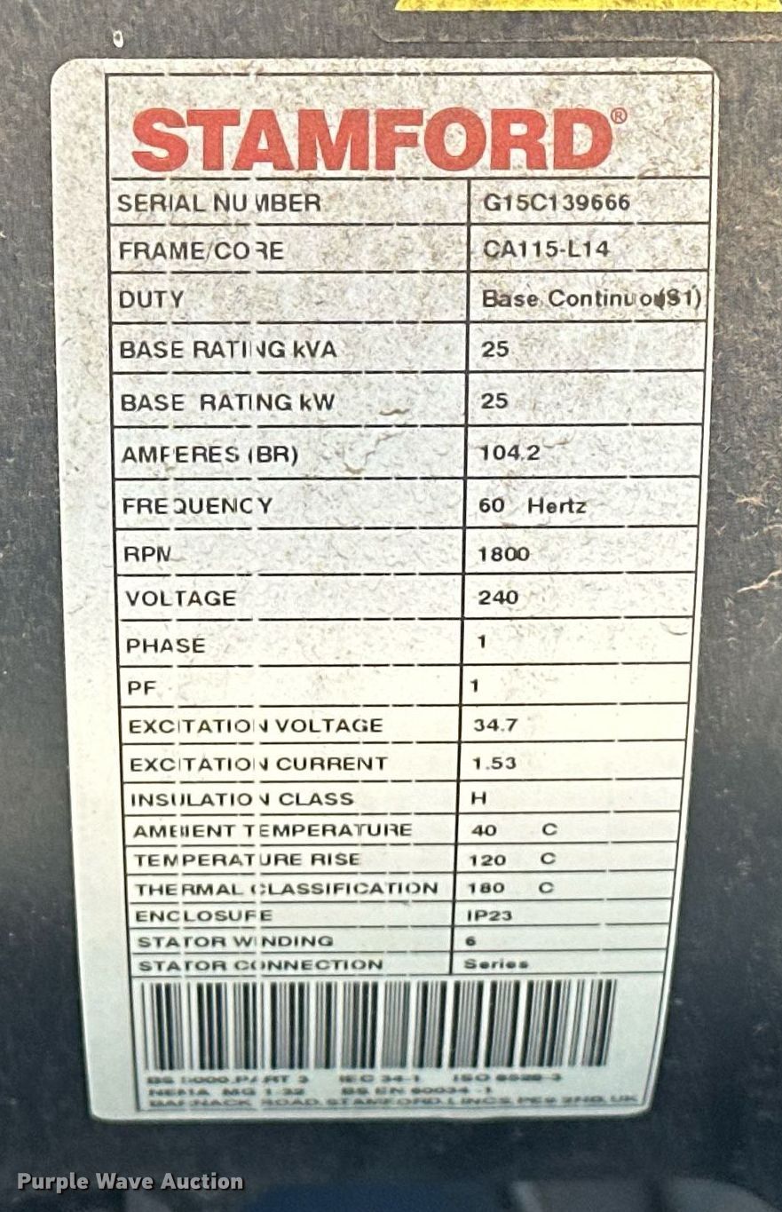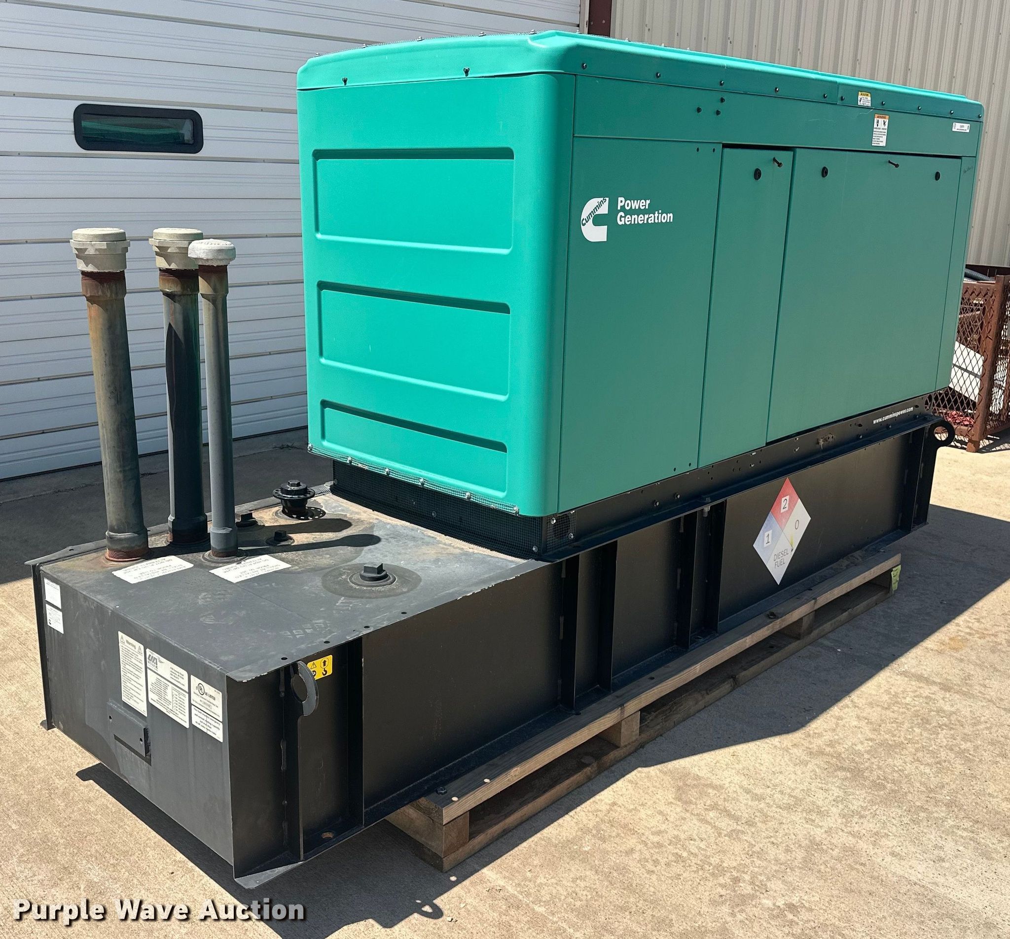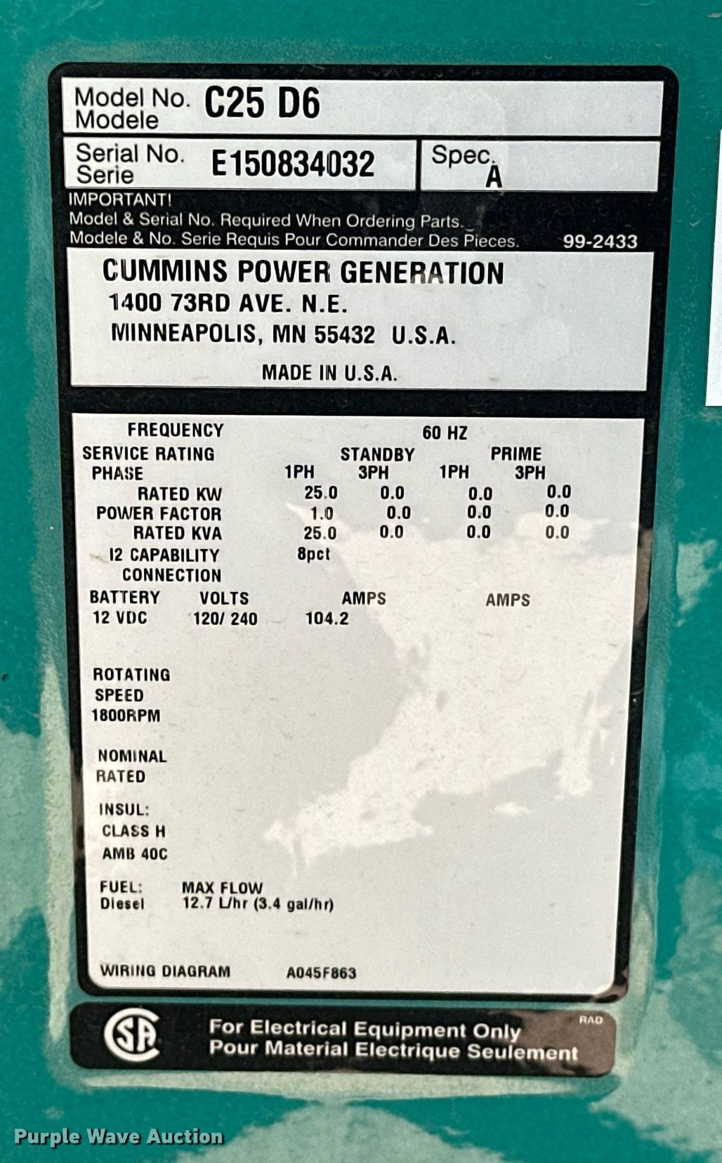 2015 Cummins C25 D6 generator. Hours: 220 on meter, Serial: E150834032. Engine Cummins 4BT3.3G5, Serial: 72018693, Displacement: 3.261L, Cylinders: 4, Fuel type: Diesel. Features Generator Cummins, kVA: 25, kW: 25, Phase: Single, Electric start, Fuel tank, Skid mounted. Notes Battery included. Pioneer Telephone Company. Kingfisher, OK 73750