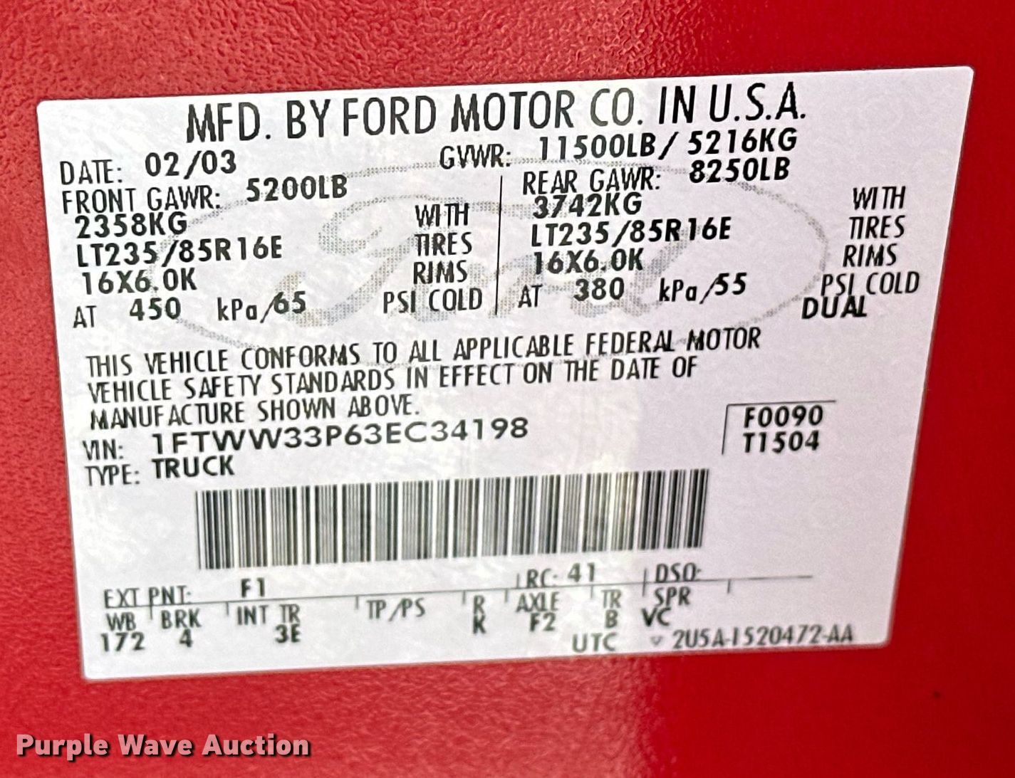 Purple Wave is selling a used 3/4 or 1 Ton Pickup or Van in Oklahoma. This item is a 2003 Ford F350 Super Duty Crew Cab pickup truck with the following: Miles: 232,921 on odometer, VIN: 1FTWW33P63EC34198, Insurance salvage unit claim #: 5-800616
