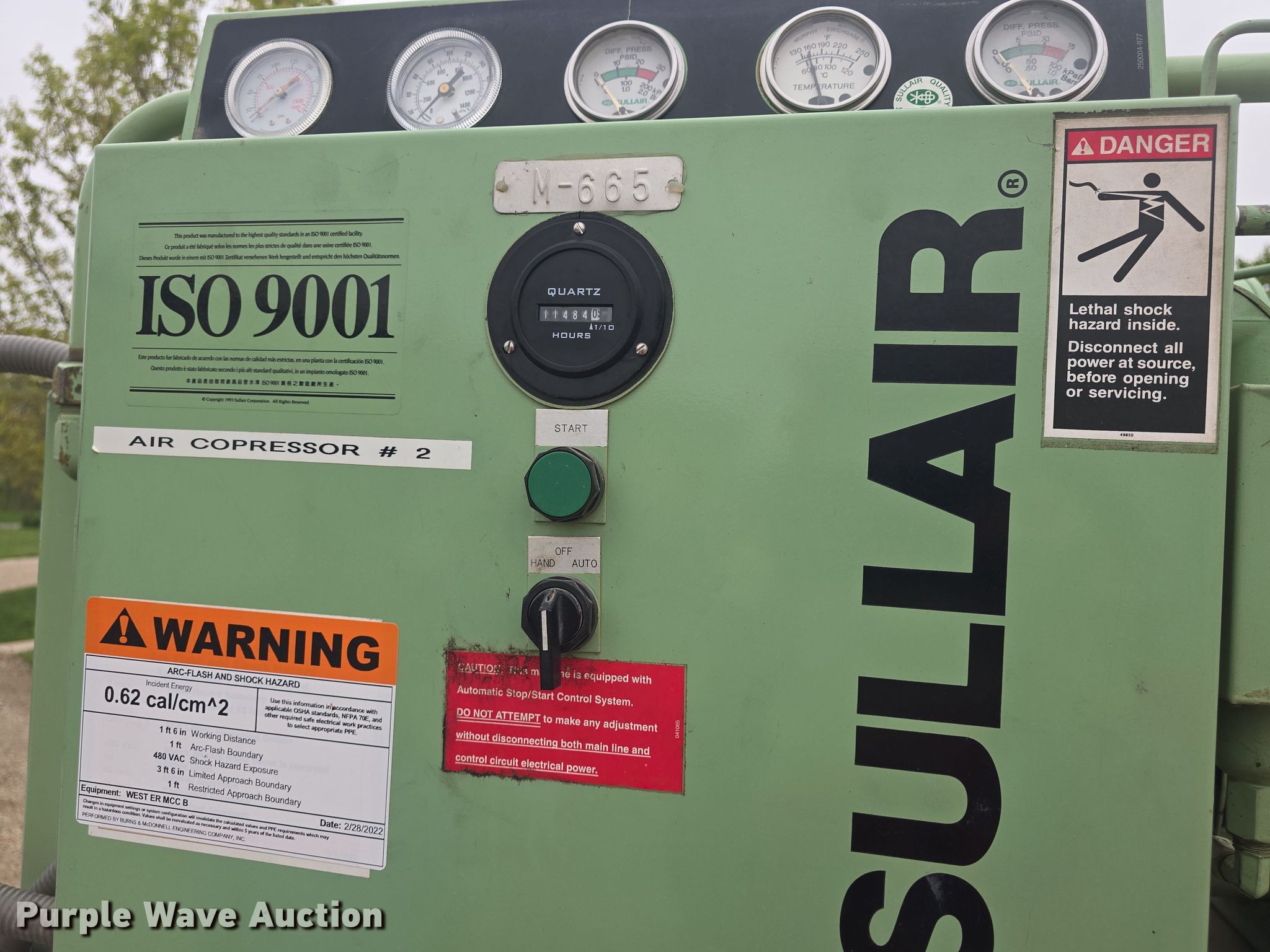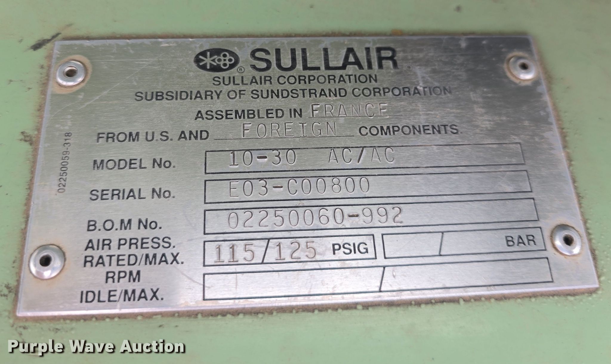 Purple Wave is selling a used Air Compressor in Kansas. This item is a Sullair 10-30 AC/AC air compressor with the following: Hours: 11,484 on meter, Serial: E03-C00800