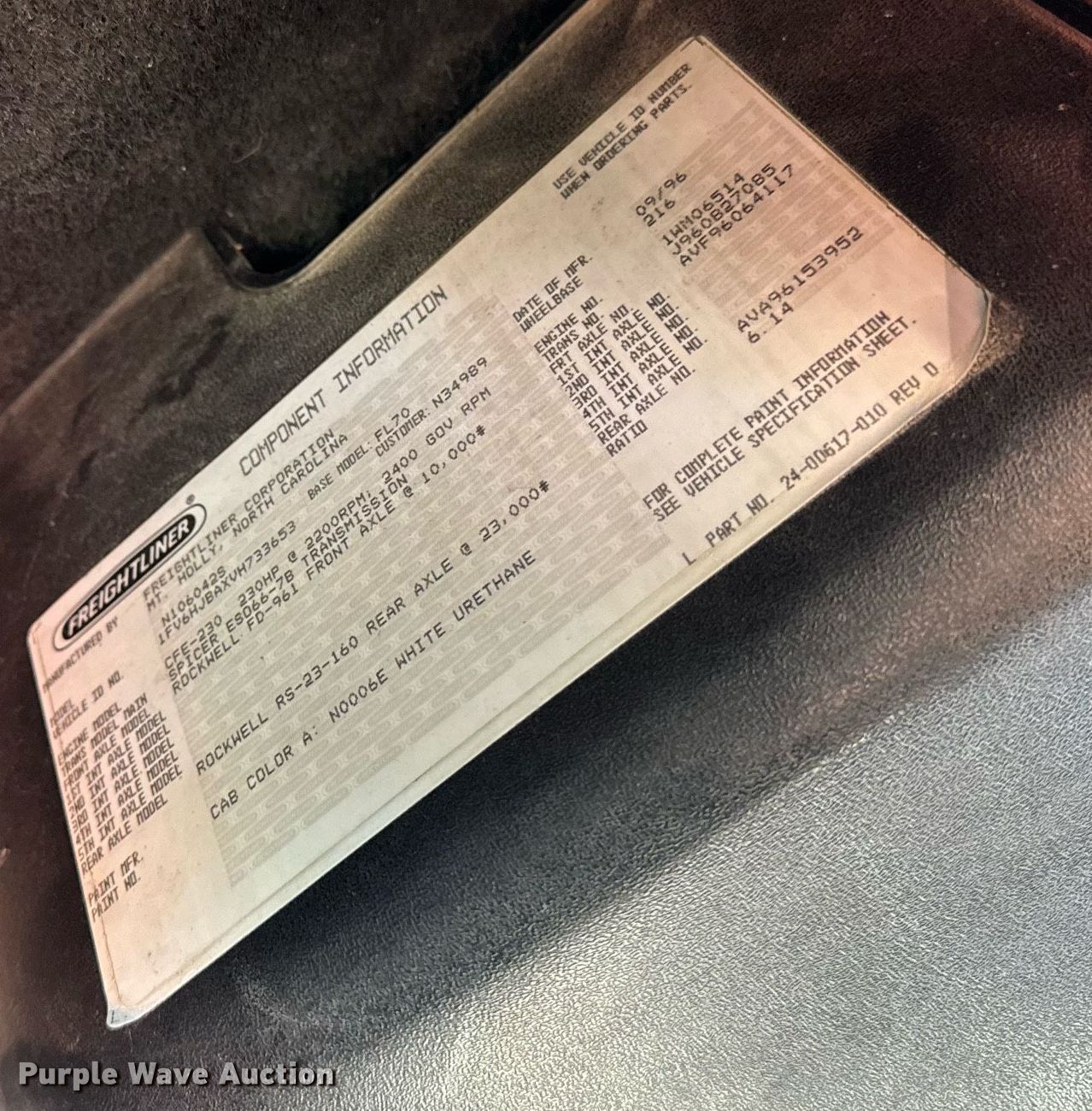 1997 Freightliner FL70 dump flatbed truck. Miles: 72,653 on odometer, Hours: 11,639 on meter, VIN: 1FV6HJBAXVH733653. Engine Caterpillar 3126, Serial: 1WM06514, Displacement: 7.2L, Cylinders: 6, Fuel type: Diesel. Transmission Spicer, Manual, Speed: 7. Chassis Axles: Single, Suspension: Spring, Brakes: Air, PTO, GVWR: 33,000 lbs. Interior Heat, Cruise control. Features Dump flatbed Knaphide, Serial: 946237, 18' 3" L x 96" W, Ram: Single, Removable sides. Tires Size: 11R22.5. Iowa title. Title distribution may be delayed up to 14 days from verification of funds. Hamilton Produce. Bloomfield, IA 52537