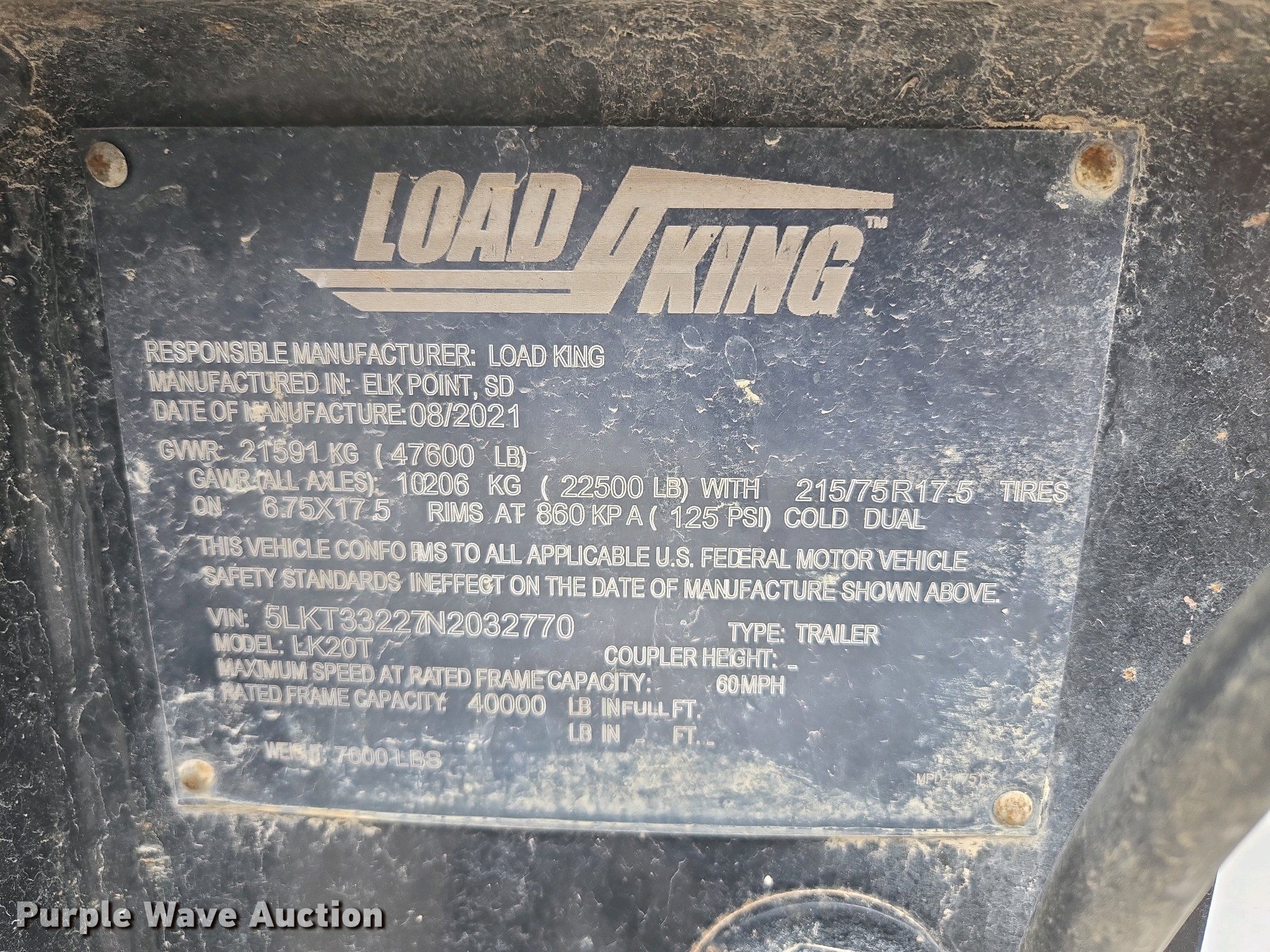 Purple Wave is selling a used Equip. Trailer in Missouri. This item is a 2022 Load King equipment trailer with the following: VIN: 5LKT33227N2032770